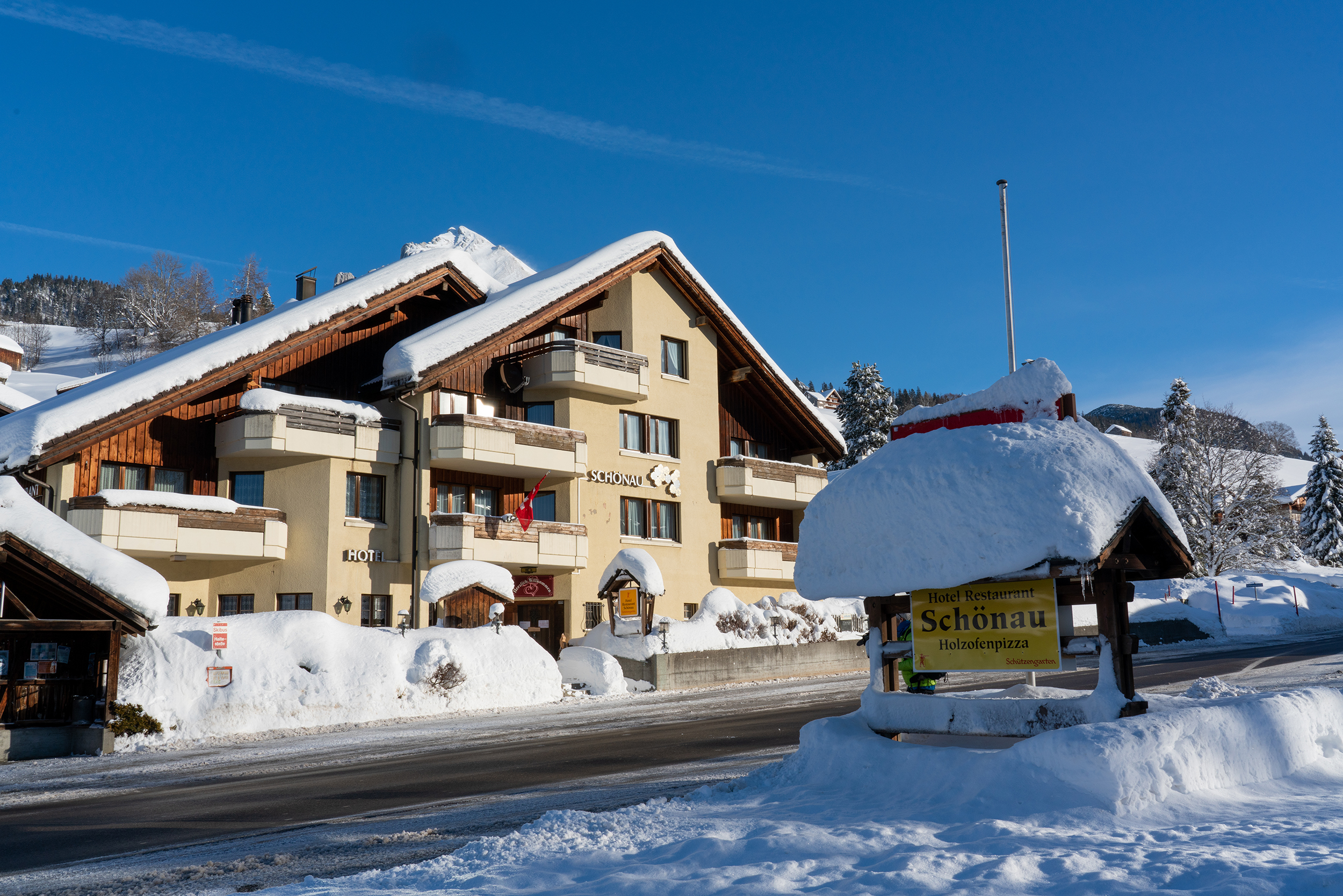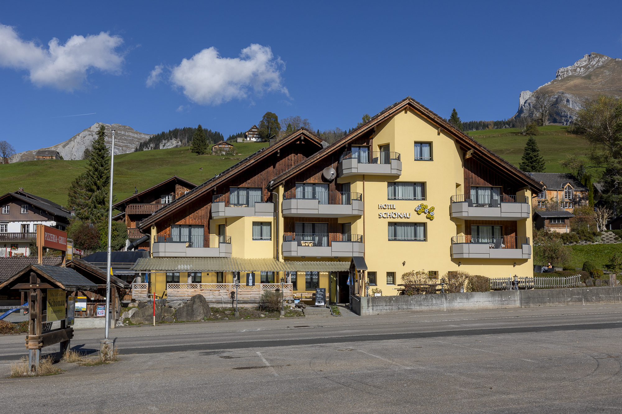 Sonniges Gartenrestaurant. Heimeliges Jägerstübli für diverse persönliche und geschäftliche Anlässe bis zu 20 Personen. Die leistungsfähige Küche bietet nebst preiswerten Tellergerichten auch Grill-, à-la-Carte und zahlreiche Pizza-Spezialitäten. Schöne Hotelzimmer, grosse Appartements alle mit Dusche, WC und TV südseitig mit Blick auf die Churfirsten, nordseitig mit Blick zum Schafberg.
