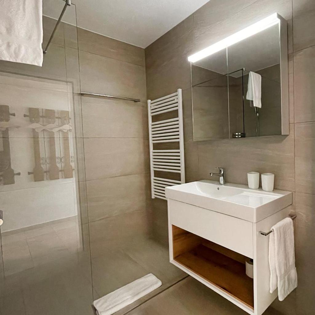 Diese Ferienwohnung mit einem Balkon und Bergblick bietet 1 Schlafzimmer, ein Wohnzimmer, einen TV, eine gut ausgestattete Küche mit einem Kühlschrank und einem Geschirrspüler sowie 2 Badezimmer mit einer Dusche.