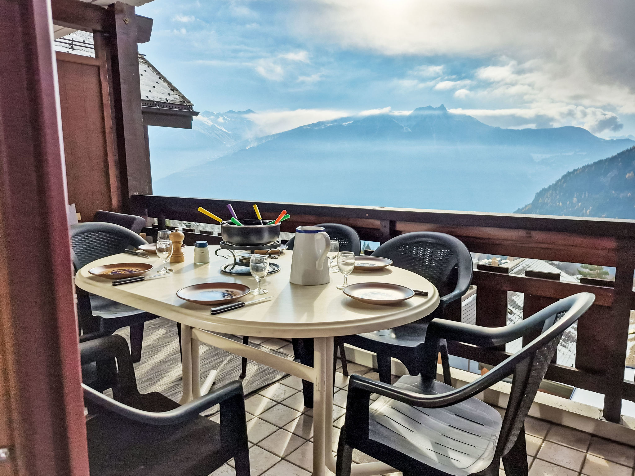 "Les Thermalies 202", 3-Zimmer-Wohnung 79 m2 auf 2 Stockwerken im 2. Stock, Südlage. Hell, teilweise renoviert im Jahre 2025, komfortabel und geschmackvoll eingerichtet: Wohn-/Esszimmer mit Kabel-TV. Ausgang zum Balkon. Offene Küche (Backofen, Geschirrspüler, 4 Glaskeramikplatten, Toaster, Wasserkocher, elektrische Kaffeemaschine, Kapseln für die Kaffeemaschine (Nespresso) extra, Racletteofen, Fondue Set (Chinoise, Käse)). Sep. WC. Obergeschoss: 1 abgeschrägtes grosses Zimmer mit 1 franz. Bett (180 cm, Länge 200 cm). Ausgang zum Balkon. 1 abgeschrägtes Zimmer mit 1 x 2 Etagenbetten (90 cm, Länge 200 cm), 1 franz. Bett (160 cm, Länge 200 cm). Ausgang zum Balkon. Bad/WC. 2 Balkone 15 m2, Südwestlage. Balkonmöbel, Liegestühle (6), Sitzplatz. Herrliche Sicht auf die Berge, das Schwimmbad und den Wald. Zur Verfügung: Bügeleisen, Kinderhochstuhl, Babybett, Haartrockner. Internet (WLAN, gratis). Garage Nr. 202 (1 Auto), Höhe 215 cm, Breite 250 cm. Bitte beachten: geeignet für Familien. Kühlschrank ohne Gefrierfach, Nichtraucher-Unterkunft.