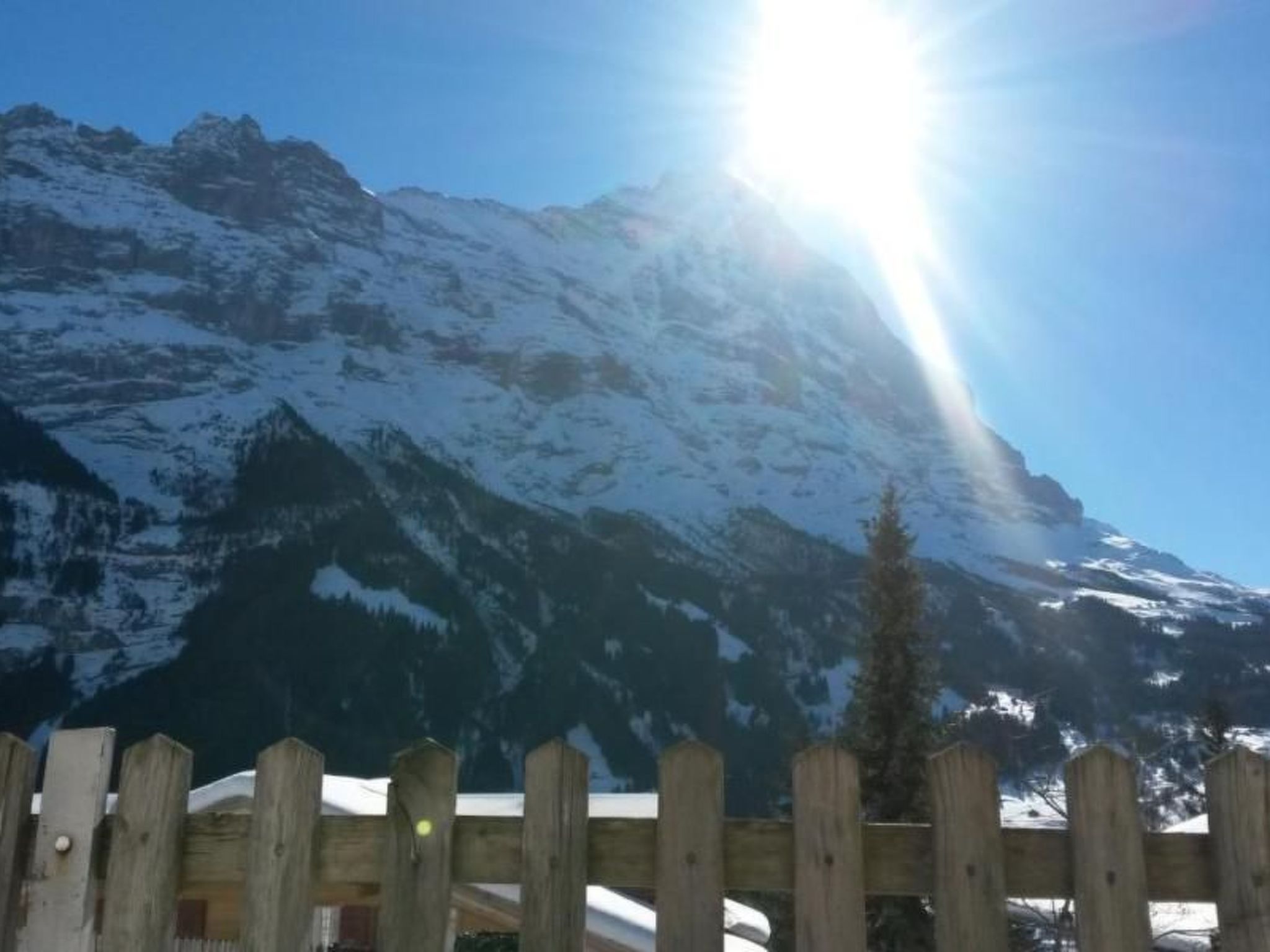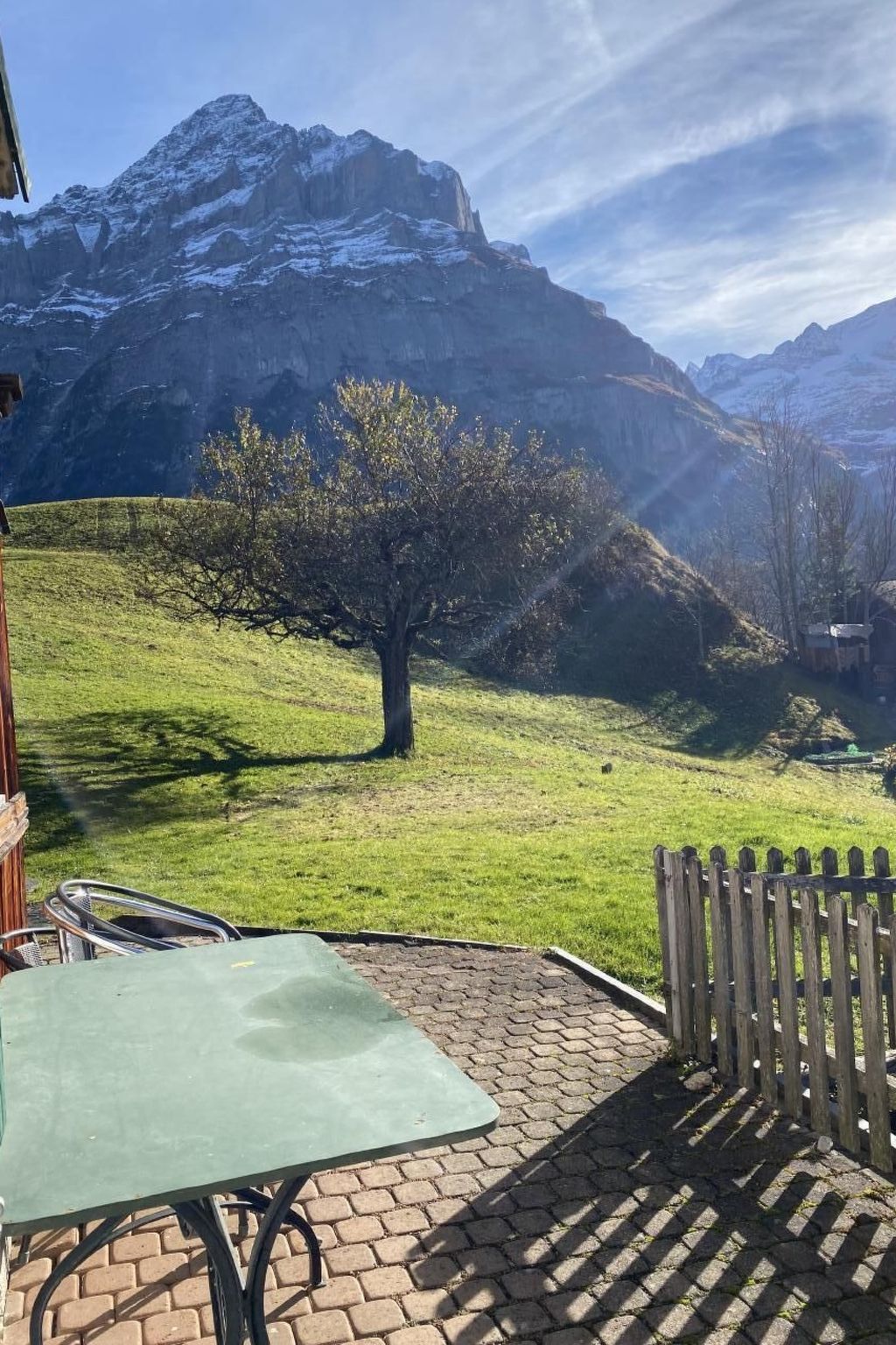 Der Außenbereich lädt mit einer Terrasse zum Verweilen ein, von wo aus man einen panoramischen Blick auf die imposanten Berge wie den Eiger und das Wetterhorn genießen kann. Neben der Wohnung im Erdgeschoss steht den Gästen auch ein Parkplatz zur Verfügung. Es ist zu beachten, dass die Terrasse und der Parkplatz die einzigen gemeinschaftlich nutzbaren Bereiche sind, wobei die restlichen Außenbereiche des Hauses privat sind.