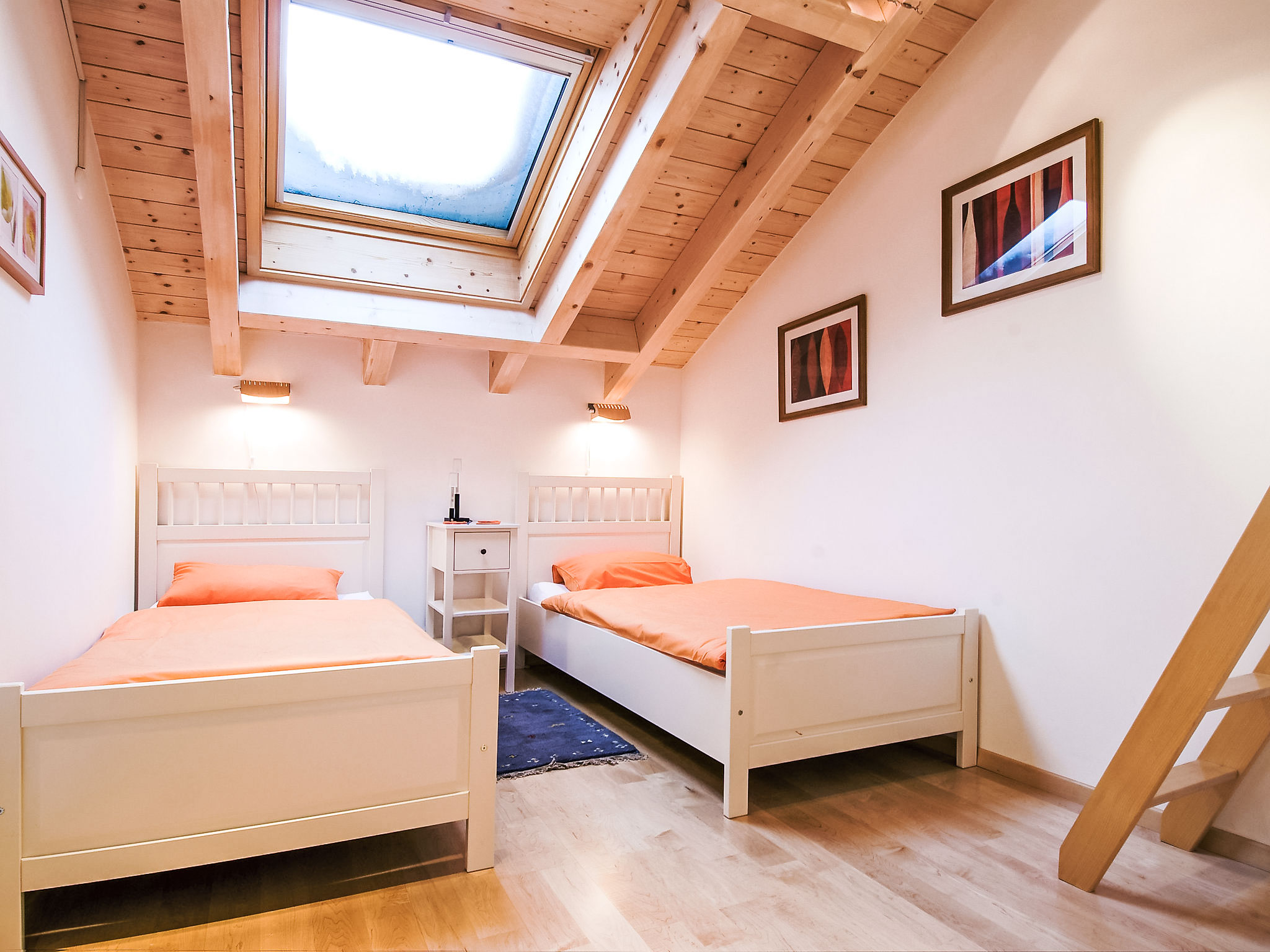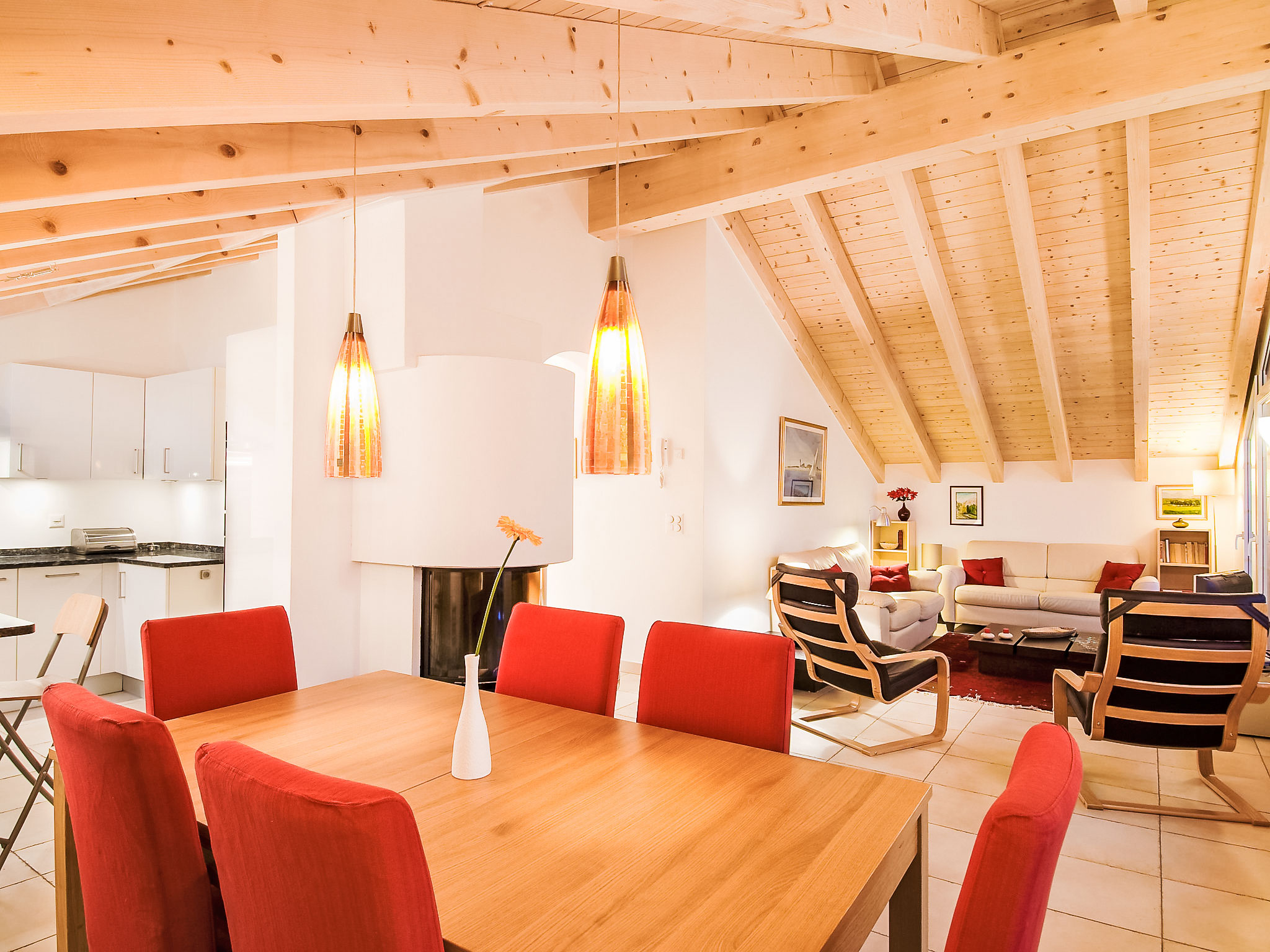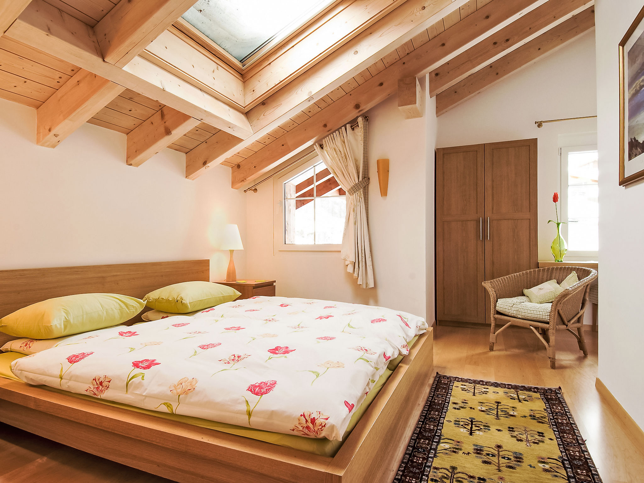 4-Zimmer-Attikawohnung 119 m2, im Dachgeschoss, Südlage. Modern und geschmackvoll eingerichtet: grosses Wohn-/Esszimmer mit Schwedenofen, Esstisch, Kabel-TV, Flachbildschirm, Radio, CD und DVD. Ausgang zum Balkon. 1 Doppelzimmer mit 1 Doppelbett (1 x 160 cm, Länge 200 cm). 2 Zimmer, jedes Zimmer mit 2 Betten (90 cm, Länge 200 cm). Grosse, offene Küche (Backofen, Geschirrspüler, 4 Glaskeramikplatten, Toaster, Wasserkocher, Mikrowelle, Tiefkühler, elektrische Kaffeemaschine, Racletteofen, Fondue Set (Chinoise, Käse)). Bad/WC, Dusche/WC. Bodenheizung. Balkon 13 m2, Südlage. Balkonmöbel. Sehr schöne Panoramasicht auf das Matterhorn. Zur Verfügung: Haartrockner. Internet (Wireless LAN, gratis). Bitte beachten: Nichtraucher-Unterkunft.