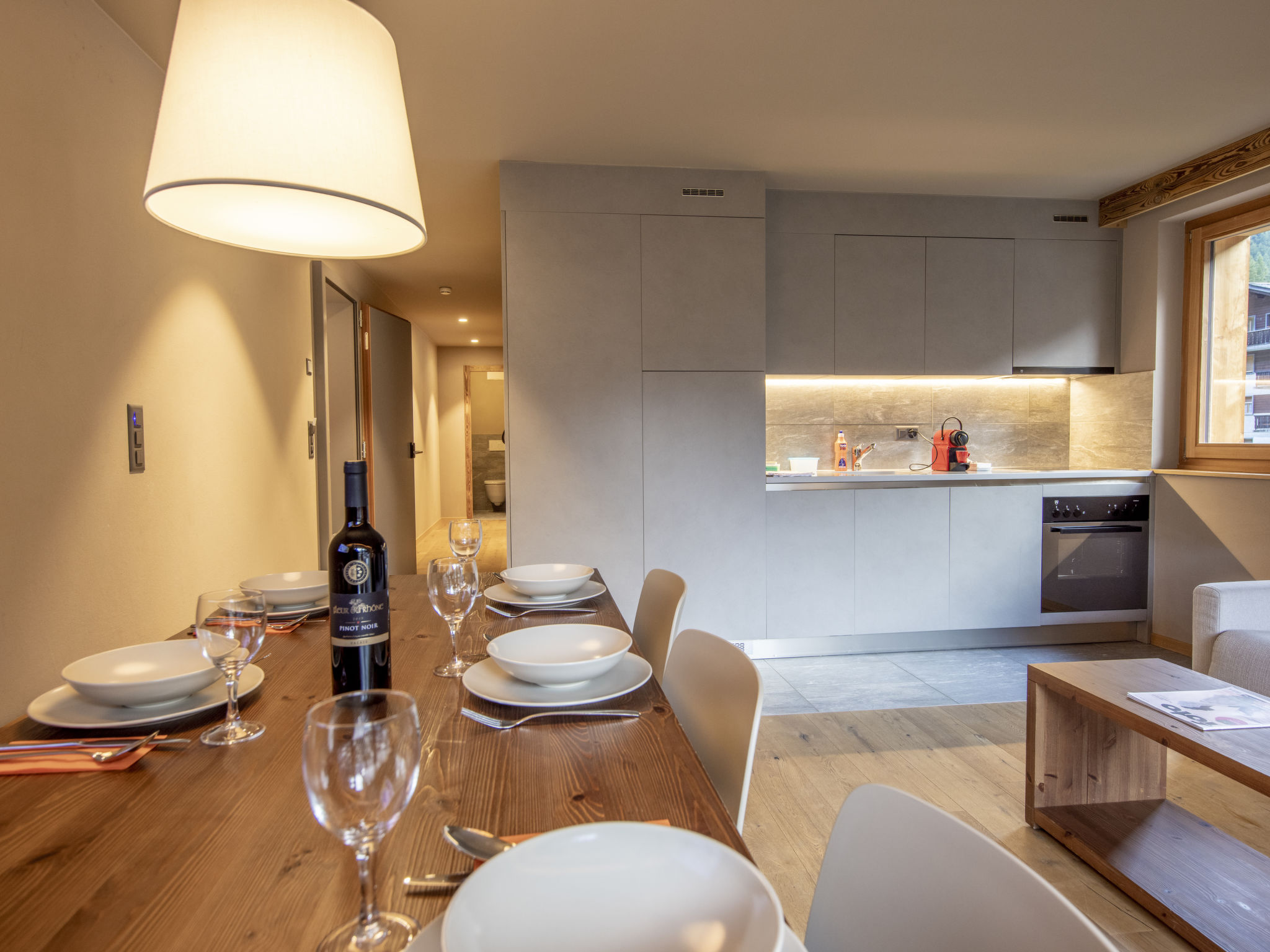 "3 room apartment SOUTH BALCONY", 3-Zimmer-Wohnung 54 m2, Südlage. Komfortabel und gemütlich eingerichtet: Wohn-/Esszimmer mit 1 Doppeldiwanbett, Esstisch, Internationale TV-Sender und Flachbildschirm. Ausgang zum Balkon, zur Terrasse. 2 Zimmer, jedes Zimmer mit 1 Doppelbett (2 x 90 cm, Länge 210 cm). Offene Küche (Backofen, Geschirrspüler, 4 Glaskeramikplatten, elektrische Kaffeemaschine, Kapseln für die Kaffeemaschine (Nespresso) extra, Racletteofen, Fondue Set (Chinoise, Käse)). Dusche/WC, sep. WC. Fussbodenheizung. Parkettboden. Balkon 7 m2, Südlage oder Terrasse 8 m2, Südlage. Terrassenmöbel, Balkonmöbel. Zur Verfügung: Haartrockner. Internet (WLAN, gratis). Bitte beachten: Nichtraucher-Haus. Maximal 1 Haustier/Hund erlaubt. Rauchmelder. Beim Mietobjekt handelt es sich um ein Typenhaus bzw. Um eine Typenwohnung. Das Fondue Set (Fleisch oder Käse) sowie ein Raclette Ofen kann an der Rezeption gegen ein Depot ausgeliehen werden.