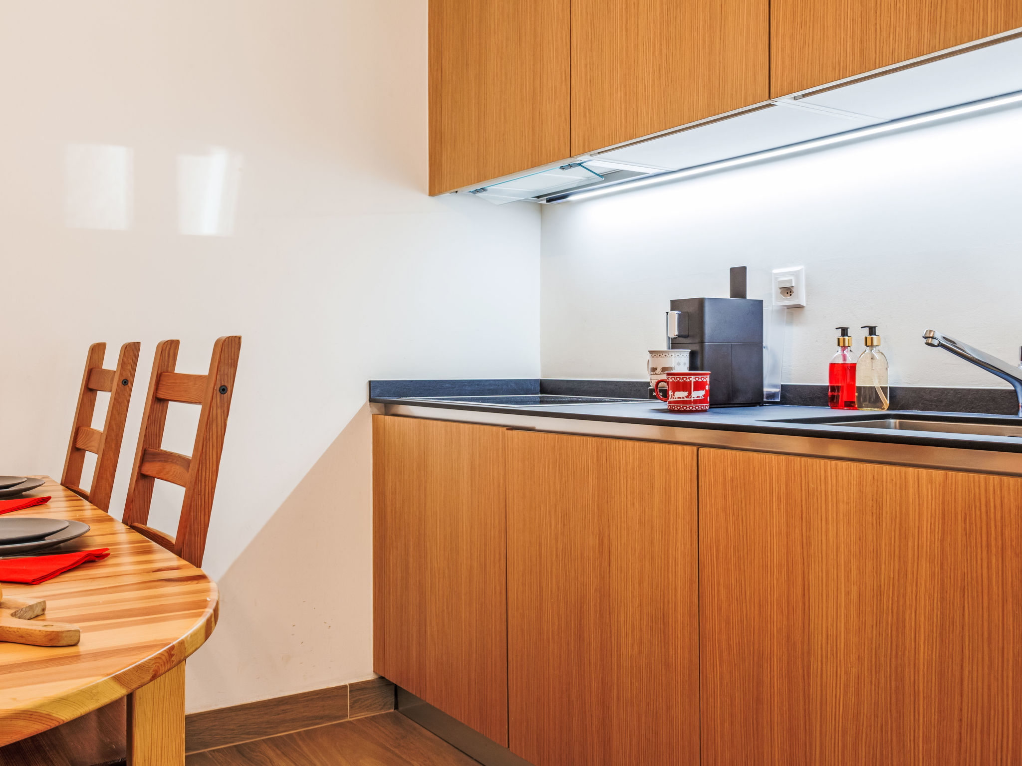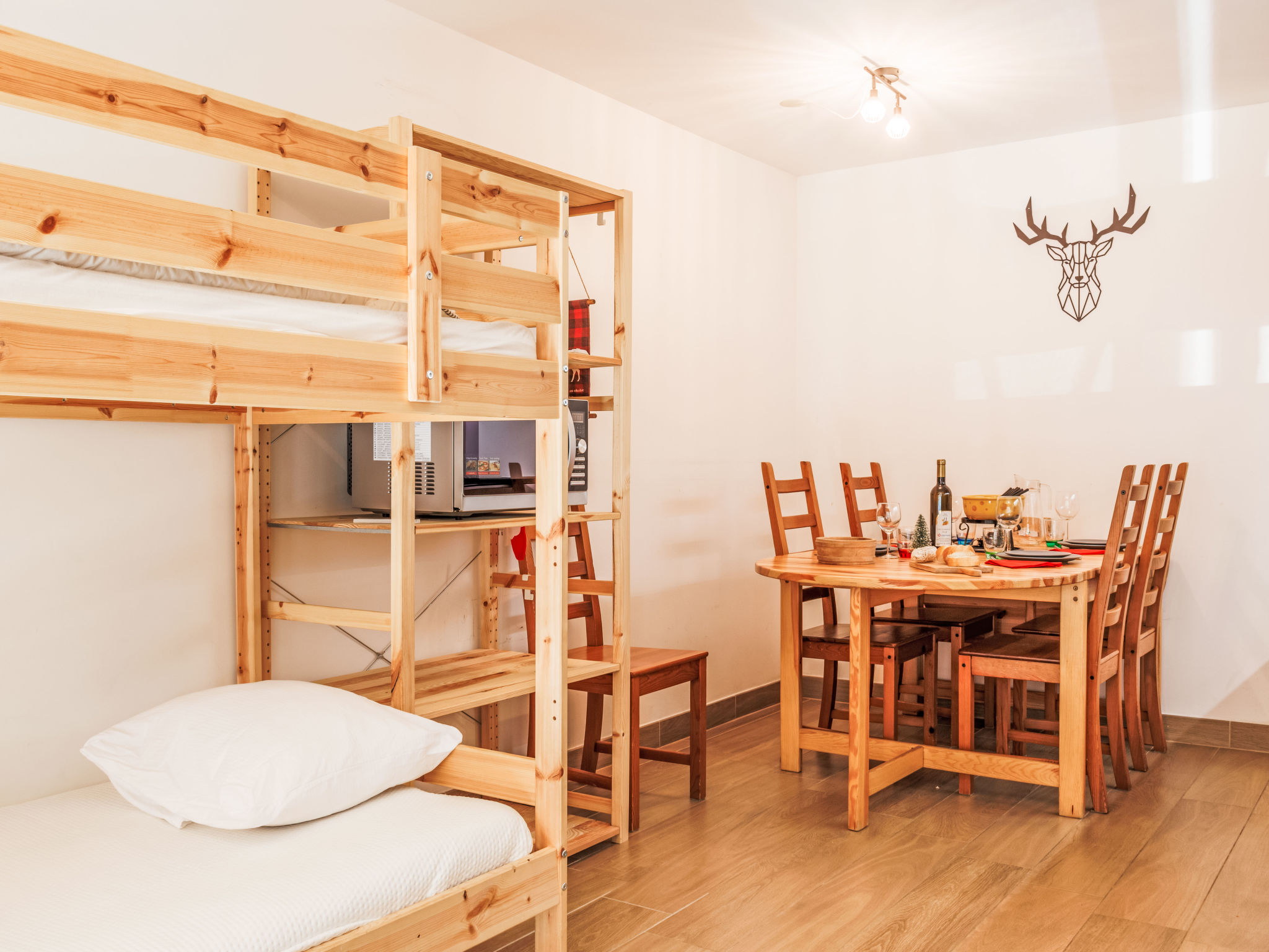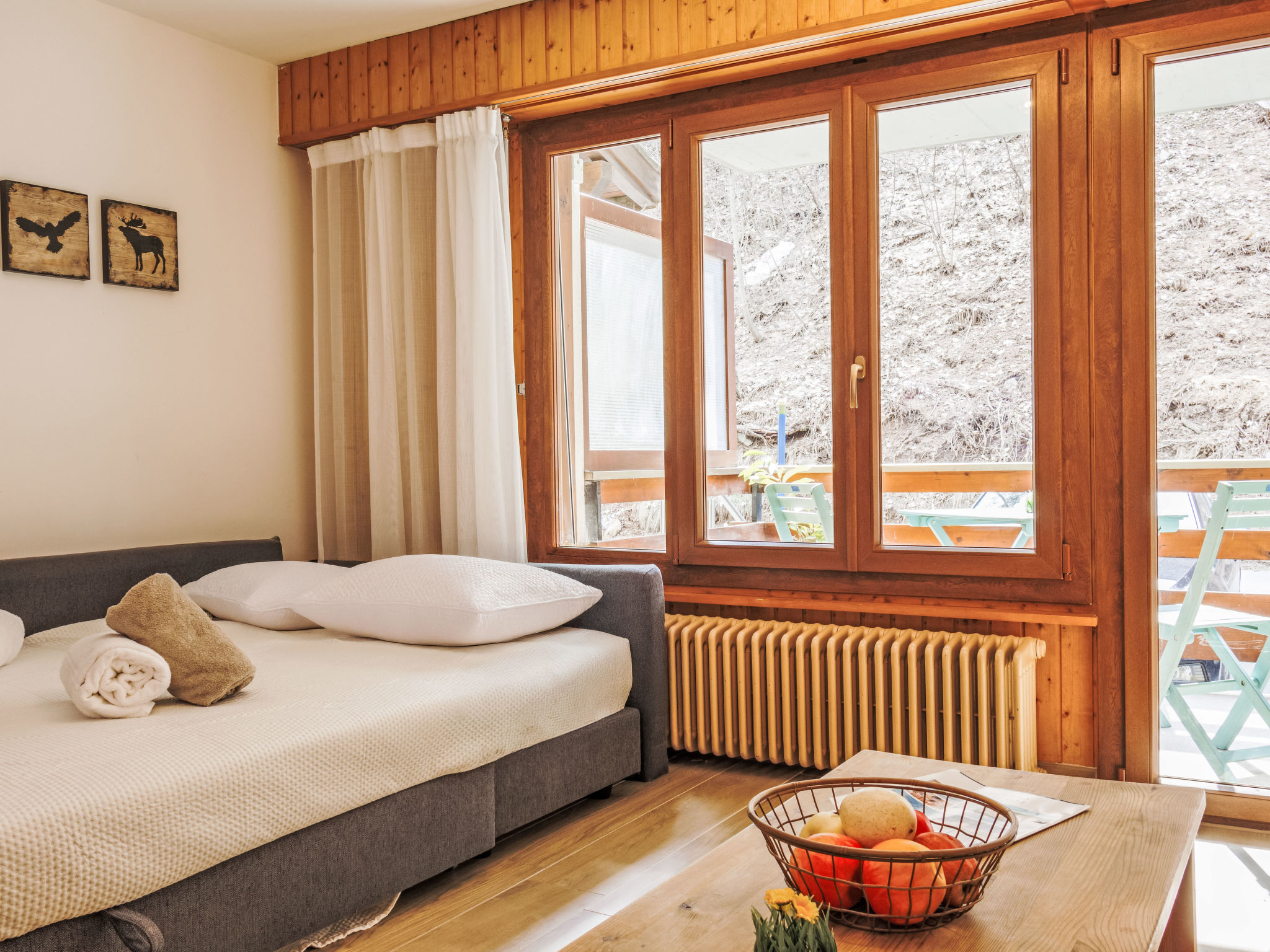 "Quille du Diable 4", 1-Zimmer-Studio 26 m2, im Erdgeschoss. Objekt geeignet für 2 Erwachsene + 1 Kind. Renoviert im Jahre 2021, zweckmässig eingerichtet: Wohn-/Schlafzimmer mit 1 Bett (90 cm, Länge 190 cm), 1 Diwanbett (140 cm, Länge 200 cm), Kabel-TV. Ausgang zum Balkon, Richtung Süden. Kleine, offene Küche (4 Glaskeramikplatten, elektrische Kaffeemaschine, Kapseln für die Kaffeemaschine (delizio) extra, Racletteofen, Fondue Set (Käse)) mit Essecke. Dusche/WC. Balkon, Südlage. Balkonmöbel. Keine Sicht. Zur Verfügung: Haartrockner. Internet (Wireless LAN, gratis). Bitte beachten: Nichtraucher-Unterkunft.