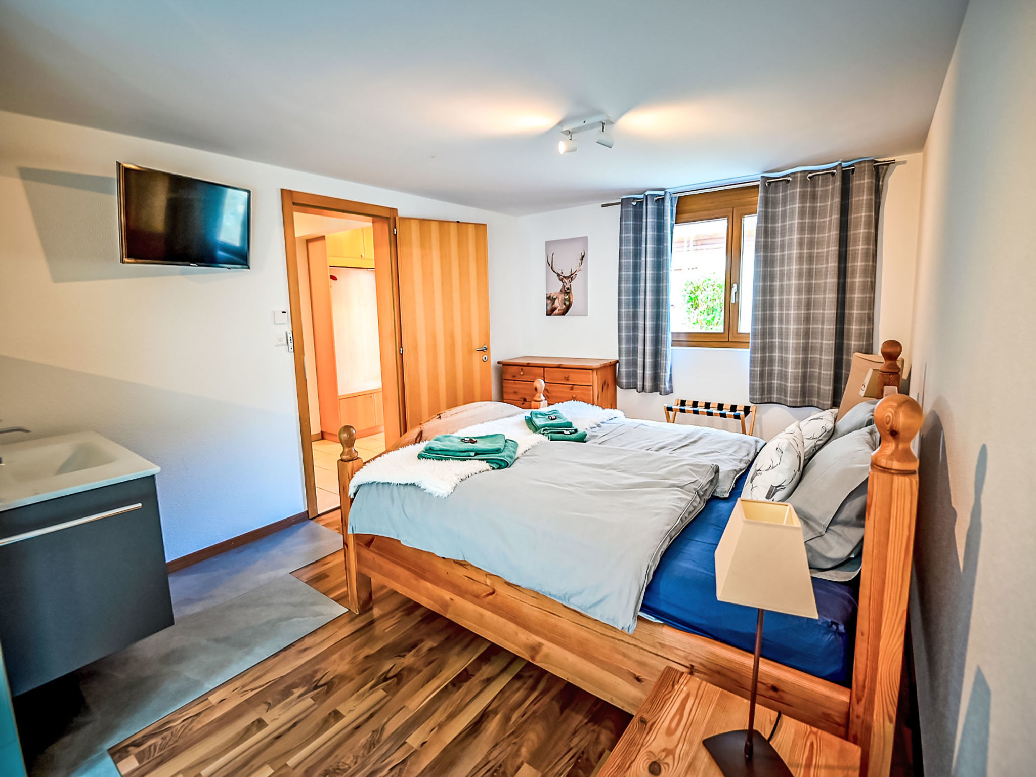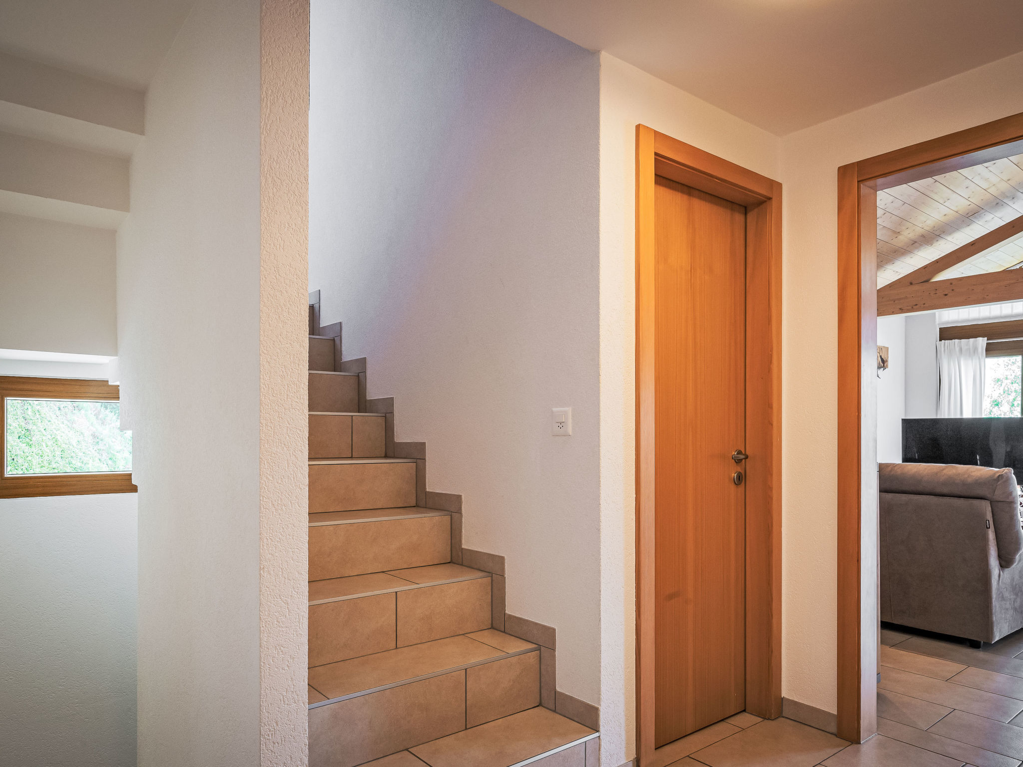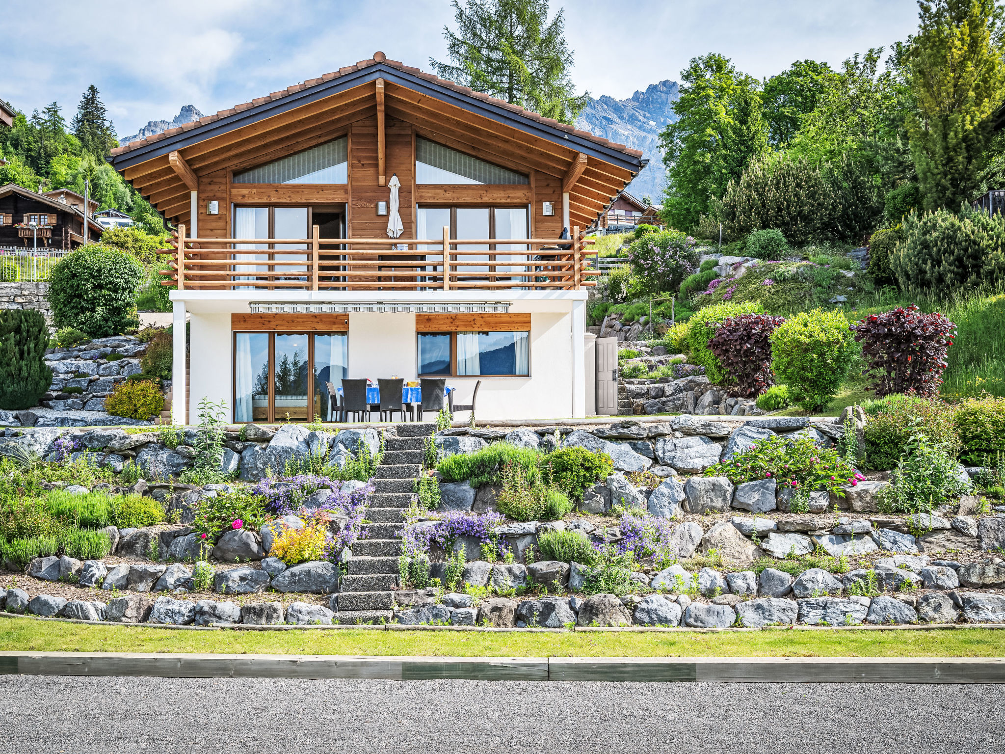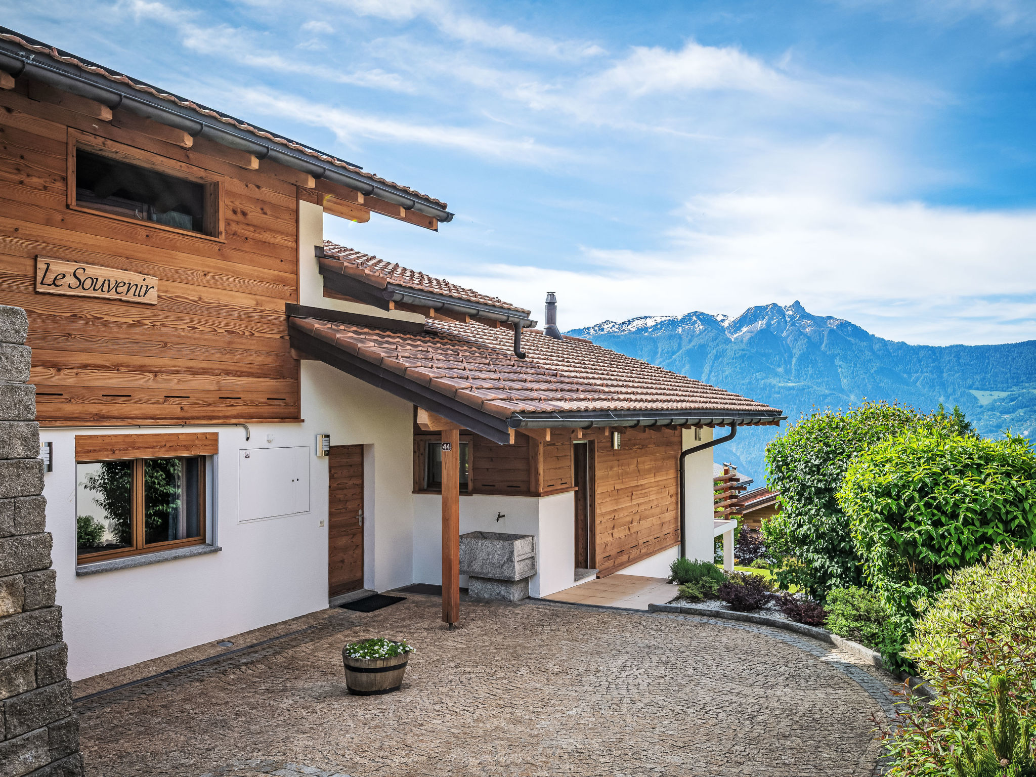 "Le Souvenir", 5-Zimmer-Chalet 168 m2 auf 3 Stockwerken, Südlage. Objekt geeignet für 8 Erwachsene + 2 Kinder. Geräumig und hell, teilweise renoviert im Jahre 2022, schön und geschmackvoll eingerichtet: grosses Wohn-/Esszimmer mit Schwedenofen und Kabel-TV. Ausgang zum Balkon. 1 grosses Zimmer mit 1 franz. Bett (160 cm, Länge 200 cm), Bad/Dusche und TV. Offene Küche (Backofen, Geschirrspüler, 4 Induktionskochplatten, Toaster, Wasserkocher, Mikrowelle, Tiefkühler, elektrische Kaffeemaschine, Kapseln für die Kaffeemaschine (Nespresso) extra, Dampfgarer, Racletteofen, Fondue Set (Käse)). Ausgang zur Terrasse. Sep. WC. Unteres Geschoss: 1 kleines Zimmer mit 1 x 2 Etagenbetten (90 cm, Länge 200 cm). 1 grosses Zimmer mit 1 franz. Bett (160 cm, Länge 200 cm), Kabel-TV. 1 Zimmer mit 1 Diwanbett (140 cm, Länge 190 cm), 1 franz. Bett (160 cm, Länge 200 cm). Ausgang zum Garten, zur Terrasse. Bad/WC, Dusche/WC, sep. WC. Obergeschoss: Gepäckraum. Balkon, Südlage, grosse Terrasse, Südlage, kleine Terrasse, Westlage, grosser Garten, Südlage. Terrassenmöbel, Gartengrill (mobil). Sehr schöne Panoramasicht auf die Berge, das Tal und die Landschaft. Zur Verfügung: Waschmaschine, Wäschetrockner, Bügeleisen, Babybett bis 2 Jahre, Haartrockner. Internet (WLAN, gratis). Parkplatz (3 Autos), Garage (2 Autos), Höhe 228 cm, Breite 520 cm. Bitte beachten: Nichtraucher-Haus. Maximal 1 Haustier/Hund erlaubt.