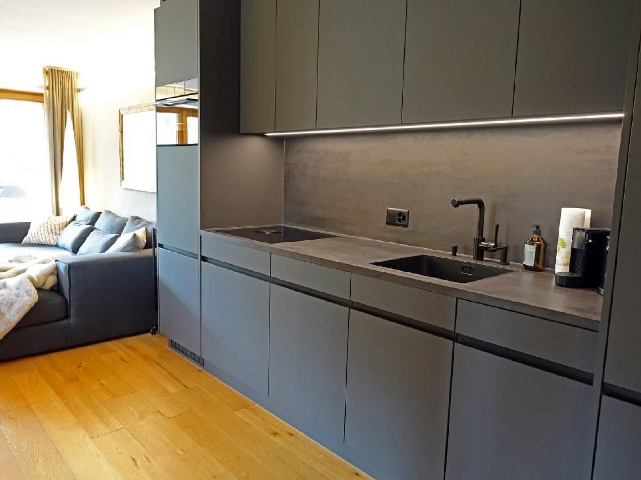In der Wohnung erwartet Sie eine sorgfältig ausgewählte Innenausstattung, die keine Wünsche offen lässt. Das Schlafzimmer ist mit einem komfortablen King-Size Bett und einem eingebauten Schrank ausgestattet, während das zweite Schlafzimmer ein praktisches Hochbett bietet. Das Herzstück bildet das Wohnzimmer mit einem gemütlichen Sofa und Beistelltisch, einem 75-Zoll Flachbild-TV, einem Cheminée sowie einem Esstisch mit Sitzbank und Stühlen. Die offene Küche ist voll ausgestattet mit Geschirrspüler, Kühlschrank, Mikrowelle & Steamer-Ofen sowie einem Induktionsherd. Das Badezimmer bietet eine Regendusche, Föhn und Bademantel für zusätzlichen Komfort.