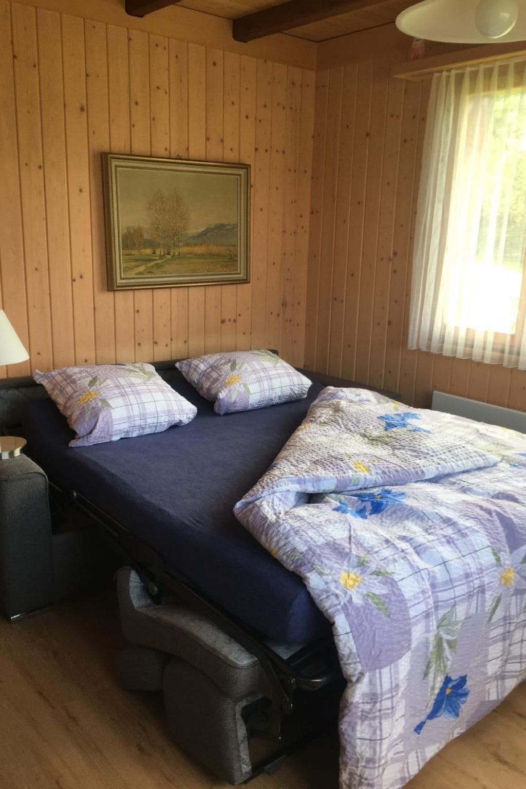 Im Inneren des Ferienhauses erwartet Sie eine liebevoll gestaltete Ausstattung, die gemütliches Wohnen in einem rustikalen Ambiente verspricht. Das Dachzimmer im 2. Stock beherbergt zwei Einzelbetten und ist über eine steile Treppe erreichbar; bei Bedarf kann der Schlafplatz um zwei weitere Betten erweitert werden. Im Wohnzimmer sorgt ein ausziehbares Bettsofa für zusätzliche Schlafmöglichkeiten. Die Küche ist voll ausgestattet mit modernen Annehmlichkeiten wie Geschirrspüler, Backofen/Steamer und einem 4er-Kochfeld. Ein weiteres Highlight ist das Badezimmer mit Fenster, das neben einer Dusche mit verschiebbarer Duschwand auch über einen Spiegelschrank und einen Haarföhn verfügt.