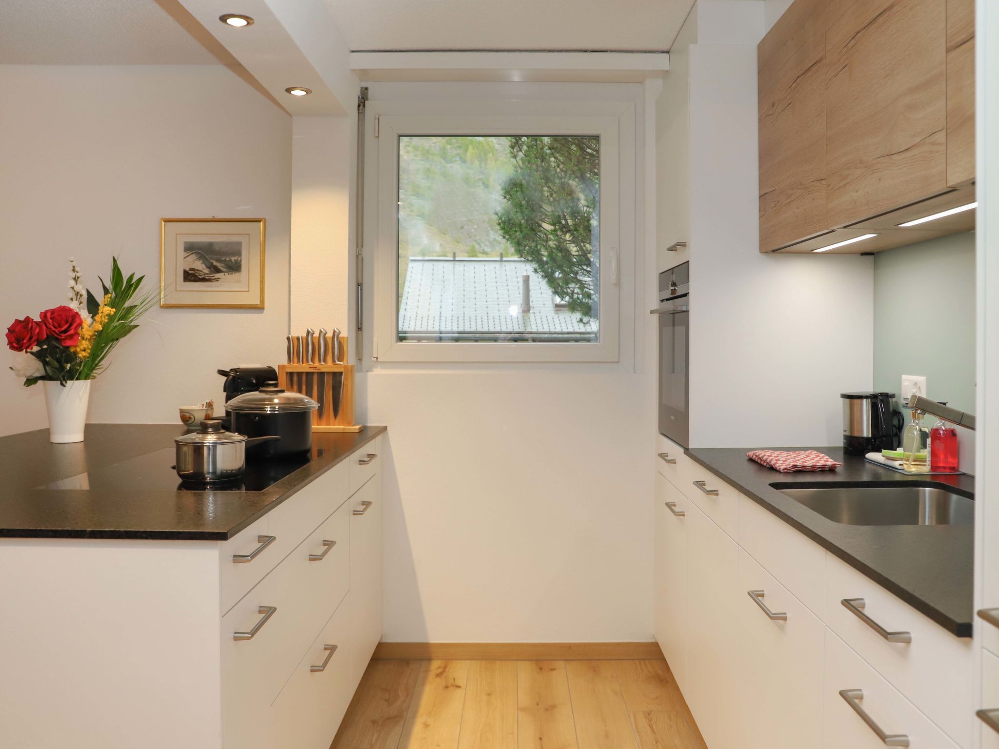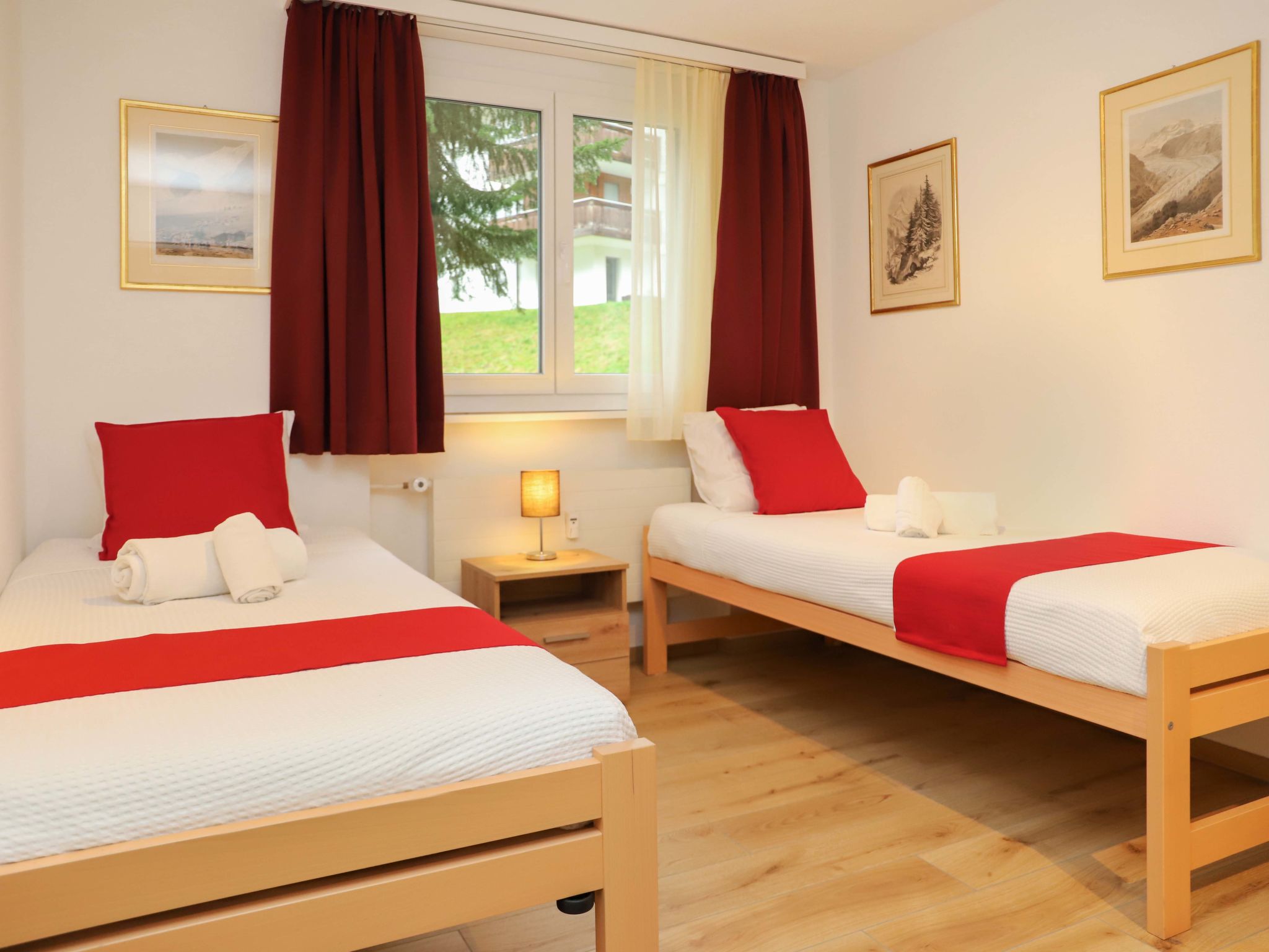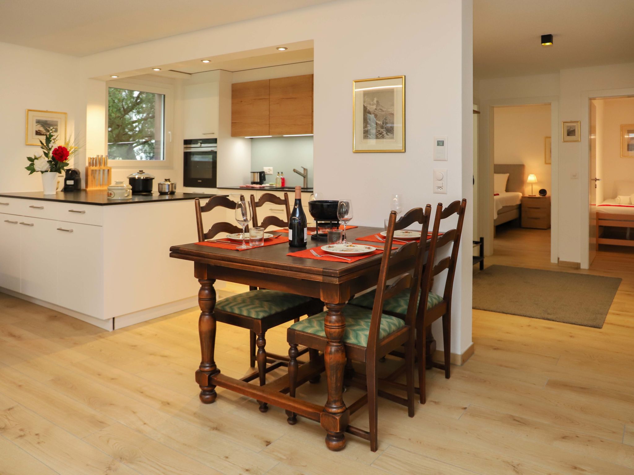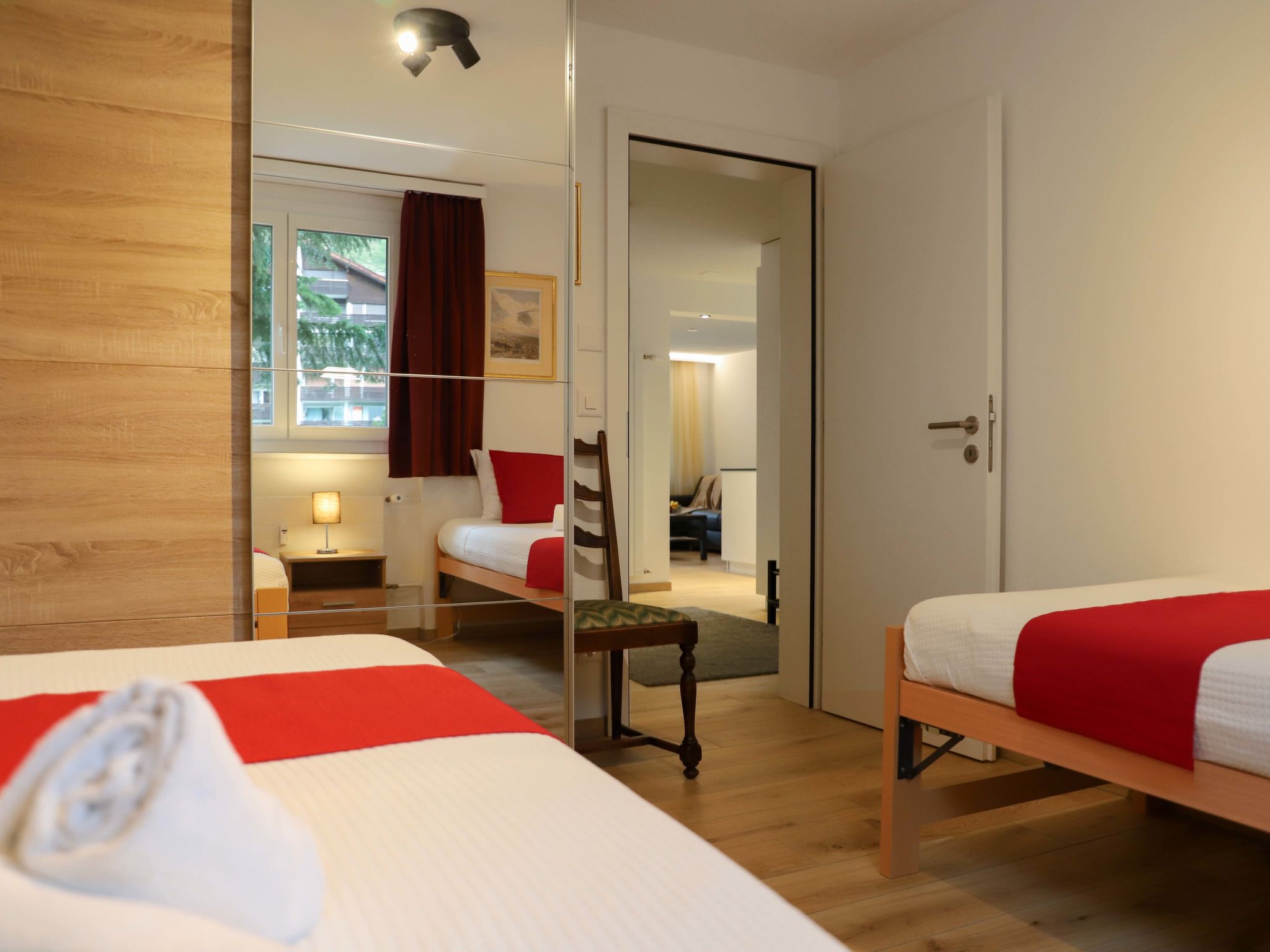 "Grillon", 3-Zimmer-Wohnung 90 m2, im Erdgeschoss, Südlage. Hell, vollständig renoviert im Jahre 2022, schön und modern eingerichtet: offenes Wohn-/Esszimmer mit Esstisch und TV. Ausgang zum Balkon, Richtung Süden. 1 Doppelzimmer mit 1 Doppelbett (1 x 180 cm, Länge 200 cm). 1 Zimmer mit 2 Betten (90 cm, Länge 200 cm). Offene Küche (Backofen, Geschirrspüler, 4 Induktionskochplatten, Toaster, Wasserkocher, Tiefkühler, elektrische Kaffeemaschine, Kochinsel). Dusche/WC, Doppelwaschbecken. Parkettboden. Balkon, Südlage. Balkonmöbel. Seitliche Sicht auf das Matterhorn. Zur Verfügung: Haartrockner. Internet (Wireless LAN, gratis). Bitte beachten: Nichtraucher-Unterkunft.
