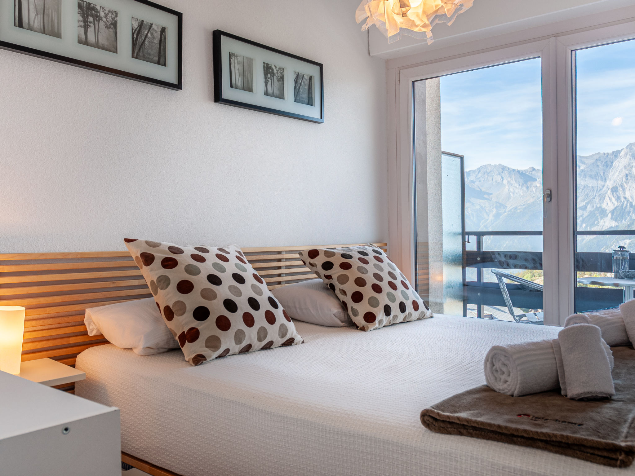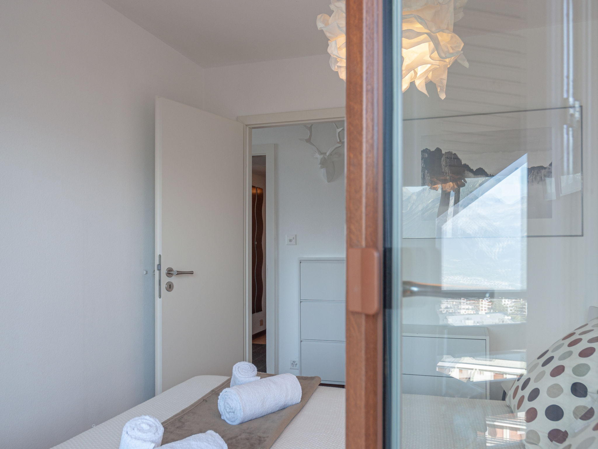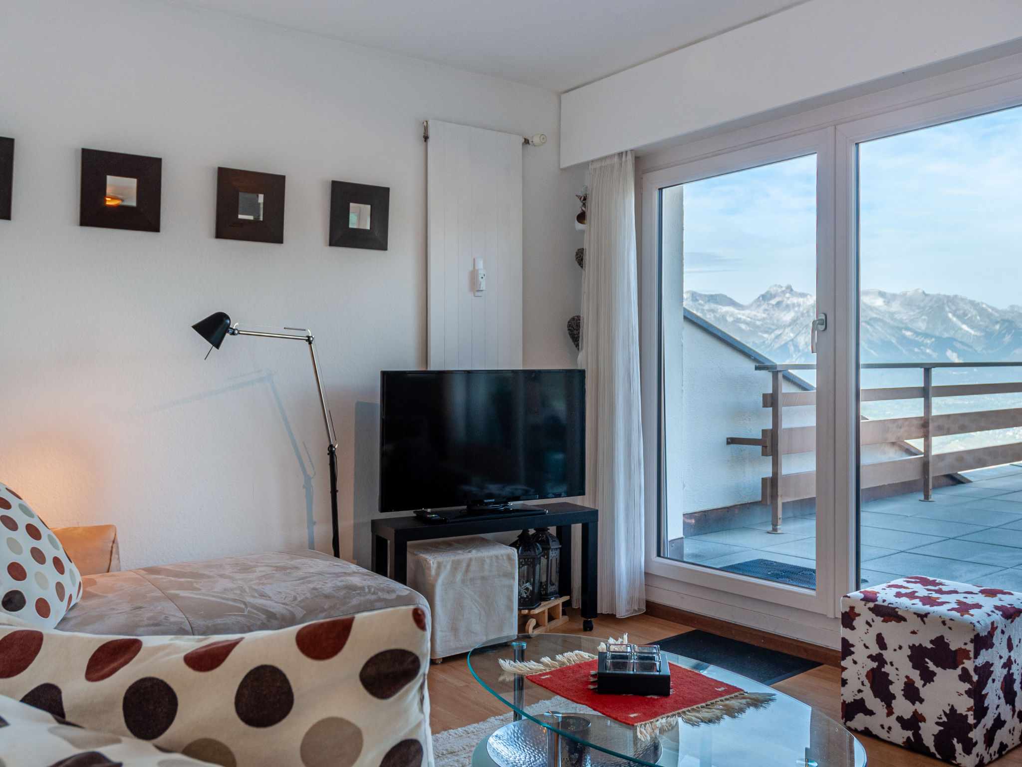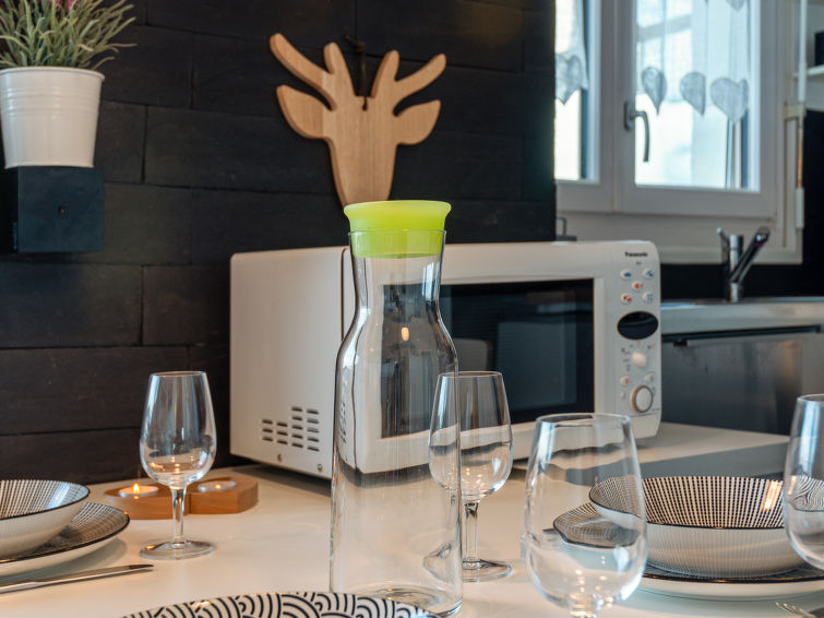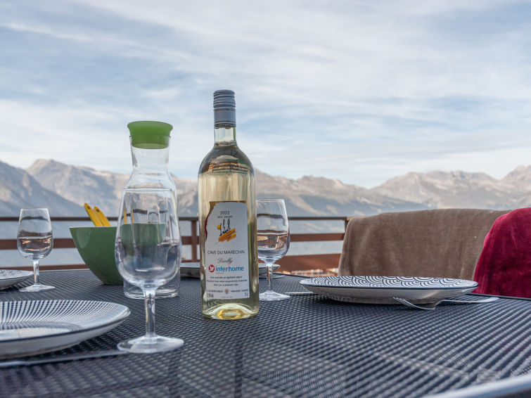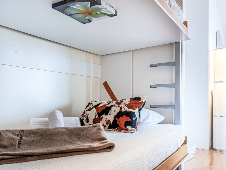 "Olympic C7", 2-Zimmer-Wohnung 38 m2 im 7. Stock, Nordwestlage. Objekt geeignet für 2 Erwachsene + 2 Kinder. Vollständig renoviert im Jahre 2023, komfortabel und schön eingerichtet: Eingang. 1 Zimmer mit 1 franz. Bett (160 cm, Länge 200 cm). Ausgang zum Balkon. Eingang mit 1 x 2 Etagenbetten (90 cm, Länge 190 cm), Kabel-TV. Ausgang zur Terrasse. Offene Küche (Backofen, Geschirrspüler, 4 Glaskeramikplatten, Toaster, Wasserkocher, Mikrowelle, elektrische Kaffeemaschine, Kapseln für die Kaffeemaschine (Nespresso) extra, Racletteofen, Fondue Set (Chinoise, Käse)) mit kleinem Esstisch. Dusche/WC. Kleiner Balkon, Nordlage, grosse Terrasse 35 m2, Westlage. Terrassenmöbel, Balkonmöbel. Sehr schöne Sicht auf die Berge und das Tal. Zur Verfügung: Haartrockner. Internet (Wireless LAN, gratis). Bitte beachten: Nichtraucher-Unterkunft.