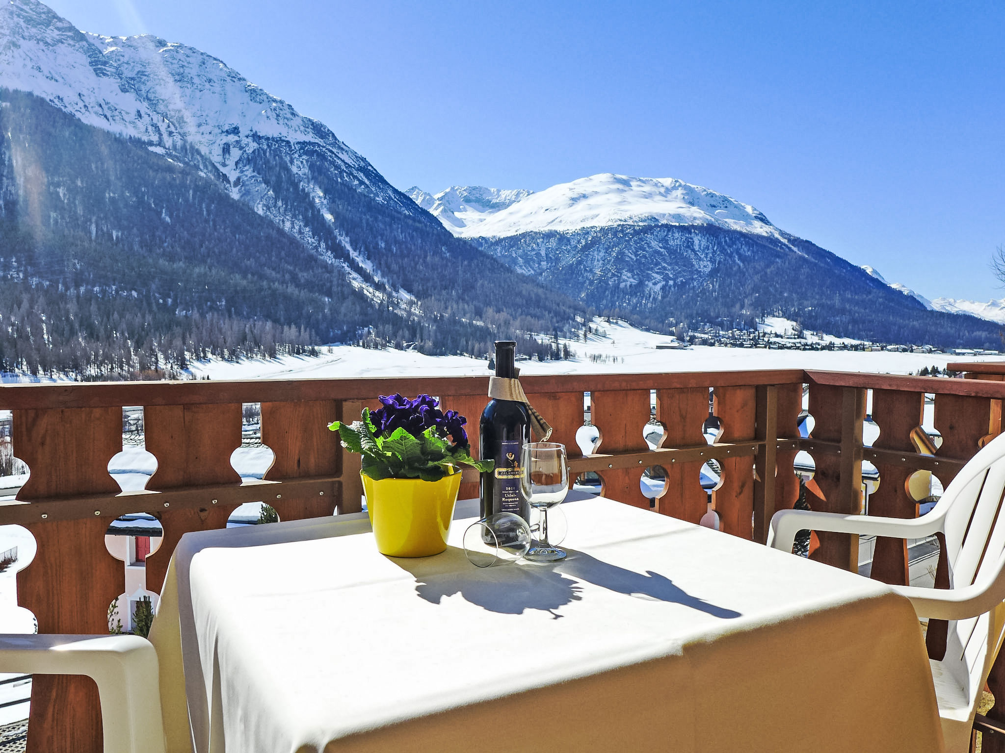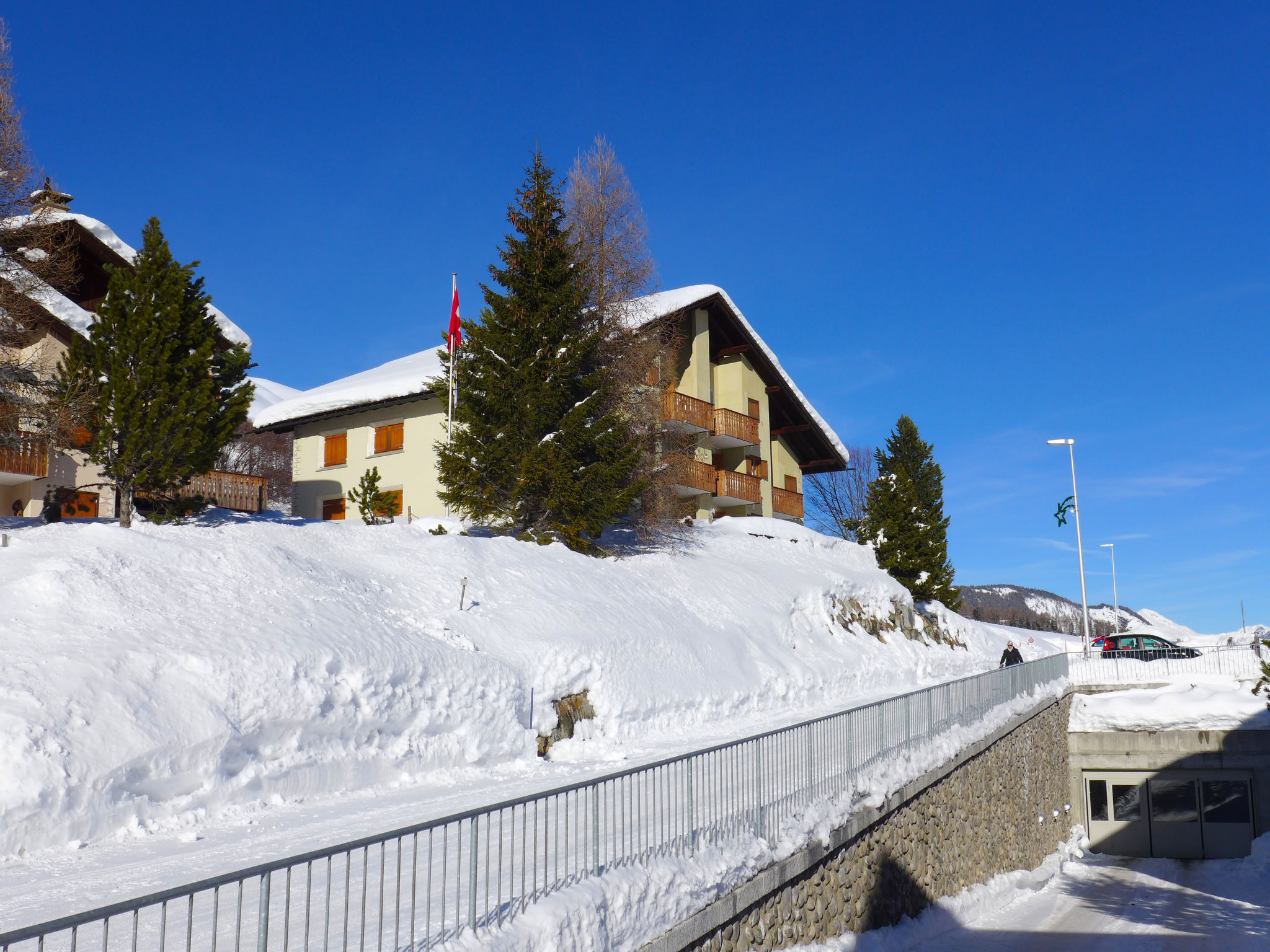 Madulain 15 km von St. Moritz: Freistehendes Mehrfamilienhaus "Chesa Bursella 21". Am Ortsrand, ruhige, sonnige, erhöhte Lage, 15 km vom See. Zur Mitbenutzung: grosser Garten. Im Hause: Zentralheizung. Gemeinschaftsgarage. Einkaufsgeschäft 2.1 km, Lebensmittelgeschäft 2.1 km, Supermarkt 2.1 km, Restaurant 650 m, Bäckerei 2.1 km, Fahrradverleih 2.5 km, Bushaltestelle "Madulain, vih" 850 m, Bahnstation "Madulain" 700 m, Hallenbad 16 km, See St. Moritzer See 15 km. Golfplatz (18 Loch) 4 km, Surfschule 21 km, Tennis 3.5 km, Tennishalle 17 km, Minigolf 16 km, Reitstall 700 m, Wanderwege ab Haus 400 m, Radweg, Luftseilbahn 12.5 km, Skilift 3.3 km, Skipisten 3.3 km, Skiverleih 2.5 km, Skischule 3.2 km, Kinderskischule 3.2 km, Schlittelbahn 3 km, Langlaufloipe 1 km, Eisfeld 3.2 km, Kinderspielplatz 2.4 km. Nahe gelegene Sehenswürdigkeiten: Nationalparkzentrum in Zernez 20 km, Caferama Badilatti 4 km. Bekannte Skigebiete sind gut erreichbar: Zuoz 3.3 km, Corviglia 12.5 km, Diavolezza - Lagalb 26 km. Bekannte Seen in der Umgebung sind gut erreichbar: St. Moritzer See 15 km, Silvaplaner See 21 km, Silser See 27 km. Wandergebiete: Schweizer Nationalpark / Val Trupchun, Albulapass / SAC Es-cha Hütte, Muottas Muragl. Bitte beachten: Be- und Entladen am Ferienhaus möglich.