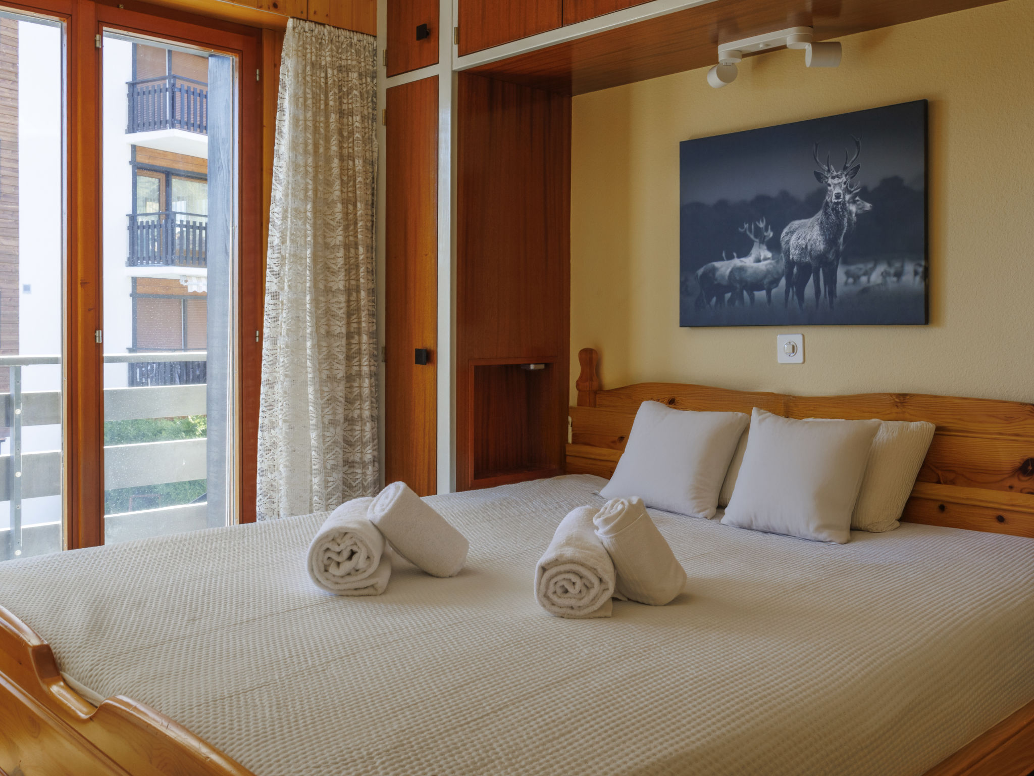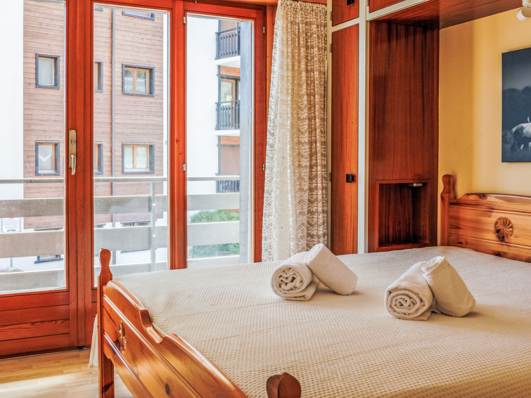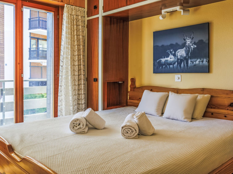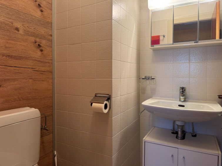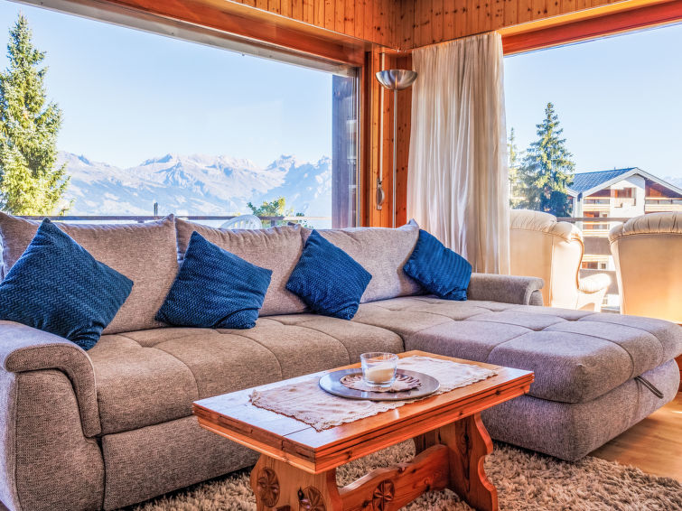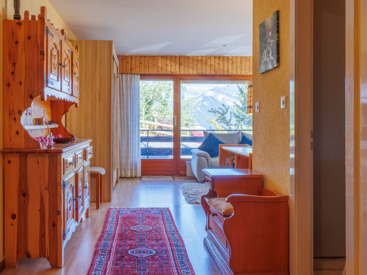 "Aiglon G0", 2-Zimmer-Wohnung 50 m2, im ebenerdigen Untergeschoss, Südostlage. Objekt geeignet für 2 Erwachsene + 2 Kinder. Komfortabel und schön eingerichtet: Eingang mit 2 Wandschrankbetten (90 cm, Länge 200 cm). Wohn-/Esszimmer mit Kabel-TV. Ausgang zum Balkon. 1 Zimmer mit 1 Doppelbett (160 cm, Länge 200 cm). Ausgang zum Balkon, Richtung Osten. Küche (3 Kochplatten, Backofen, Geschirrspüler, Toaster, Wasserkocher, elektrische Kaffeemaschine, Kapseln für die Kaffeemaschine (Dolce Gusto) extra, Racletteofen, Fondue Set (Chinoise, Käse)). Bad/WC. Balkon 25 m2. Balkonmöbel. Sicht auf die Berge und das Tal. Zur Verfügung: Haartrockner. Internet (WLAN, gratis). Bitte beachten: Wohnung auf Parkplatzseite. Nichtraucher-Unterkunft. Anstelle eines abgeschlossenen Schlafzimmers befinden sich manche Schlafplätze in einem offenen Bereich (Galerie, Nische etc.).
