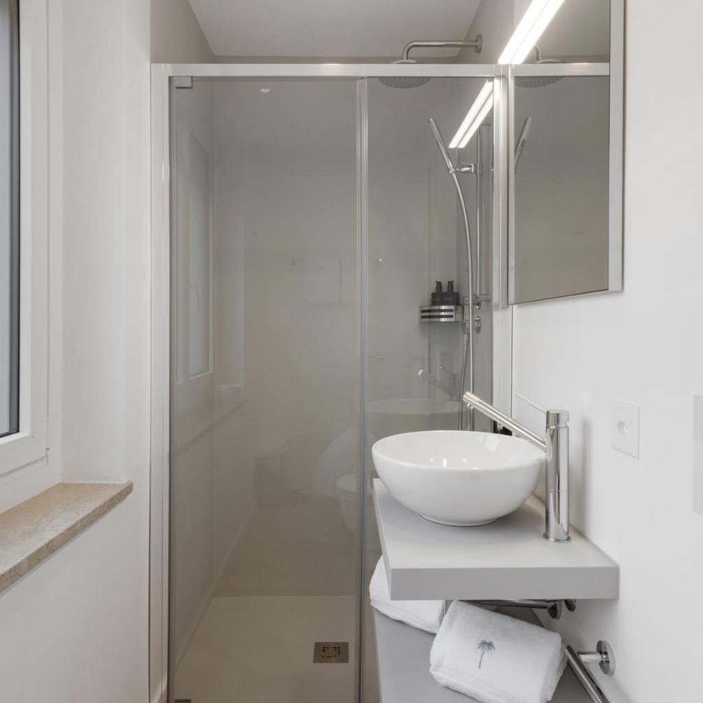 Die Unterkunft Living Ascona Boutique Hotel bietet einen Flachbild-TV sowie ein eigenes Badezimmer mit einem Haartrockner, Hausschuhen und einer Dusche.