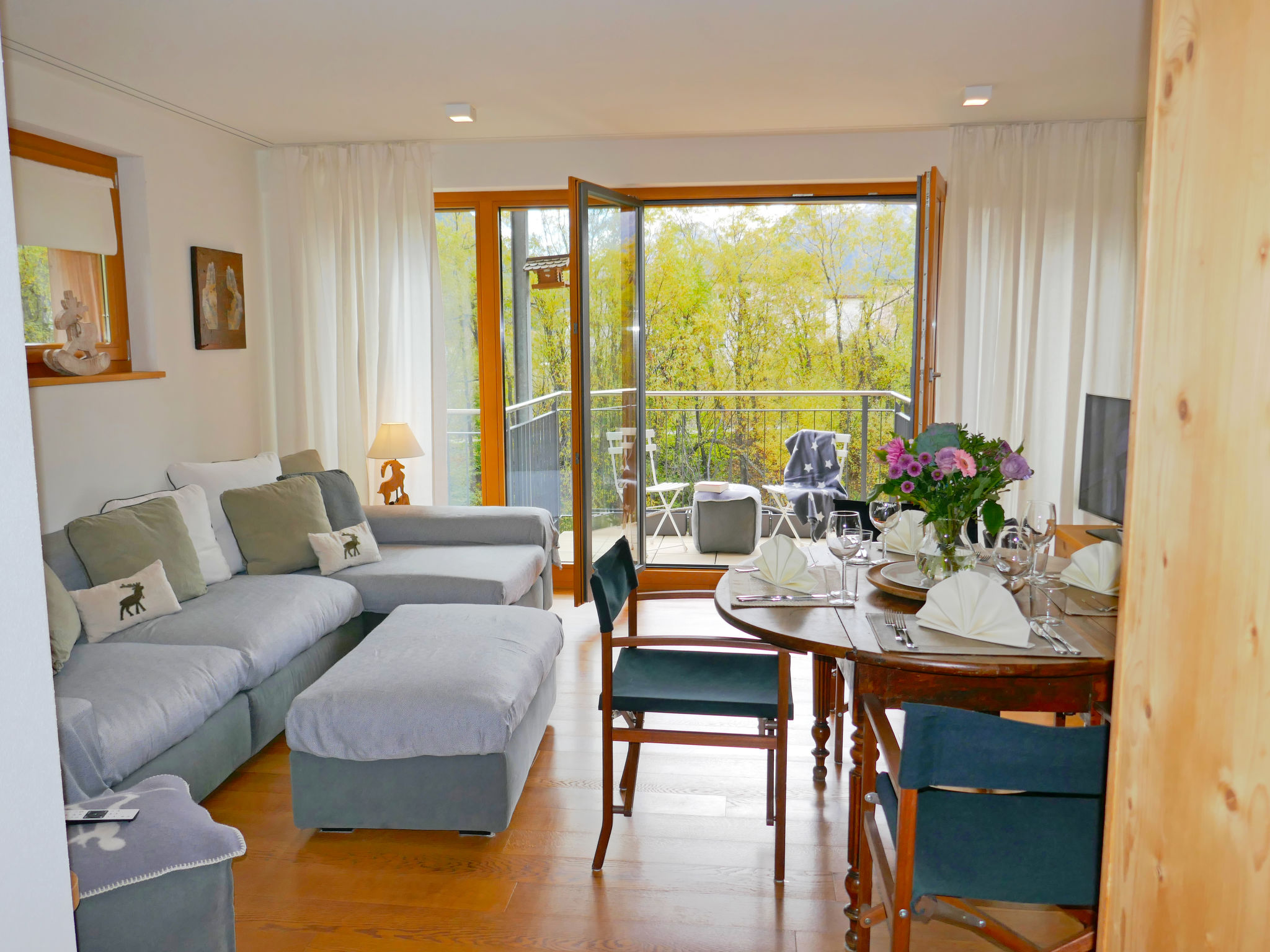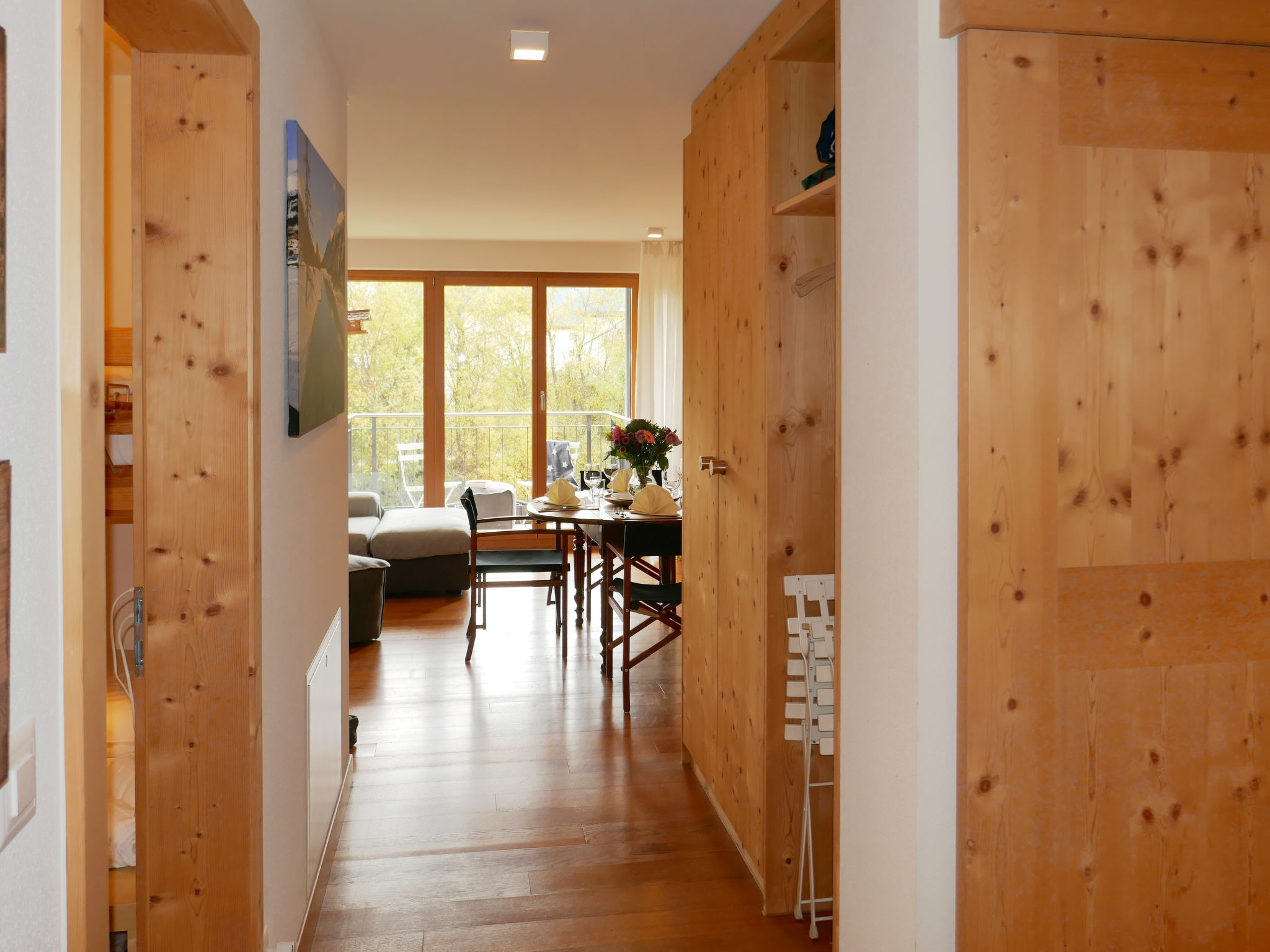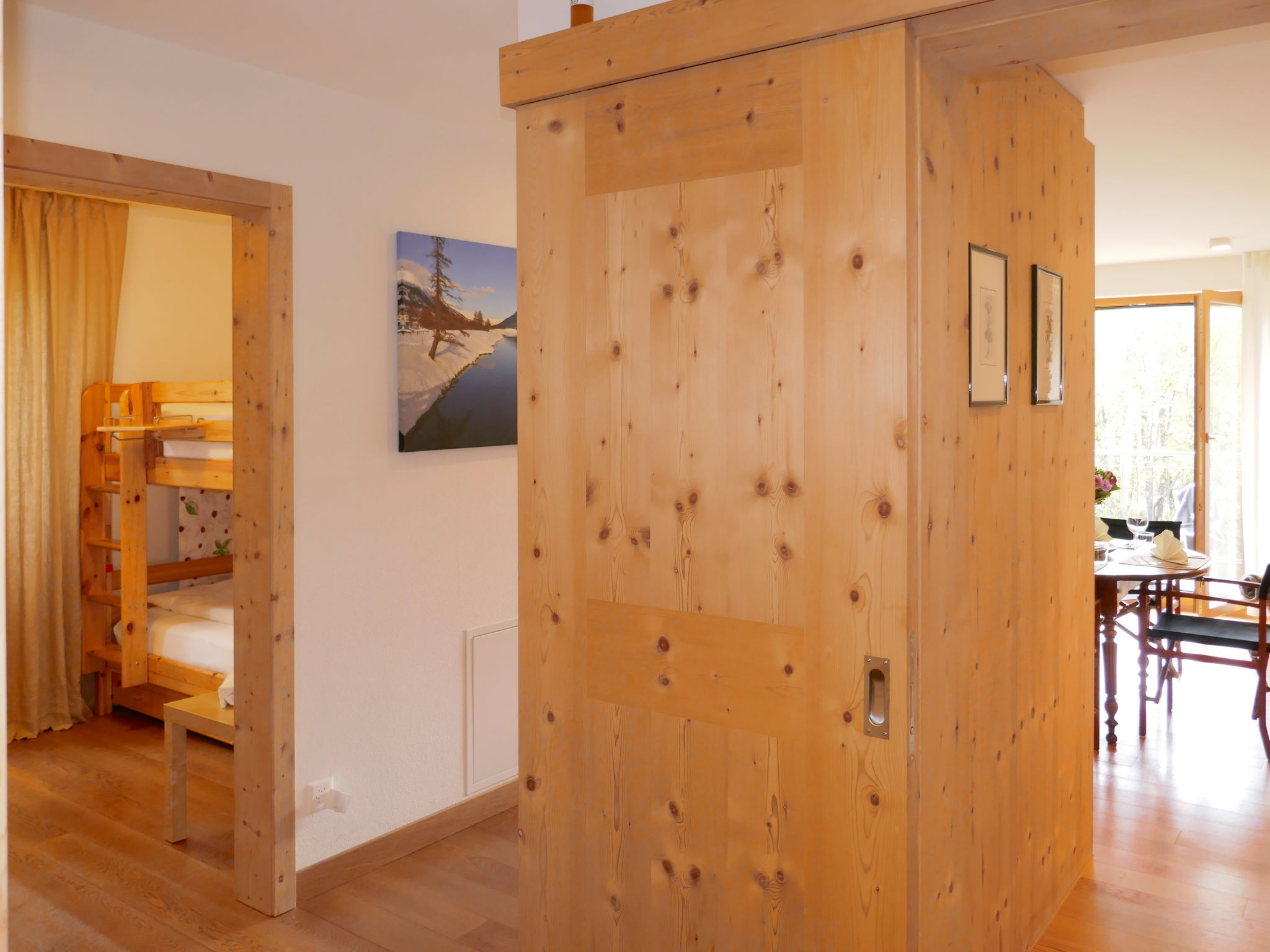 "Chesa San Bastiaun B4", 3-Zimmer-Wohnung 60 m2 im 1. Stock, Südostlage. Objekt geeignet für 2 Erwachsene + 2 Kinder. Hell, geschmackvoll und gemütlich eingerichtet: Wohn-/Esszimmer mit Esstisch und TV (Flachbildschirm), DVD. Ausgang zum Balkon. 1 Doppelzimmer 10 m2 mit 1 franz. Bett (1 x 160 cm, Länge 200 cm). 1 Kinderzimmer 6 m2 mit 1 x 2 Etagenbetten (2 x 90 cm, Länge 190 cm). Offene Küche (Backofen, Geschirrspüler, 4 Glaskeramikplatten, Toaster, Wasserkocher, Mikrowelle, elektrische Kaffeemaschine, Kapseln für die Kaffeemaschine (Nespresso) extra, Racletteofen, Fondue Set (Chinoise, Käse)). Bad/Bidet/WC, Dusche/WC. Heizung. Holzdielenboden. Balkonmöbel. Sehr schöne Sicht auf die Berge und den Fluss. Zur Verfügung: Bügeleisen, Haartrockner. Internet (Wireless LAN, gratis). Garage Nr. B4 auf dem Grundstück (1 Auto), Höhe 230 cm, Breite 250 cm. Bitte beachten: geeignet für Familien. Nichtraucher-Unterkunft, Nichtraucher-Haus.