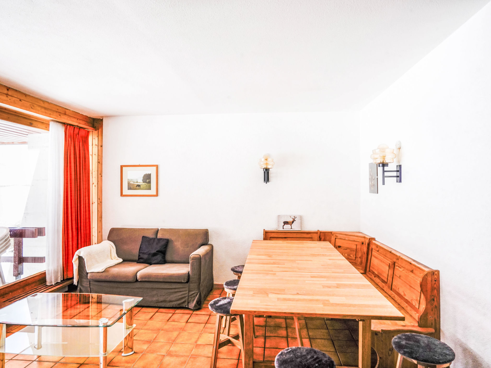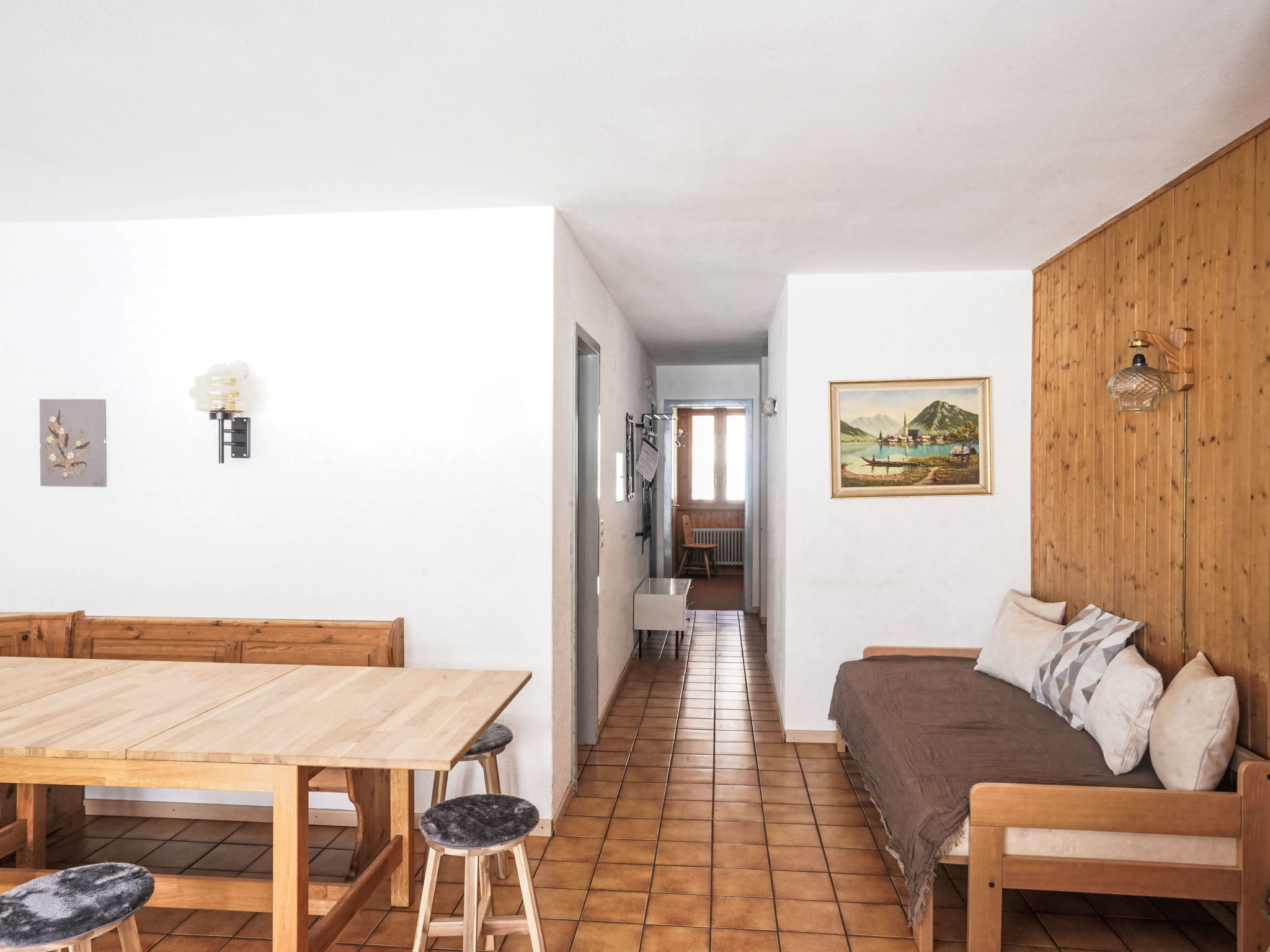 "Arzinol 108", 4-Zimmer-Wohnung im 1. Stock. Komfortabel und geschmackvoll eingerichtet: Wohn-/Esszimmer mit 1 Bett (95 cm, Länge 190 cm), TV. Ausgang zum Balkon. 1 Zimmer mit 2 Betten (90 cm, Länge 200 cm). 1 Zimmer mit (90 cm, Länge 190 cm), 1 x 2 Etagenbetten mit 1 Bett (80 cm, Länge 190 cm). Küche (3 Kochplatten, Backofen). 2 Bäder/WC, sep. WC. Teppichboden. Balkon, Südlage. Balkonmöbel. Sehr schöne Sicht auf die Berge und die Landschaft. Maximal 1 Haustier/Hund erlaubt.