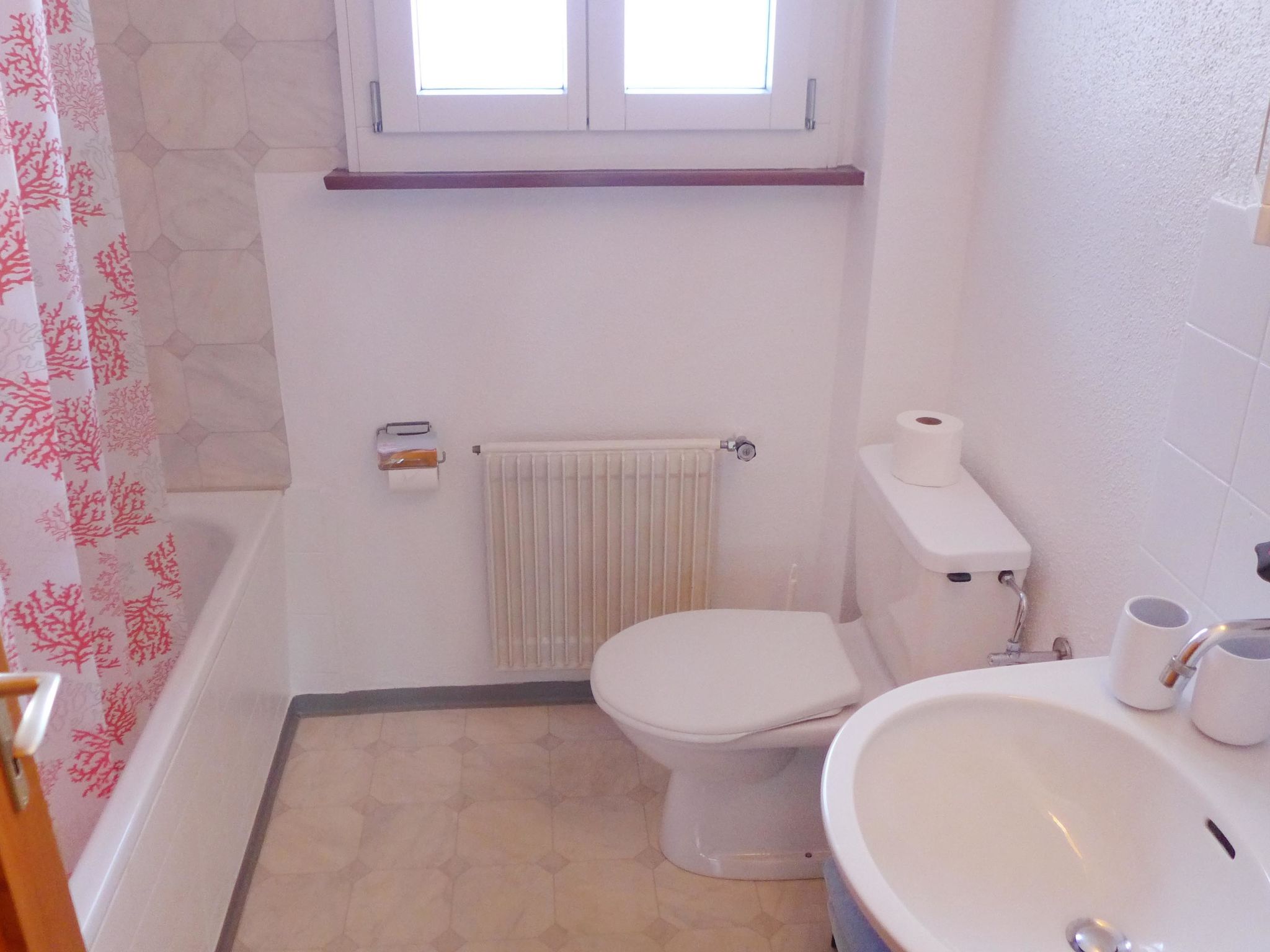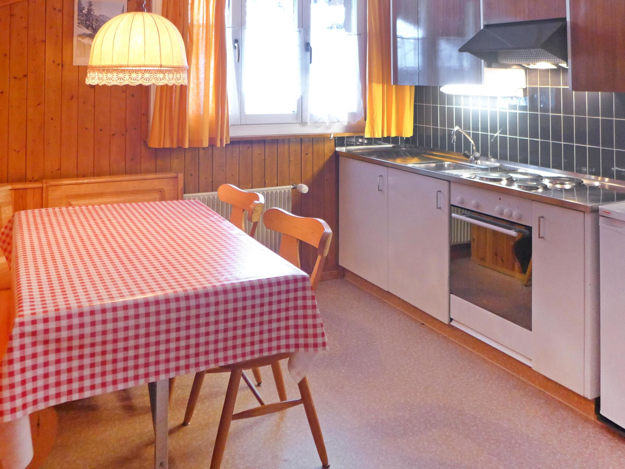 2-Zimmer-Wohnung 60 m2, im Obergeschoss, Südlage. Teilweise abgeschrägt, gemütlich und mit viel Holz eingerichtet: Wohn-/Schlafzimmer mit 2 Diwanbetten (160 cm, Länge 200 cm), Kabel-TV (Flachbildschirm). Ausgang zum Balkon, Richtung Süden. 1 Zimmer 18 m2 mit 2 Betten (90 cm, Länge 200 cm). Ausgang zum Balkon, Richtung Süden. Wohnküche (3 Kochplatten, Backofen, Toaster, Wasserkocher, Mikrowelle, elektrische Kaffeemaschine, Kapseln für die Kaffeemaschine (Nespresso) extra, Fondue Set (Chinoise, Käse)). Bad/WC. Balkon 7 m2, Südlage und Westlage. Balkonmöbel. Herrliche Sicht auf die Berge und Eigernordwand. Zur Verfügung: Bügeleisen, Haartrockner. Internet (Wireless LAN, gratis). Parkplatz beim Haus. Bitte beachten: Nichtraucher-Unterkunft. Feuerlöscher.