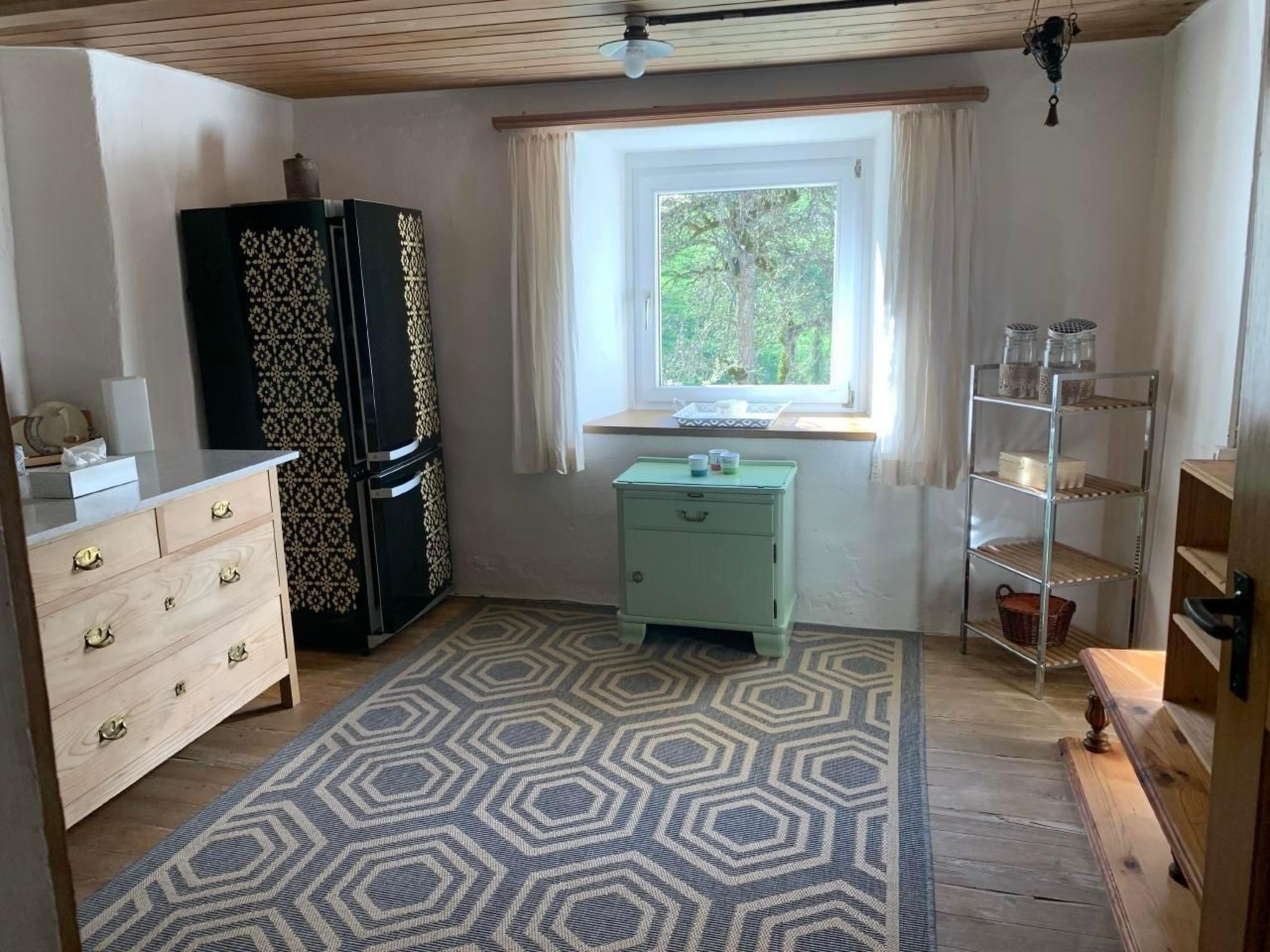 Im Inneren des Ferienhauses finden Gäste eine zweckmäßige Ausstattung vor, die den Aufenthalt angenehm und komfortabel gestaltet. Eine Waschmaschine zur gemeinschaftlichen Nutzung im Gebäude steht zur Verfügung, ebenso wie ein 3-Platten-Herd, eine Kaffeemaschine und ein Wasserkocher in der Küche. Zum Entspannen nach einem Tag in der Natur lädt das Wohnzimmer mit einem Fernseher und einem Specksteinofen ein.