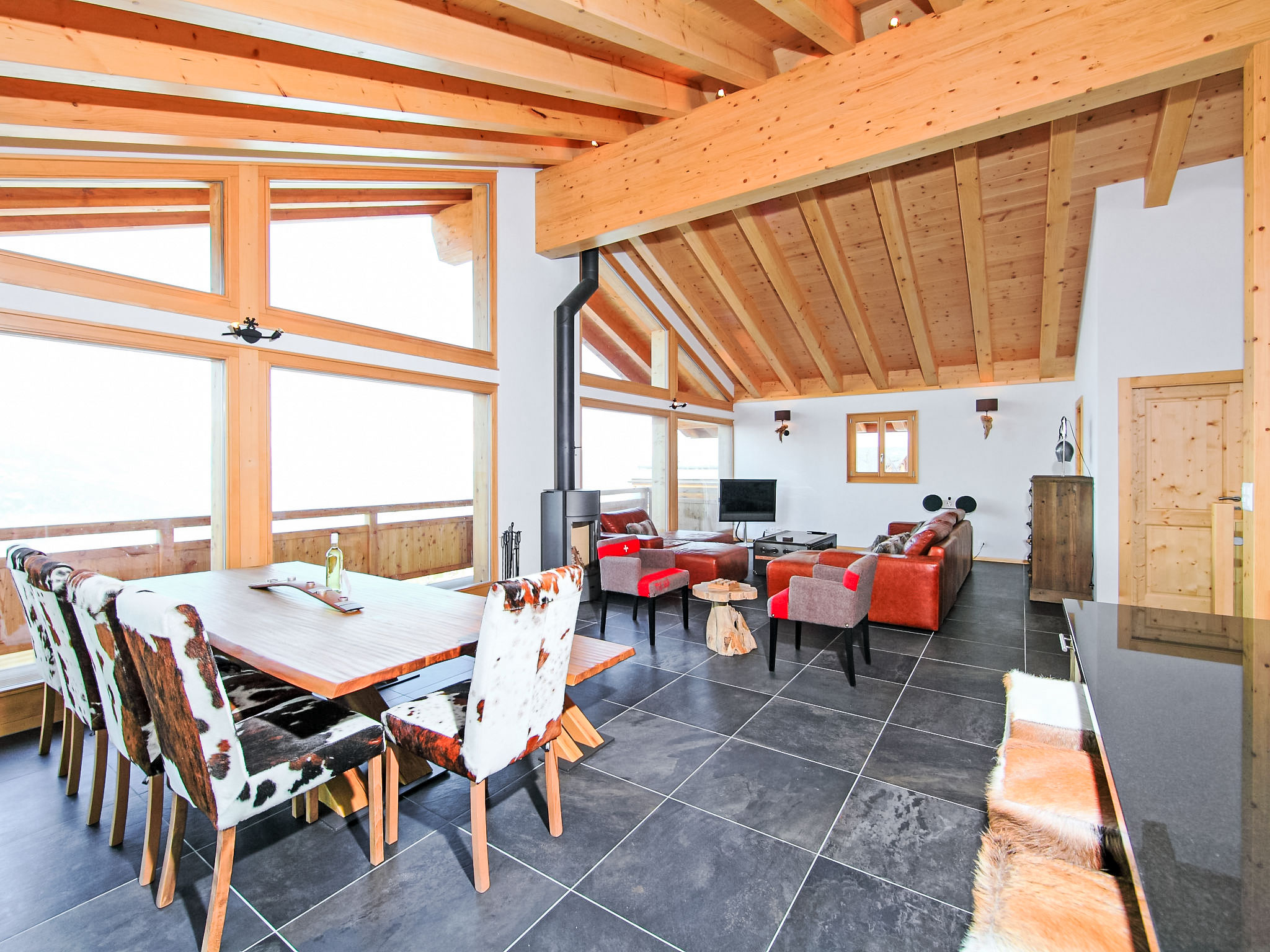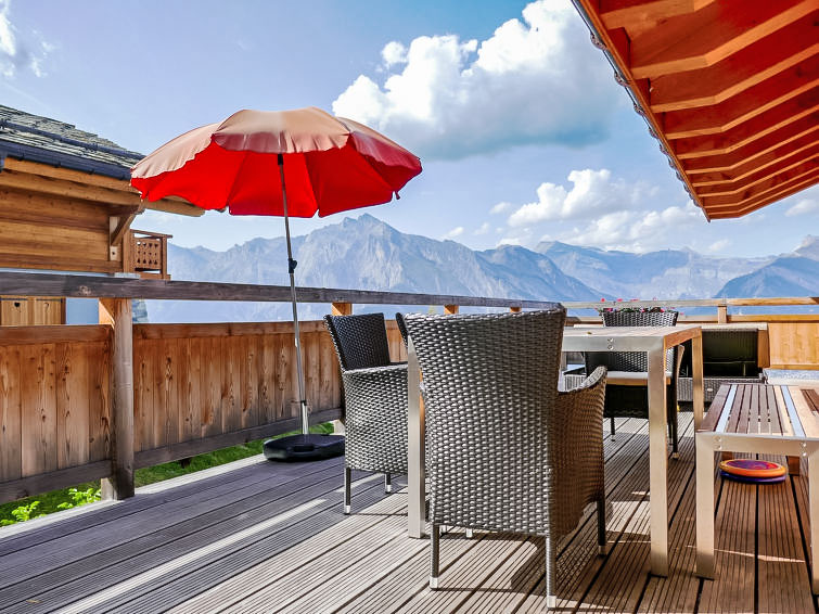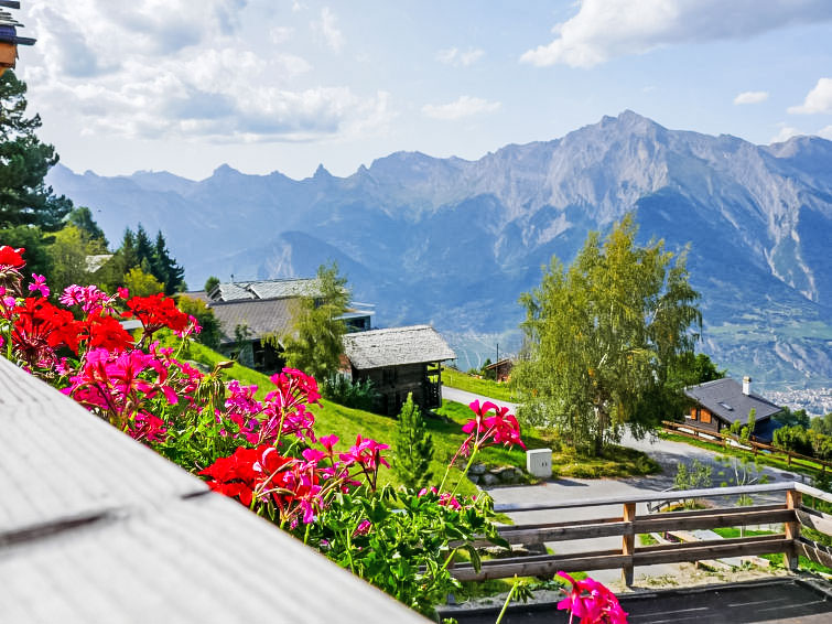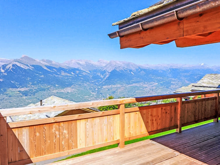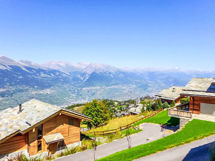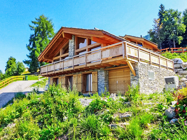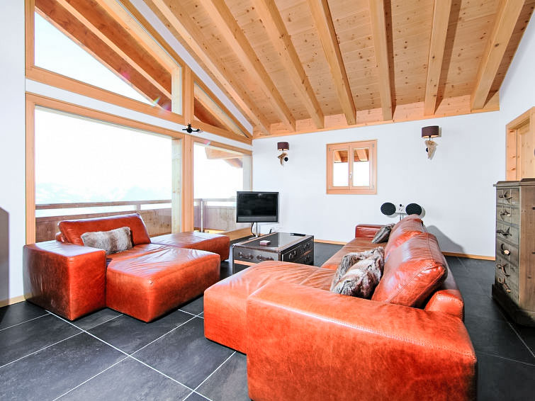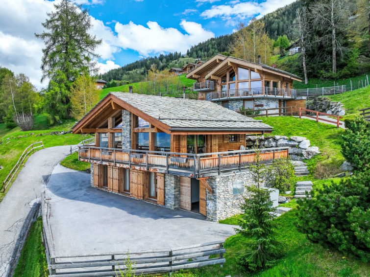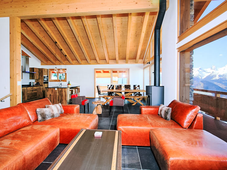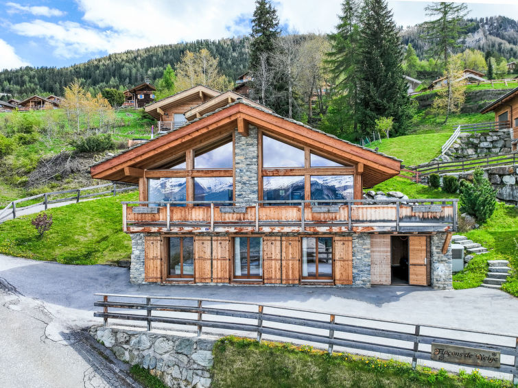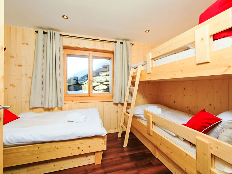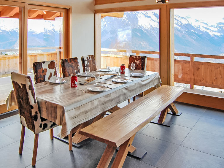 "Chalet Flocon de Neige", 5-Zimmer-Chalet 184 m2 auf 2 Stockwerken. Komfortabel eingerichtet: grosses Wohn-/Esszimmer mit Panoramafenster mit Schwedenofen, Essecke, Kabel-TV und DVD. Offene Küche (Backofen, Geschirrspüler, 6 Induktionskochplatten, Toaster, Wasserkocher, Mikrowelle, elektrische Kaffeemaschine, Kapseln für die Kaffeemaschine (Nespresso) extra, Racletteofen, Kochinsel, Fondue Set (Käse)). Sep. WC. Heizung. Unteres Geschoss: 2 Doppelzimmer, jedes Zimmer mit 2 Betten (90 cm, Länge 200 cm). 1 Kinderzimmer mit 1 Bett (90 cm, Länge 190 cm), 1 x 2 Etagenbetten (90 cm, Länge 190 cm), Kabel-TV, Flachbildschirm und DVD. 1 Doppelzimmer mit 1 franz. Bett (160 cm, Länge 190 cm), Dusche/WC, Kabel-TV und Flachbildschirm. Bad/WC, Dusche/WC. Balkon, Nordlage, Terrasse, Westlage und Nordlage. Terrassenmöbel, Gartengrill, Liegestühle (2). Sehr schöne Sicht auf die Berge und das Tal. Zur Verfügung: Waschmaschine, Wäschetrockner, Kinderhochstuhl, Babybett, Haartrockner. Internet (WLAN, gratis). Parkplatz (3 Autos). Bitte beachten: Nichtraucher-Haus.