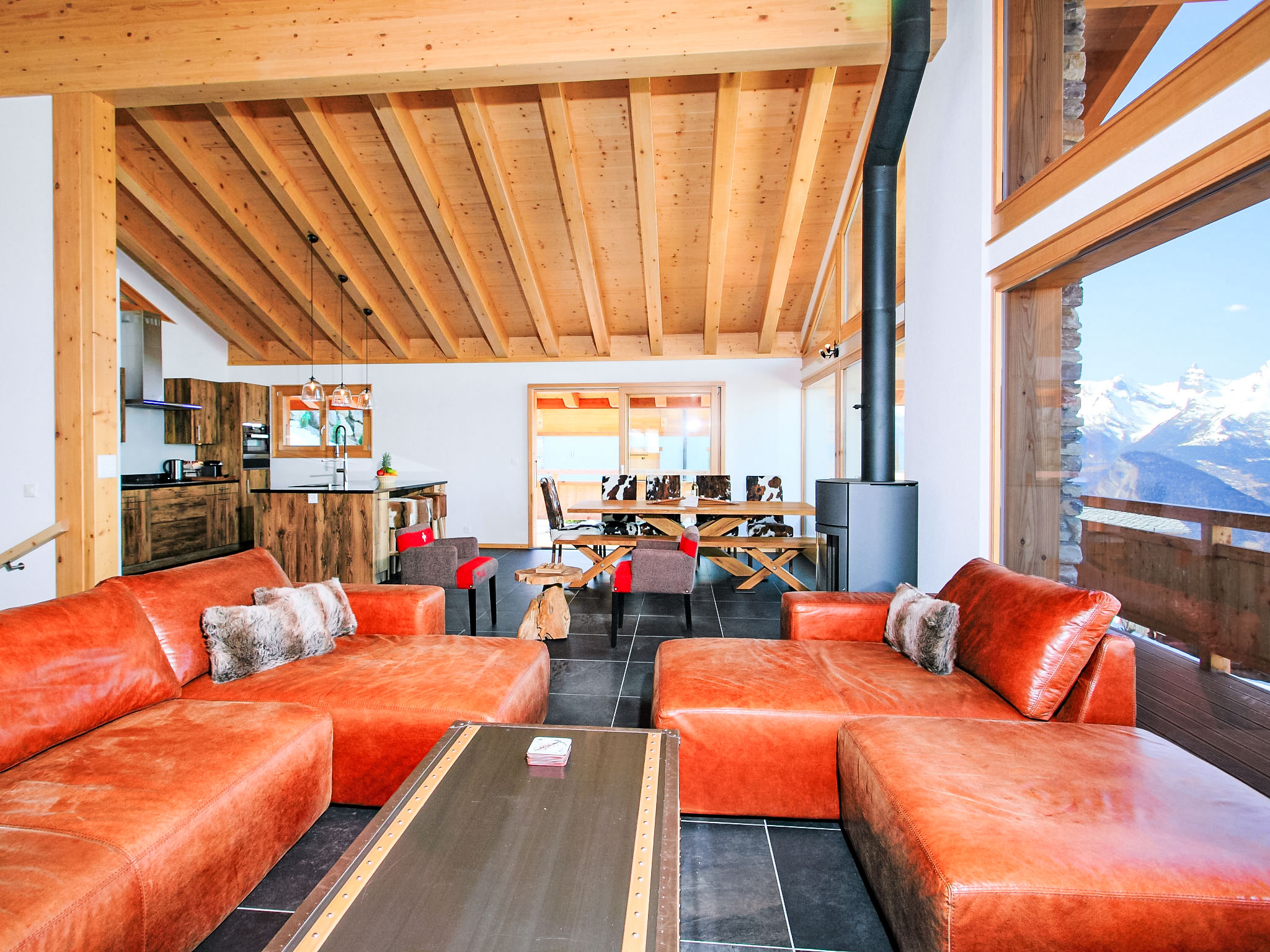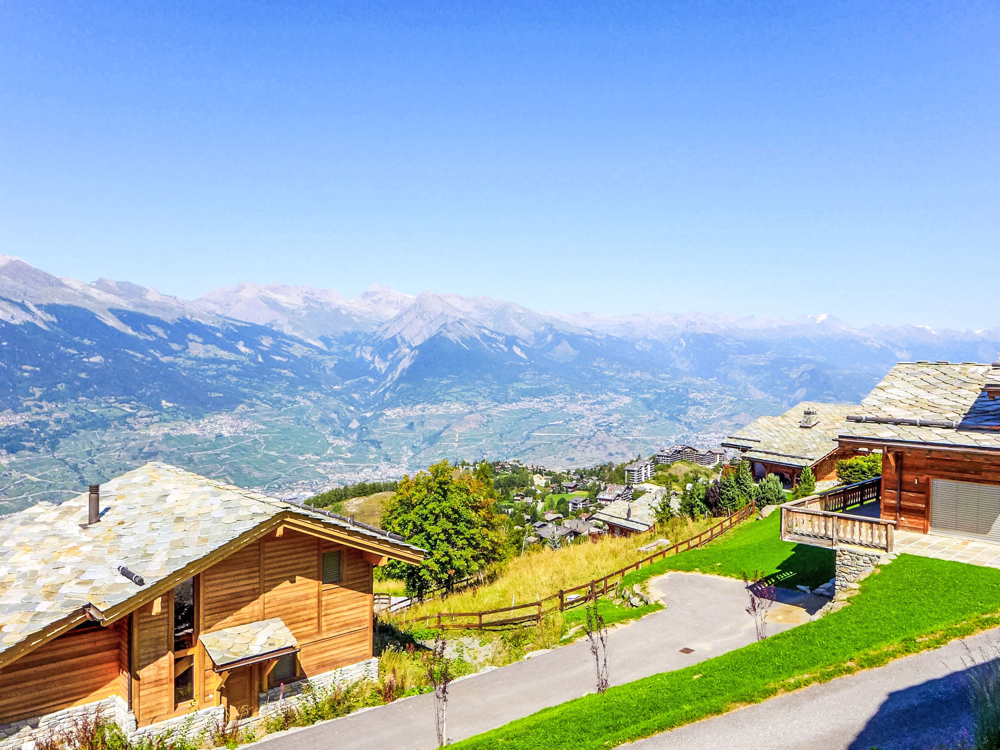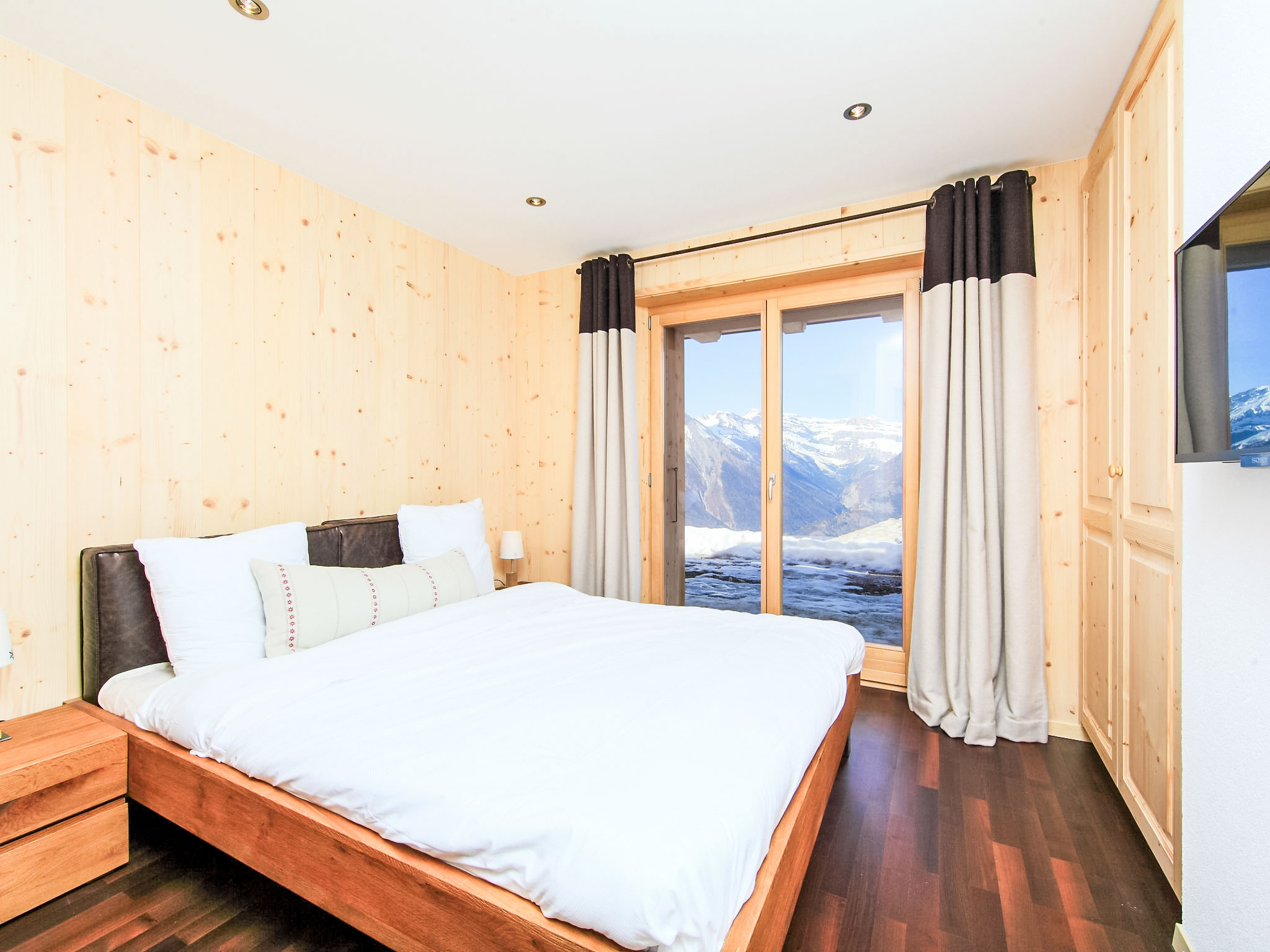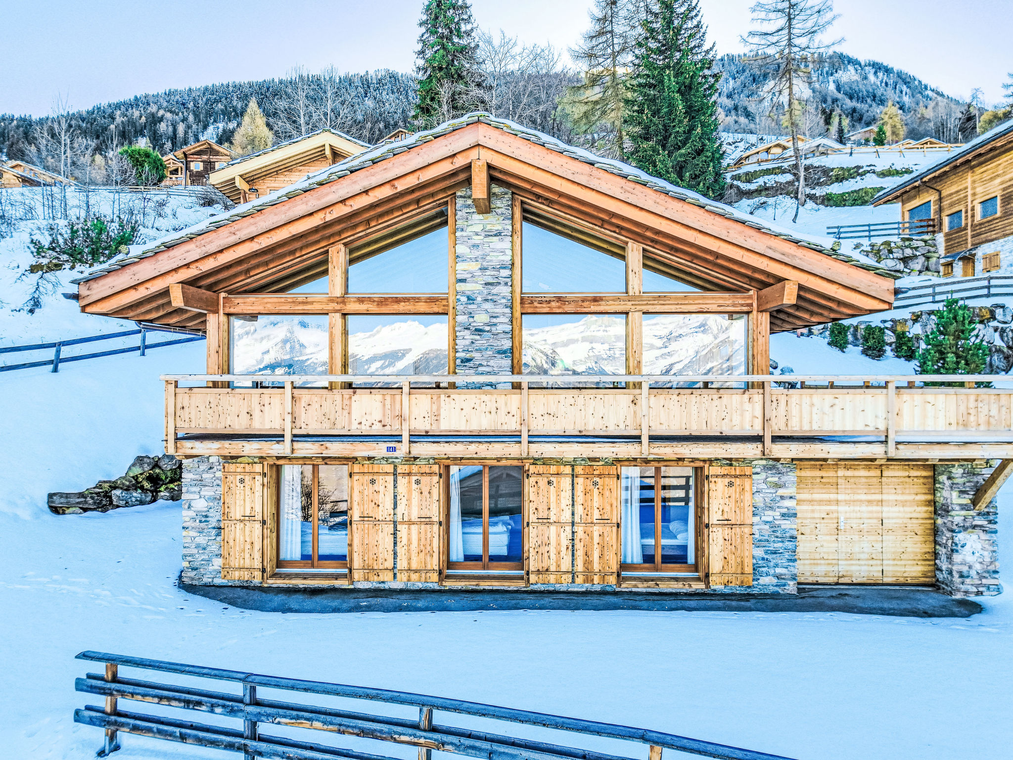 "Chalet Flocon de Neige", 5-Zimmer-Chalet 184 m2 auf 2 Stockwerken. Komfortabel eingerichtet: grosses Wohn-/Esszimmer mit Panoramafenster mit Schwedenofen, Essecke, Kabel-TV und DVD. Offene Küche (Backofen, Geschirrspüler, 6 Induktionskochplatten, Toaster, Wasserkocher, Mikrowelle, elektrische Kaffeemaschine, Kapseln für die Kaffeemaschine (Nespresso) extra, Racletteofen, Kochinsel, Fondue Set (Käse)). Sep. WC. Heizung. Unteres Geschoss: 2 Doppelzimmer, jedes Zimmer mit 2 Betten (90 cm, Länge 200 cm). 1 Kinderzimmer mit 1 Bett (90 cm, Länge 190 cm), 1 x 2 Etagenbetten (90 cm, Länge 190 cm), Kabel-TV, Flachbildschirm und DVD. 1 Doppelzimmer mit 1 franz. Bett (160 cm, Länge 190 cm), Dusche/WC, Kabel-TV und Flachbildschirm. Bad/WC, Dusche/WC. Balkon, Nordlage, Terrasse, Westlage und Nordlage. Terrassenmöbel, Gartengrill, Liegestühle (2). Sehr schöne Sicht auf die Berge und das Tal. Zur Verfügung: Waschmaschine, Wäschetrockner, Kinderhochstuhl, Babybett, Haartrockner. Internet (WLAN, gratis). Parkplatz (3 Autos). Bitte beachten: Nichtraucher-Haus.