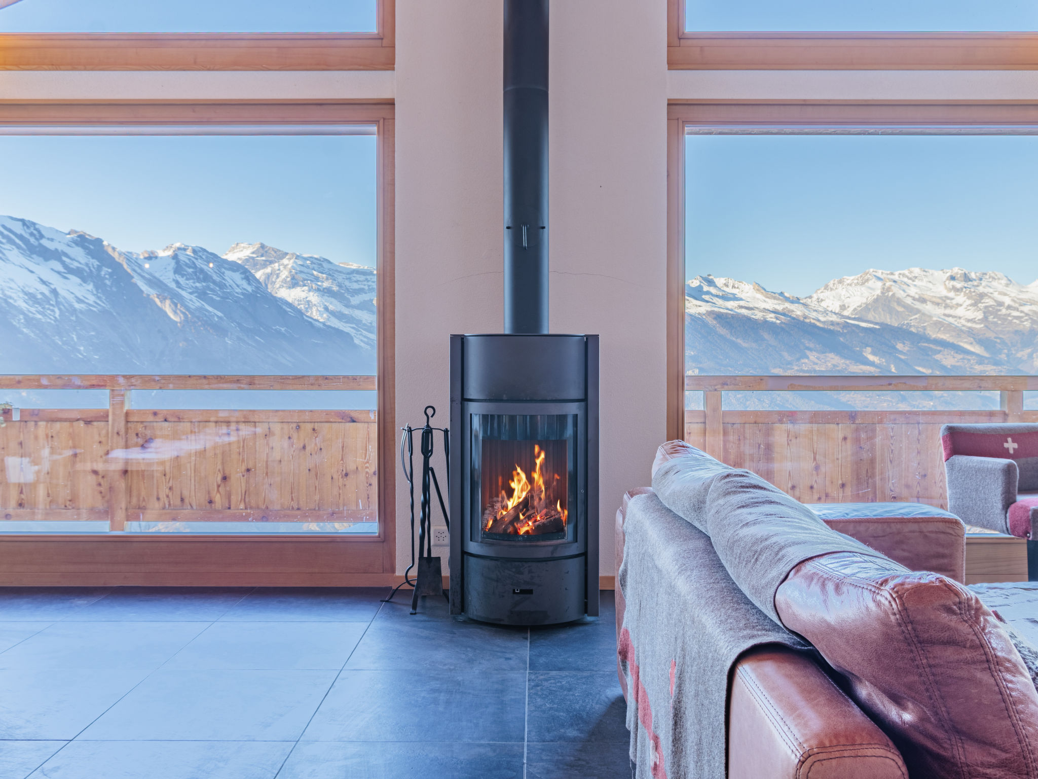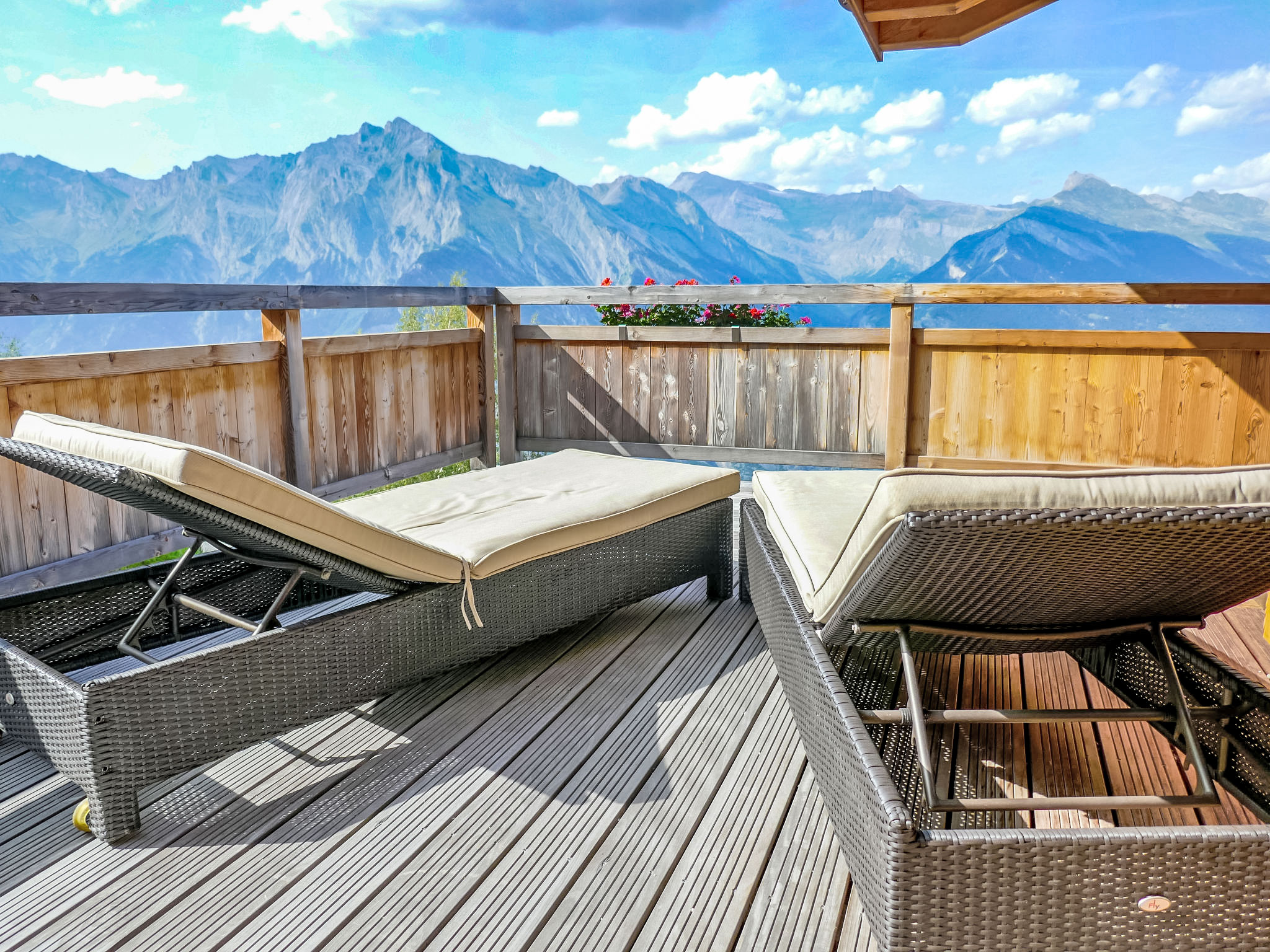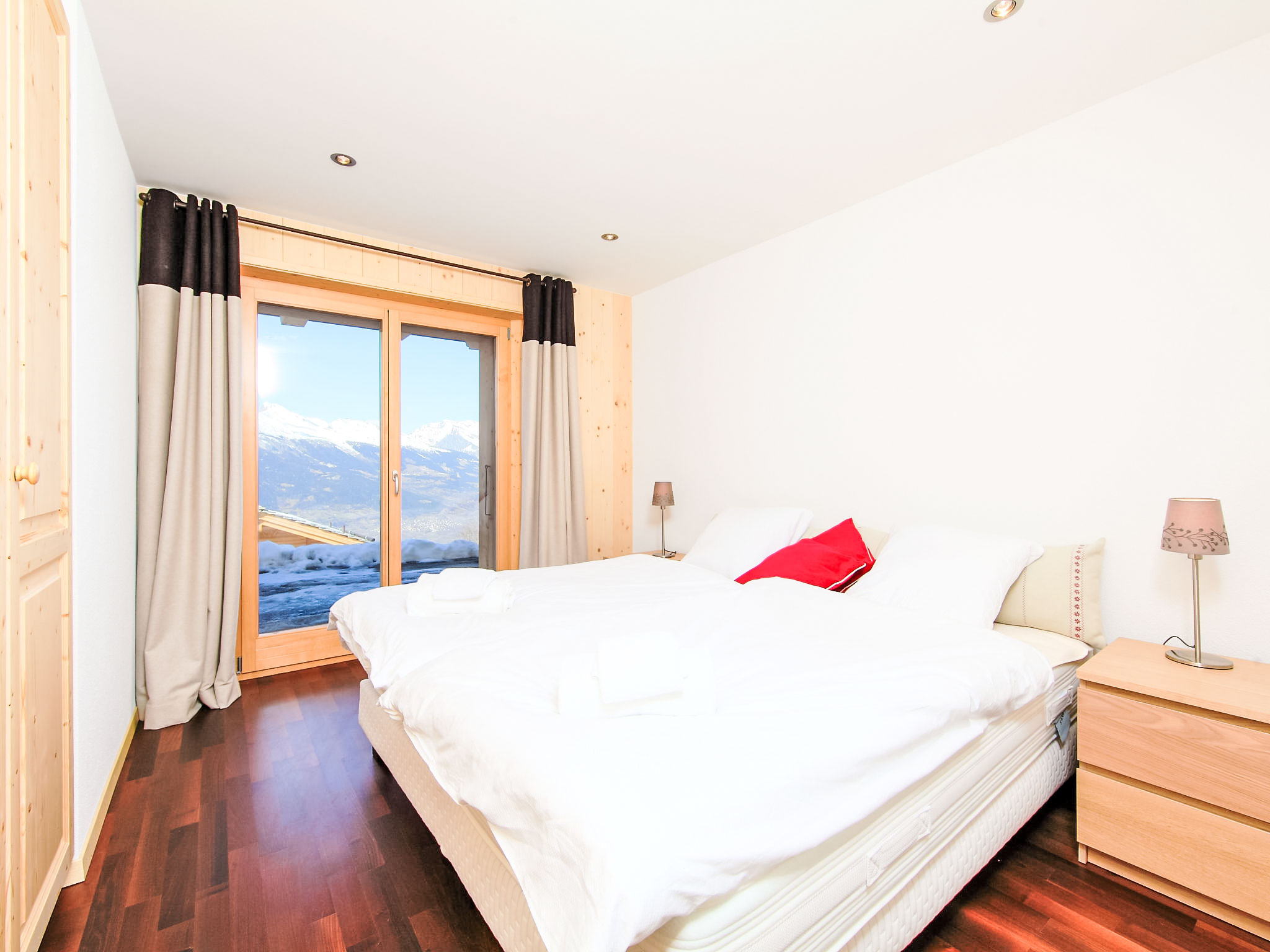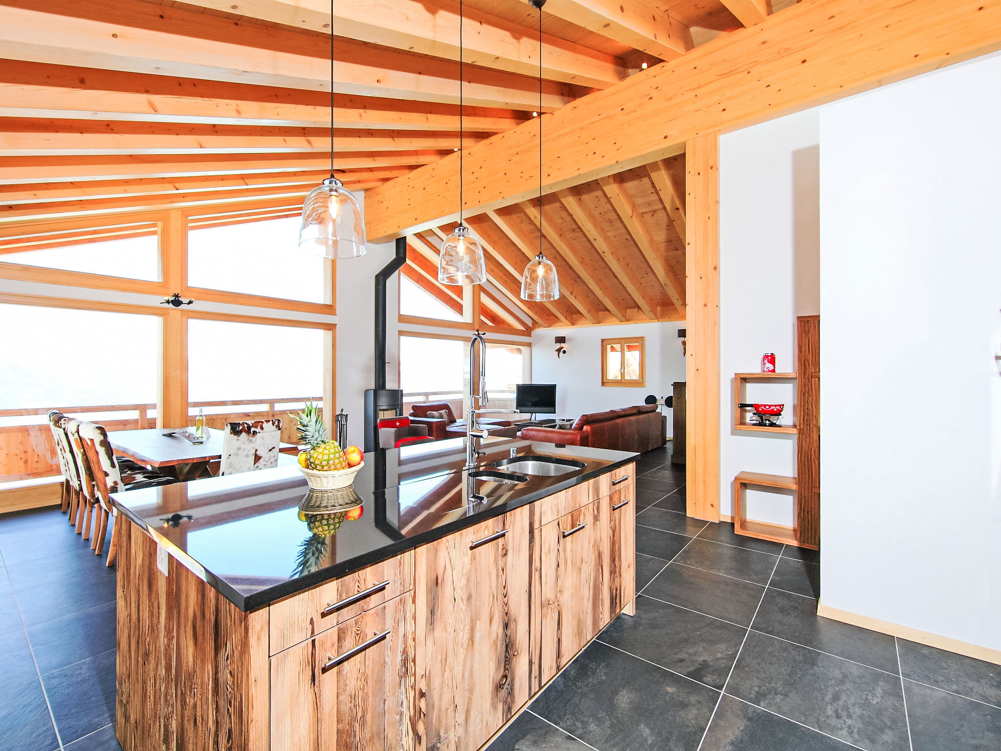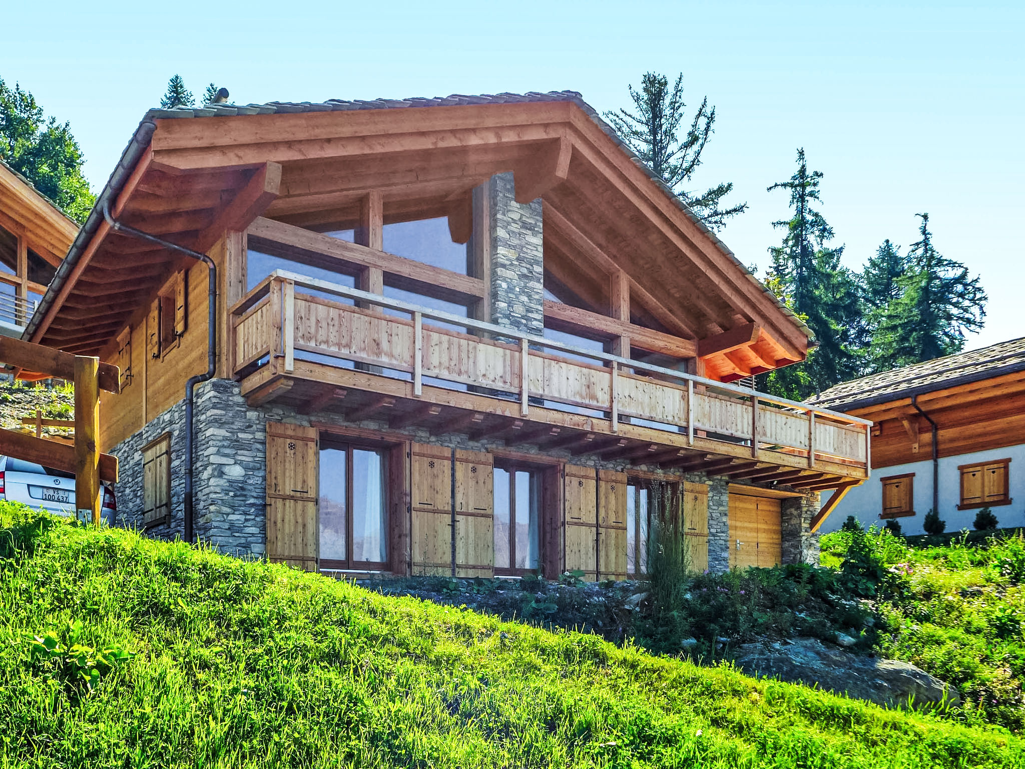 "Chalet Flocon de Neige", 5-Zimmer-Chalet 184 m2 auf 2 Stockwerken. Komfortabel eingerichtet: grosses Wohn-/Esszimmer mit Panoramafenster mit Schwedenofen, Essecke, Kabel-TV und DVD. Offene Küche (Backofen, Geschirrspüler, 6 Induktionskochplatten, Toaster, Wasserkocher, Mikrowelle, elektrische Kaffeemaschine, Kapseln für die Kaffeemaschine (Nespresso) extra, Racletteofen, Kochinsel, Fondue Set (Käse)). Sep. WC. Heizung. Unteres Geschoss: 2 Doppelzimmer, jedes Zimmer mit 2 Betten (90 cm, Länge 200 cm). 1 Kinderzimmer mit 1 Bett (90 cm, Länge 190 cm), 1 x 2 Etagenbetten (90 cm, Länge 190 cm), Kabel-TV, Flachbildschirm und DVD. 1 Doppelzimmer mit 1 franz. Bett (160 cm, Länge 190 cm), Dusche/WC, Kabel-TV und Flachbildschirm. Bad/WC, Dusche/WC. Balkon, Nordlage, Terrasse, Westlage und Nordlage. Terrassenmöbel, Gartengrill, Liegestühle (2). Sehr schöne Sicht auf die Berge und das Tal. Zur Verfügung: Waschmaschine, Wäschetrockner, Kinderhochstuhl, Babybett, Haartrockner. Internet (WLAN, gratis). Parkplatz (3 Autos). Bitte beachten: Nichtraucher-Haus.