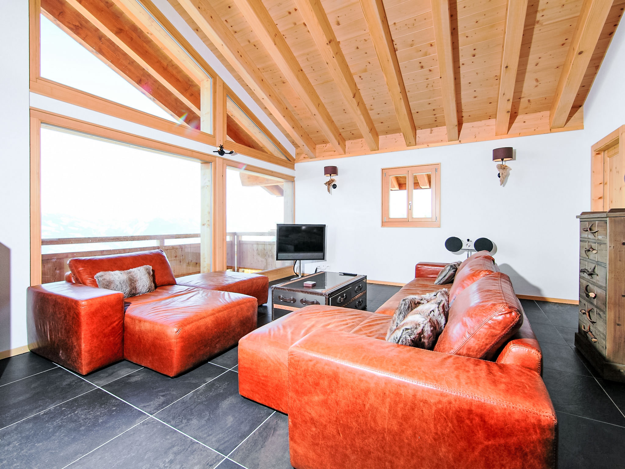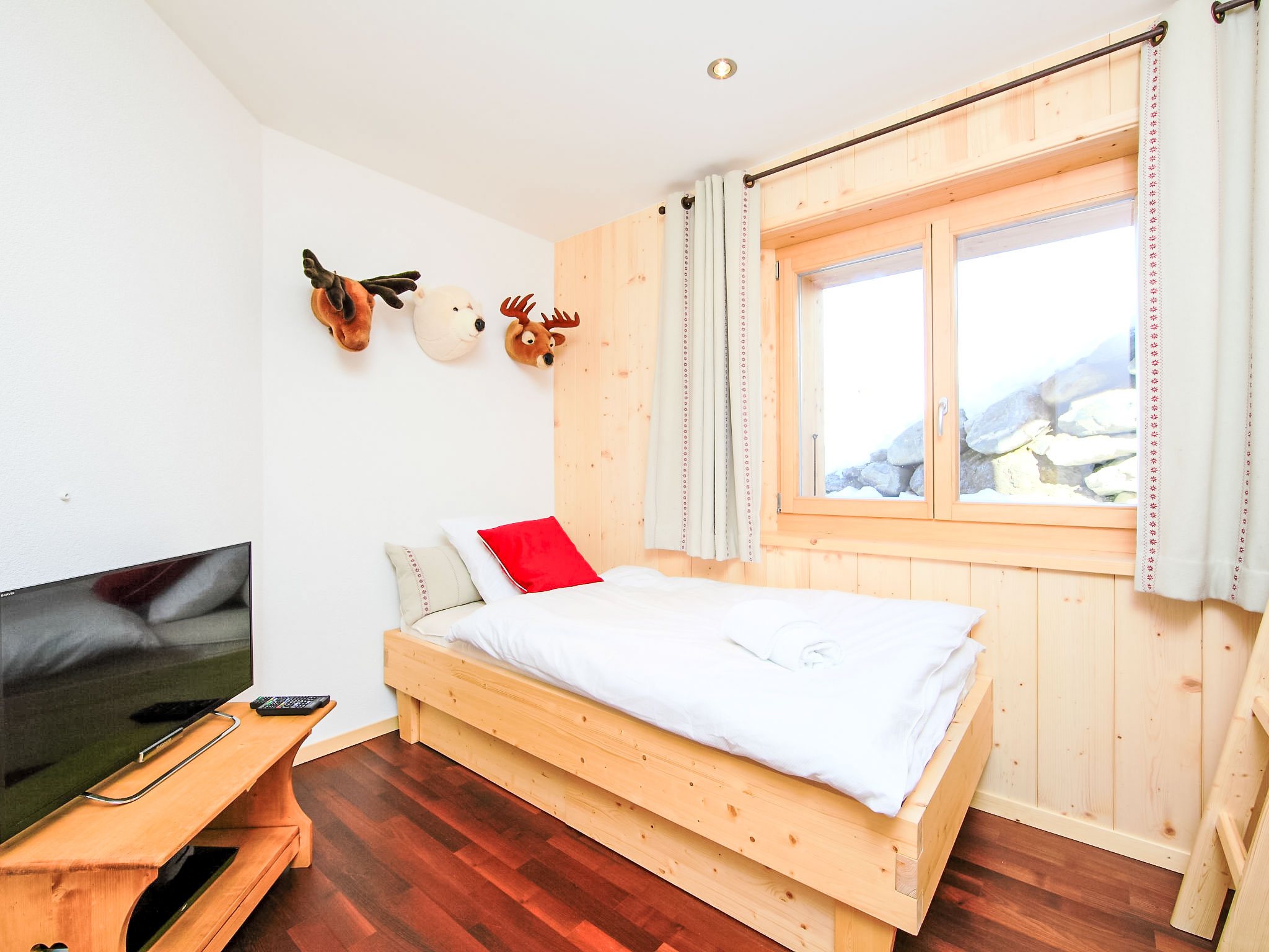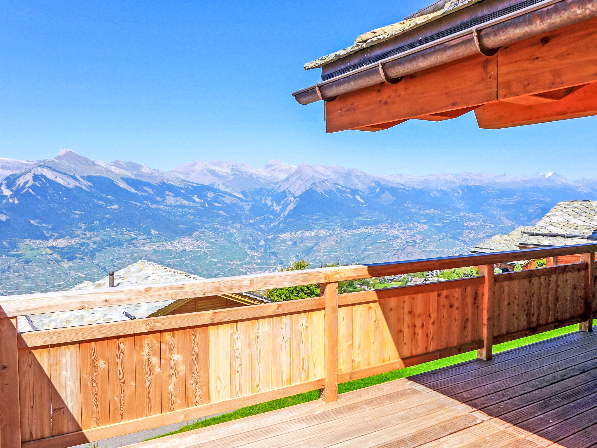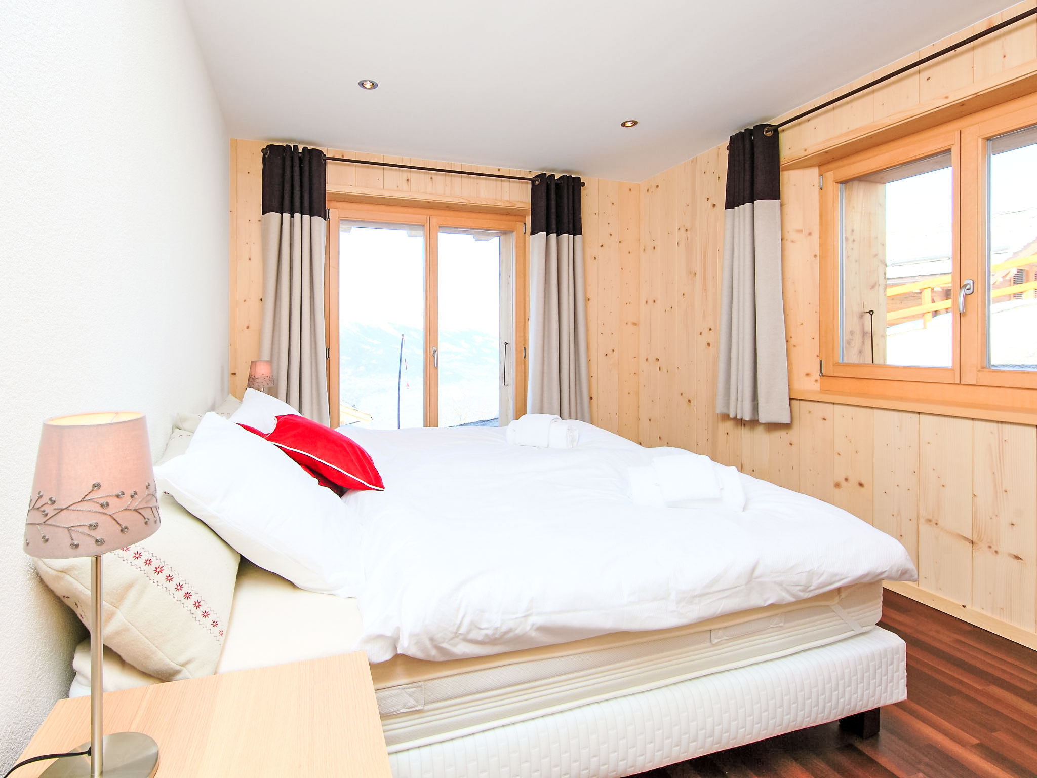 "Chalet Flocon de Neige", 5-Zimmer-Chalet 184 m2 auf 2 Stockwerken. Komfortabel eingerichtet: grosses Wohn-/Esszimmer mit Panoramafenster mit Schwedenofen, Essecke, Kabel-TV und DVD. Offene Küche (Backofen, Geschirrspüler, 6 Induktionskochplatten, Toaster, Wasserkocher, Mikrowelle, elektrische Kaffeemaschine, Kapseln für die Kaffeemaschine (Nespresso) extra, Racletteofen, Kochinsel, Fondue Set (Käse)). Sep. WC. Heizung. Unteres Geschoss: 2 Doppelzimmer, jedes Zimmer mit 2 Betten (90 cm, Länge 200 cm). 1 Kinderzimmer mit 1 Bett (90 cm, Länge 190 cm), 1 x 2 Etagenbetten (90 cm, Länge 190 cm), Kabel-TV, Flachbildschirm und DVD. 1 Doppelzimmer mit 1 franz. Bett (160 cm, Länge 190 cm), Dusche/WC, Kabel-TV und Flachbildschirm. Bad/WC, Dusche/WC. Balkon, Nordlage, Terrasse, Westlage und Nordlage. Terrassenmöbel, Gartengrill, Liegestühle (2). Sehr schöne Sicht auf die Berge und das Tal. Zur Verfügung: Waschmaschine, Wäschetrockner, Kinderhochstuhl, Babybett, Haartrockner. Internet (WLAN, gratis). Parkplatz (3 Autos). Bitte beachten: Nichtraucher-Haus.