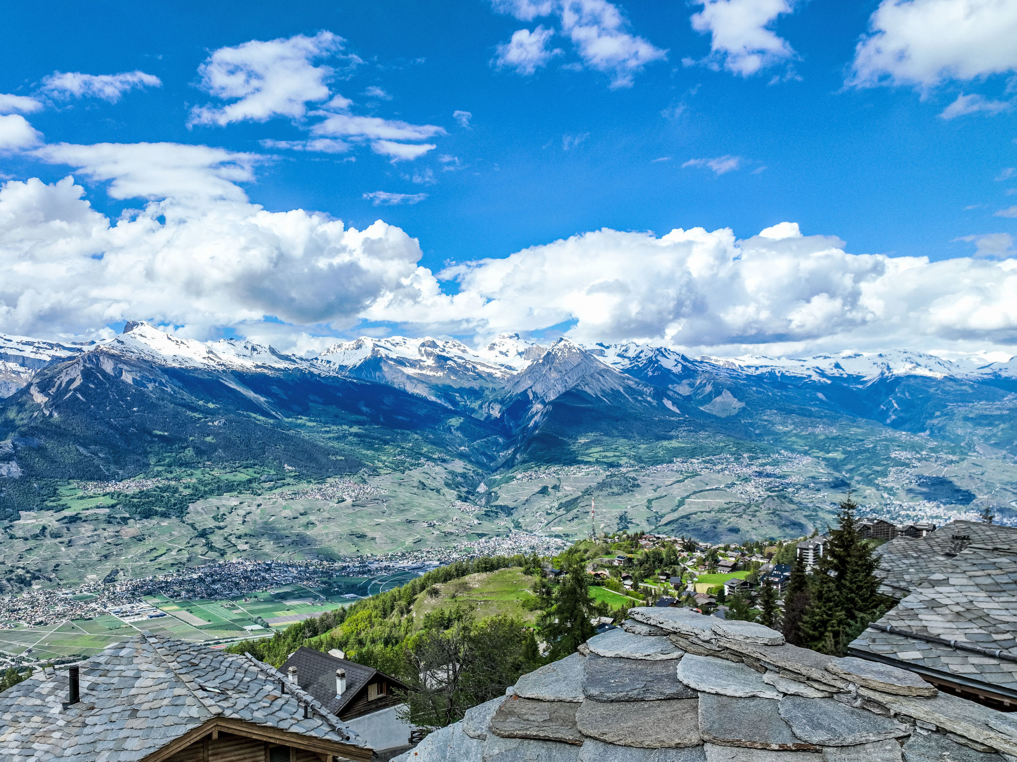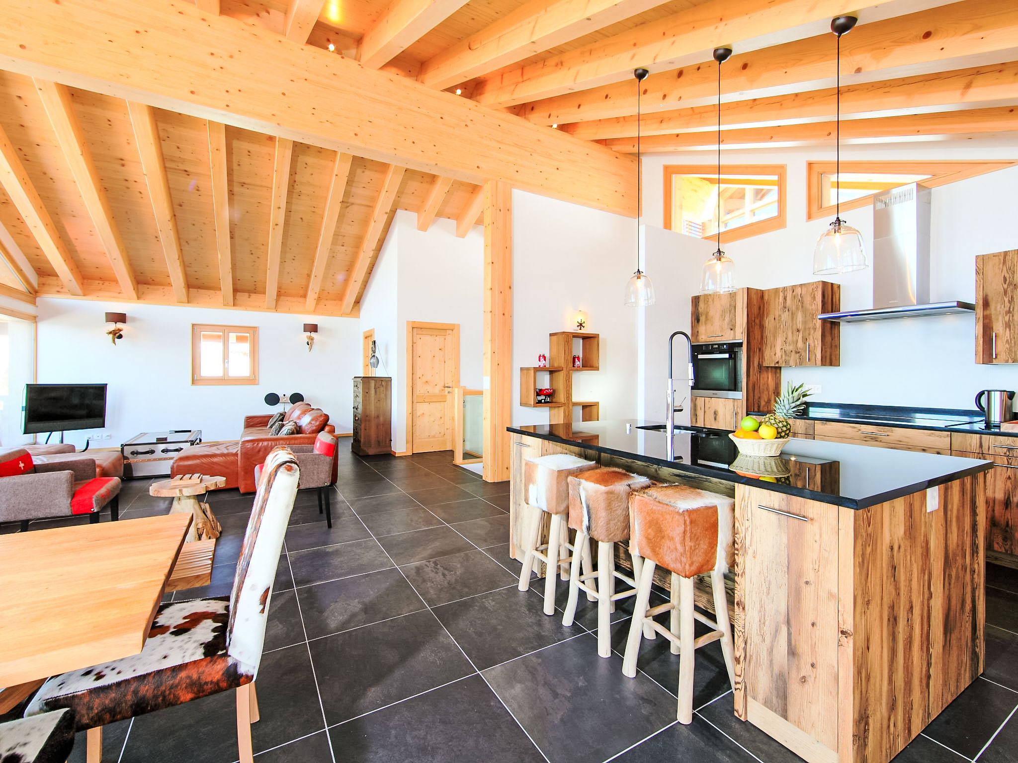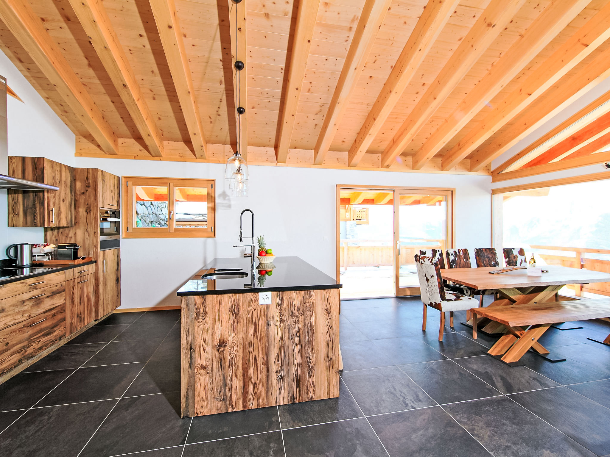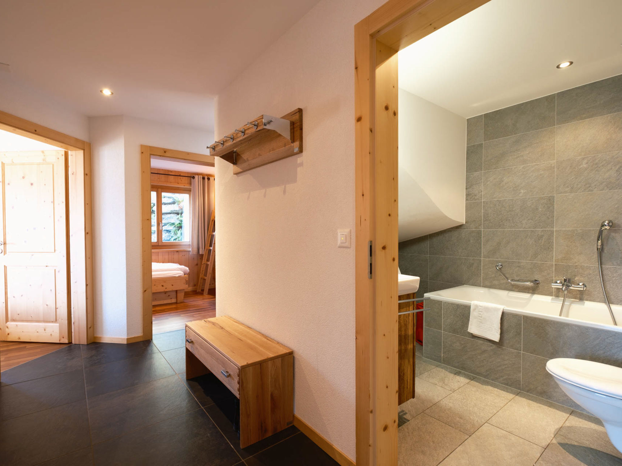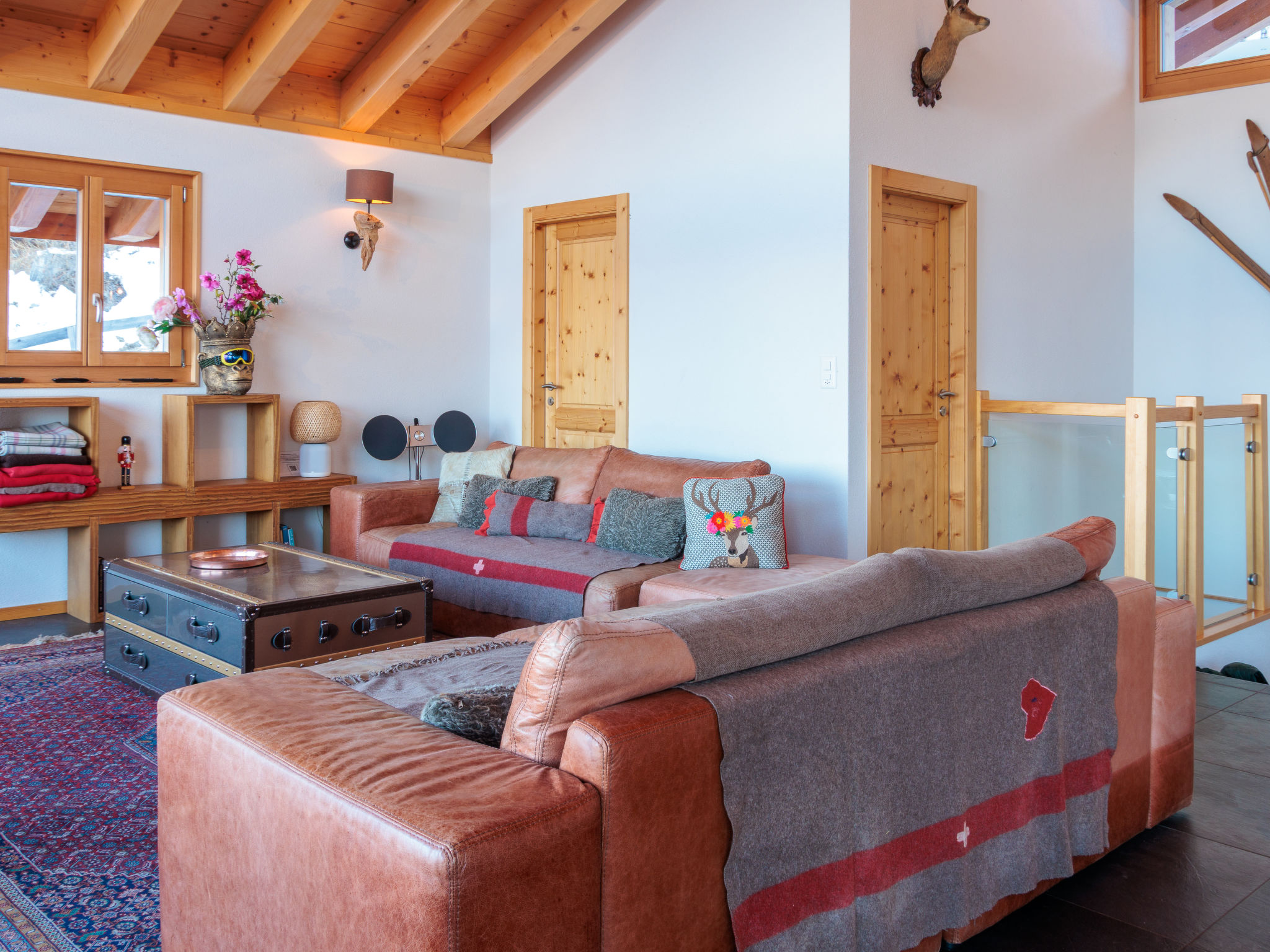 "Chalet Flocon de Neige", 5-Zimmer-Chalet 184 m2 auf 2 Stockwerken. Komfortabel eingerichtet: grosses Wohn-/Esszimmer mit Panoramafenster mit Schwedenofen, Essecke, Kabel-TV und DVD. Offene Küche (Backofen, Geschirrspüler, 6 Induktionskochplatten, Toaster, Wasserkocher, Mikrowelle, elektrische Kaffeemaschine, Kapseln für die Kaffeemaschine (Nespresso) extra, Racletteofen, Kochinsel, Fondue Set (Käse)). Sep. WC. Heizung. Unteres Geschoss: 2 Doppelzimmer, jedes Zimmer mit 2 Betten (90 cm, Länge 200 cm). 1 Kinderzimmer mit 1 Bett (90 cm, Länge 190 cm), 1 x 2 Etagenbetten (90 cm, Länge 190 cm), Kabel-TV, Flachbildschirm und DVD. 1 Doppelzimmer mit 1 franz. Bett (160 cm, Länge 190 cm), Dusche/WC, Kabel-TV und Flachbildschirm. Bad/WC, Dusche/WC. Balkon, Nordlage, Terrasse, Westlage und Nordlage. Terrassenmöbel, Gartengrill, Liegestühle (2). Sehr schöne Sicht auf die Berge und das Tal. Zur Verfügung: Waschmaschine, Wäschetrockner, Kinderhochstuhl, Babybett, Haartrockner. Internet (WLAN, gratis). Parkplatz (3 Autos). Bitte beachten: Nichtraucher-Haus.