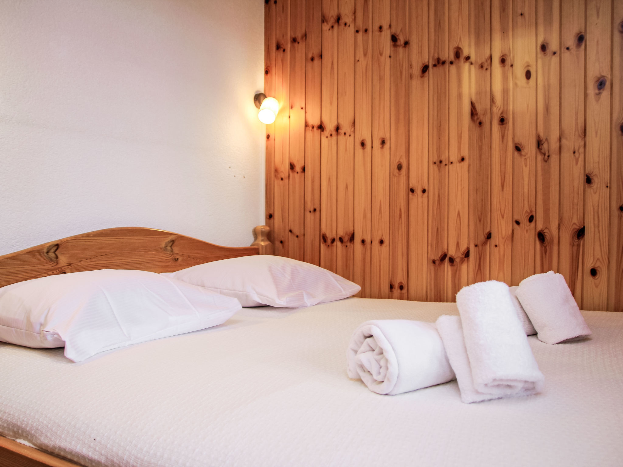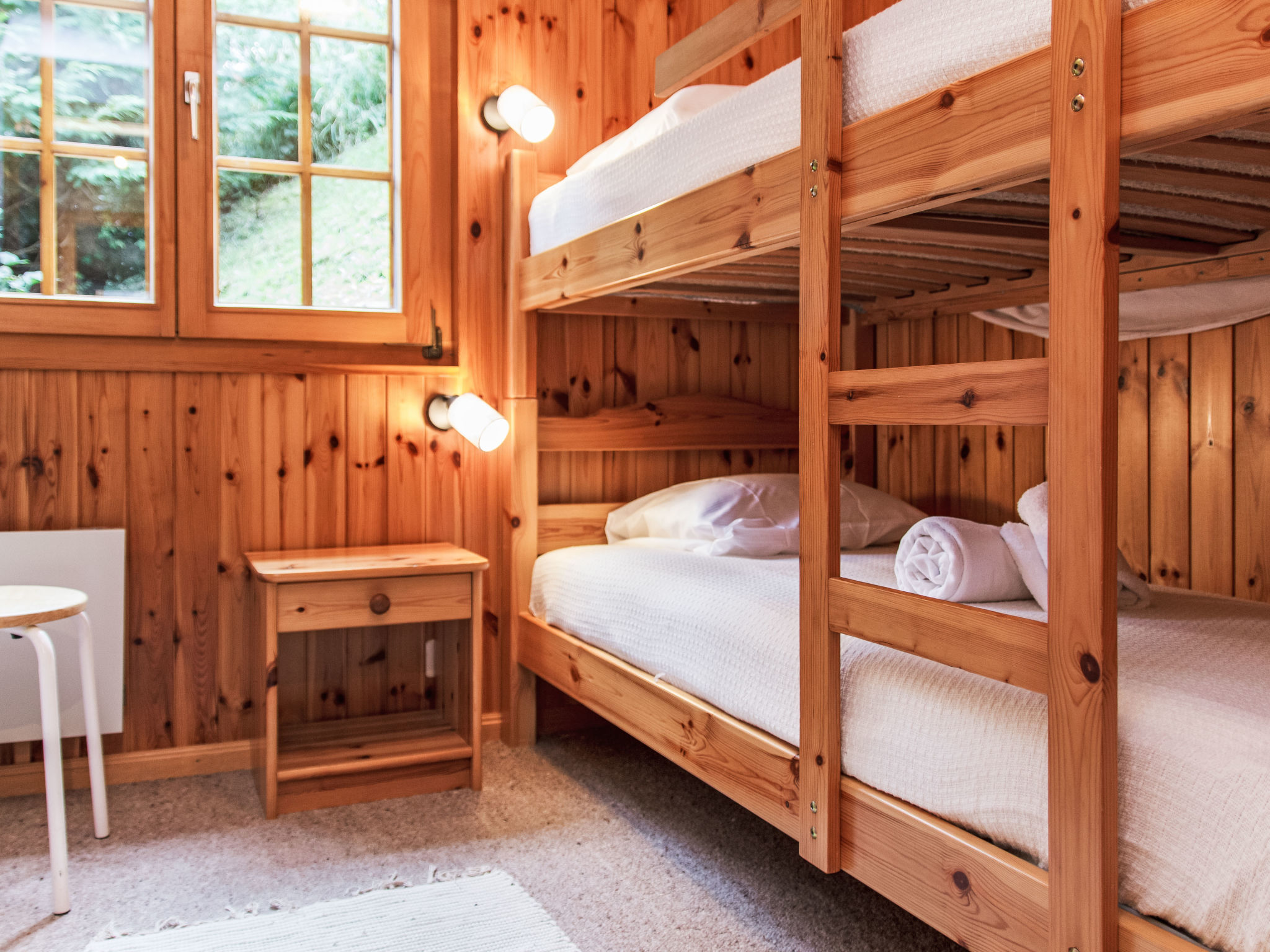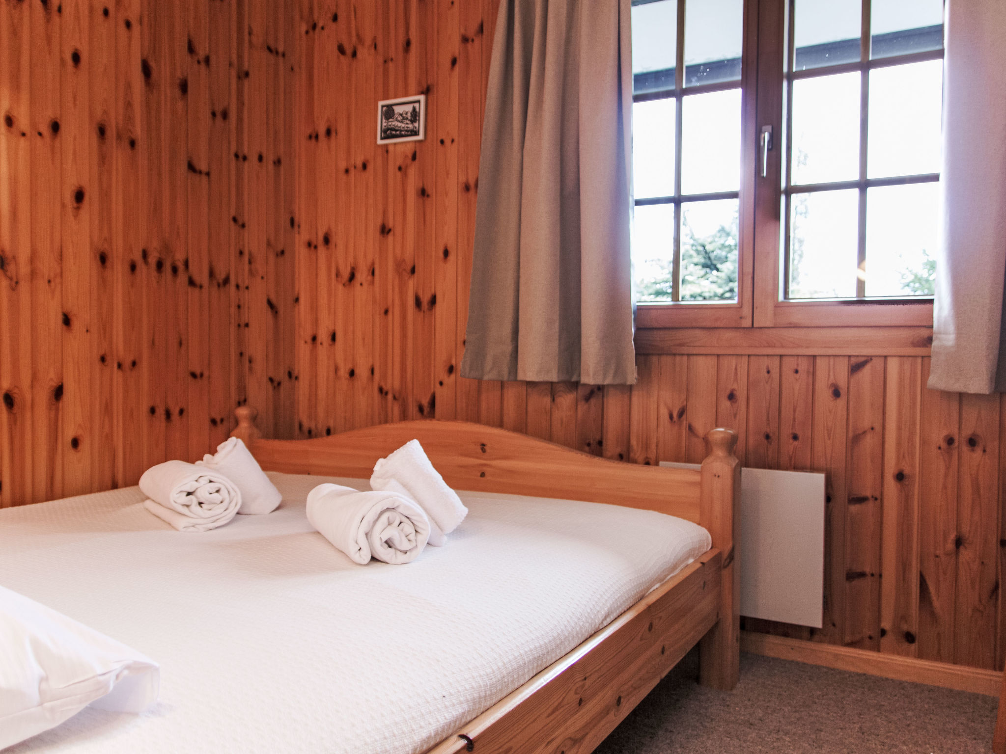"Chalet Soleil", 4-Zimmer-Chalet 80 m2 auf 2 Stockwerken. Komfortabel und schön eingerichtet: Eingang. Wohn-/Esszimmer mit offenem Kamin und Kabel-TV. Ausgang zur Terrasse, Richtung Osten. Offene Küche (4 Kochplatten, Backofen, Geschirrspüler, Toaster, Wasserkocher, Mikrowelle, elektrische Kaffeemaschine, Racletteofen, Fondue Set (Käse)). Sep. WC. E-Heizung. Unteres Geschoss: 1 Zimmer mit 1 franz. Bett (160 cm, Länge 200 cm). 1 Zimmer mit 1 franz. Bett (160 cm, Länge 200 cm). 1 Zimmer mit 1 x 2 Etagenbetten (90 cm, Länge 190 cm). Bad/WC. Balkon, Nordlage, Terrasse, Ostlage. Terrassenmöbel. Sehr schöne Sicht auf die Berge und das Tal. Zur Verfügung: Waschmaschine, Haartrockner. Internet (WLAN, gratis). Parkplatz (1 Auto), Garage (1 Auto). Bitte beachten: Nichtraucher-Unterkunft.