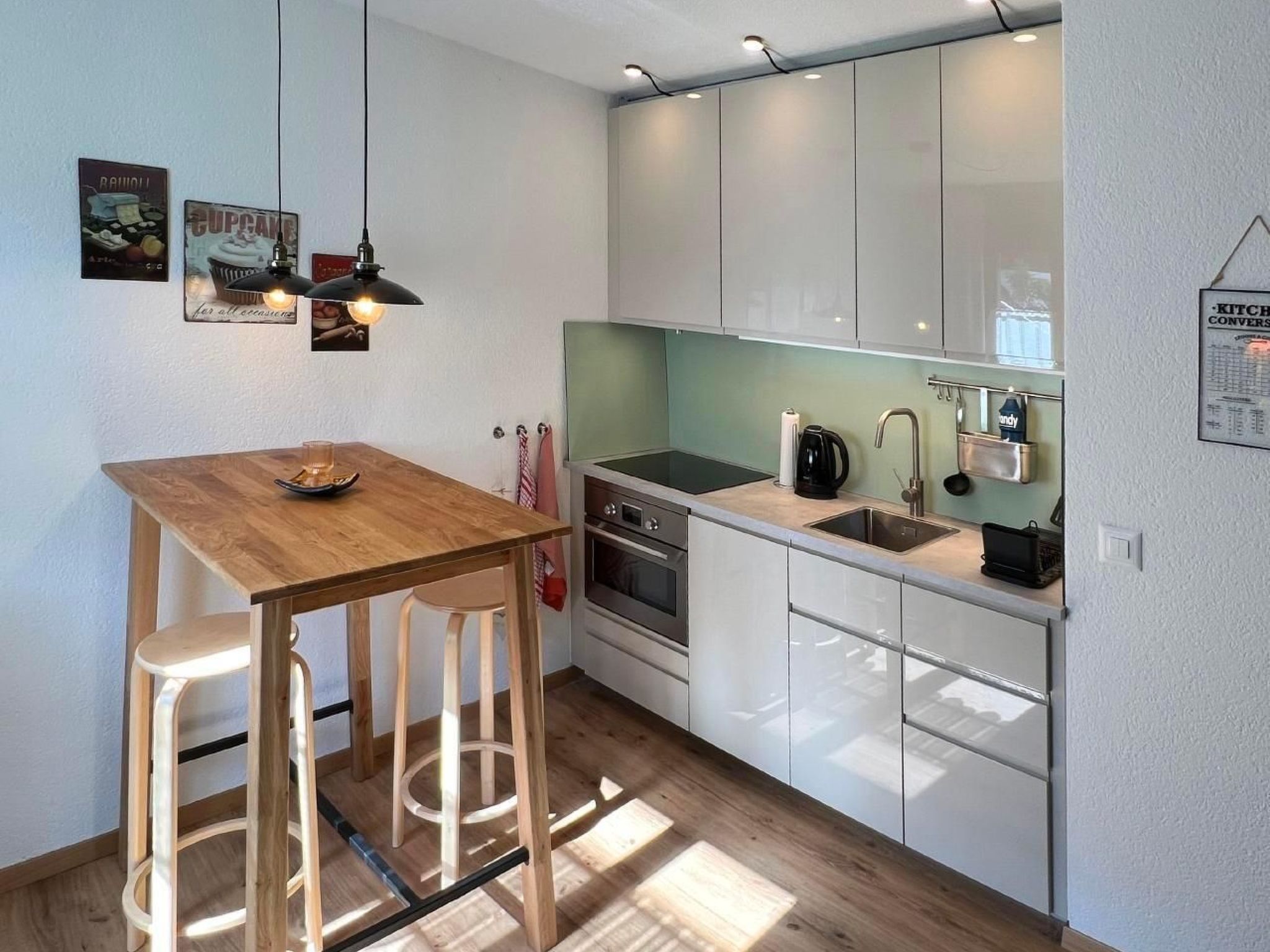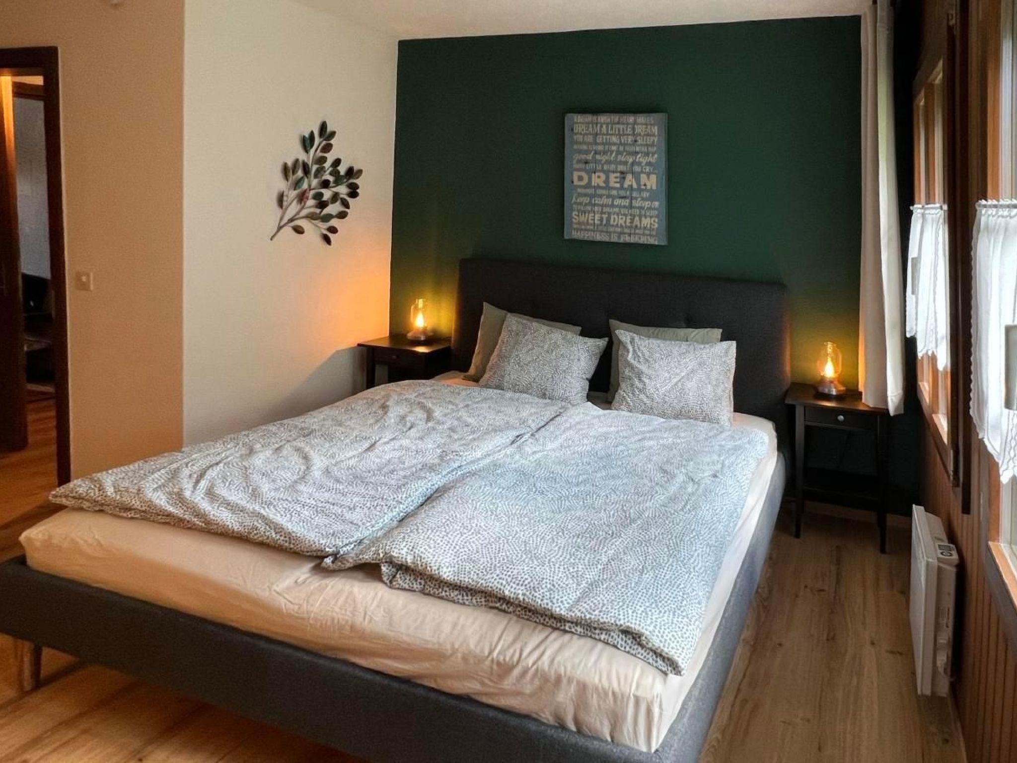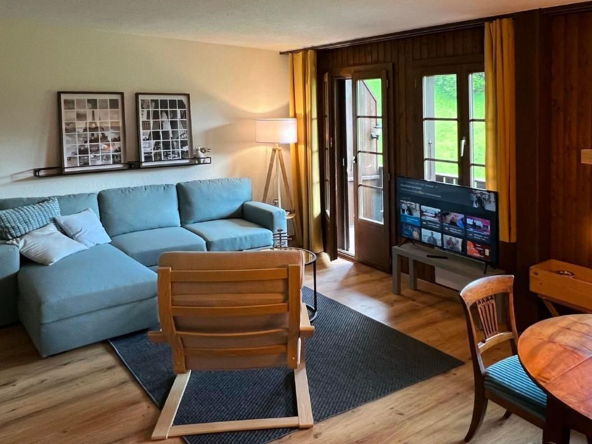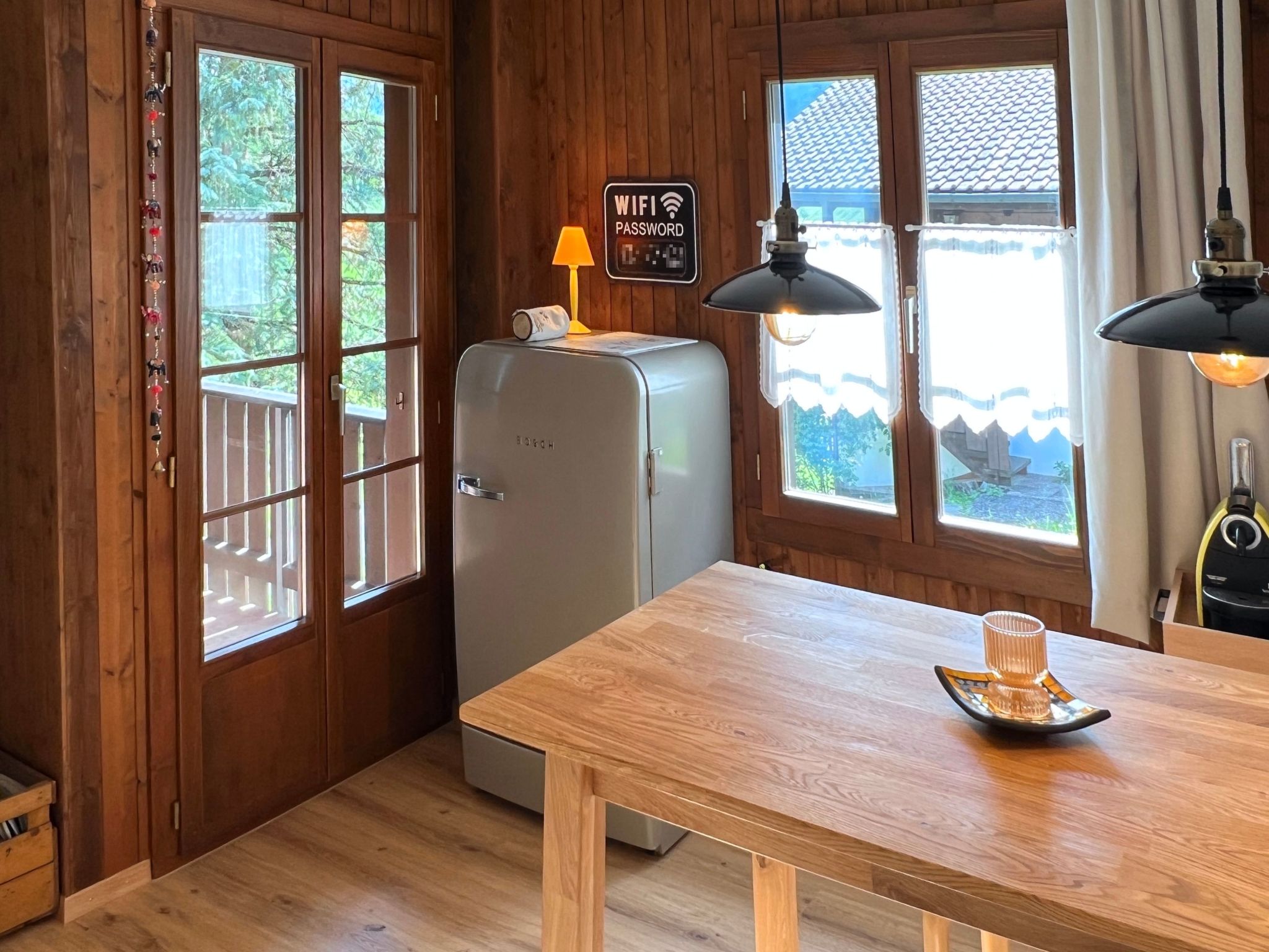 Die Ferienwohnung selbst ist eine komplett renovierte 2½-Zimmer-Wohnung in einem traditionellen Chalet, gemütlich eingerichtet mit viel Holz, einem grossen Kingsize-Bett und einer voll ausgestatteten Küche. Vom Wohnbereich und der Küche gelangst du direkt auf den sonnigen Balkon mit Ess- und Sitzgelegenheit, mit Panoramablick auf die umliegende Landschaft.