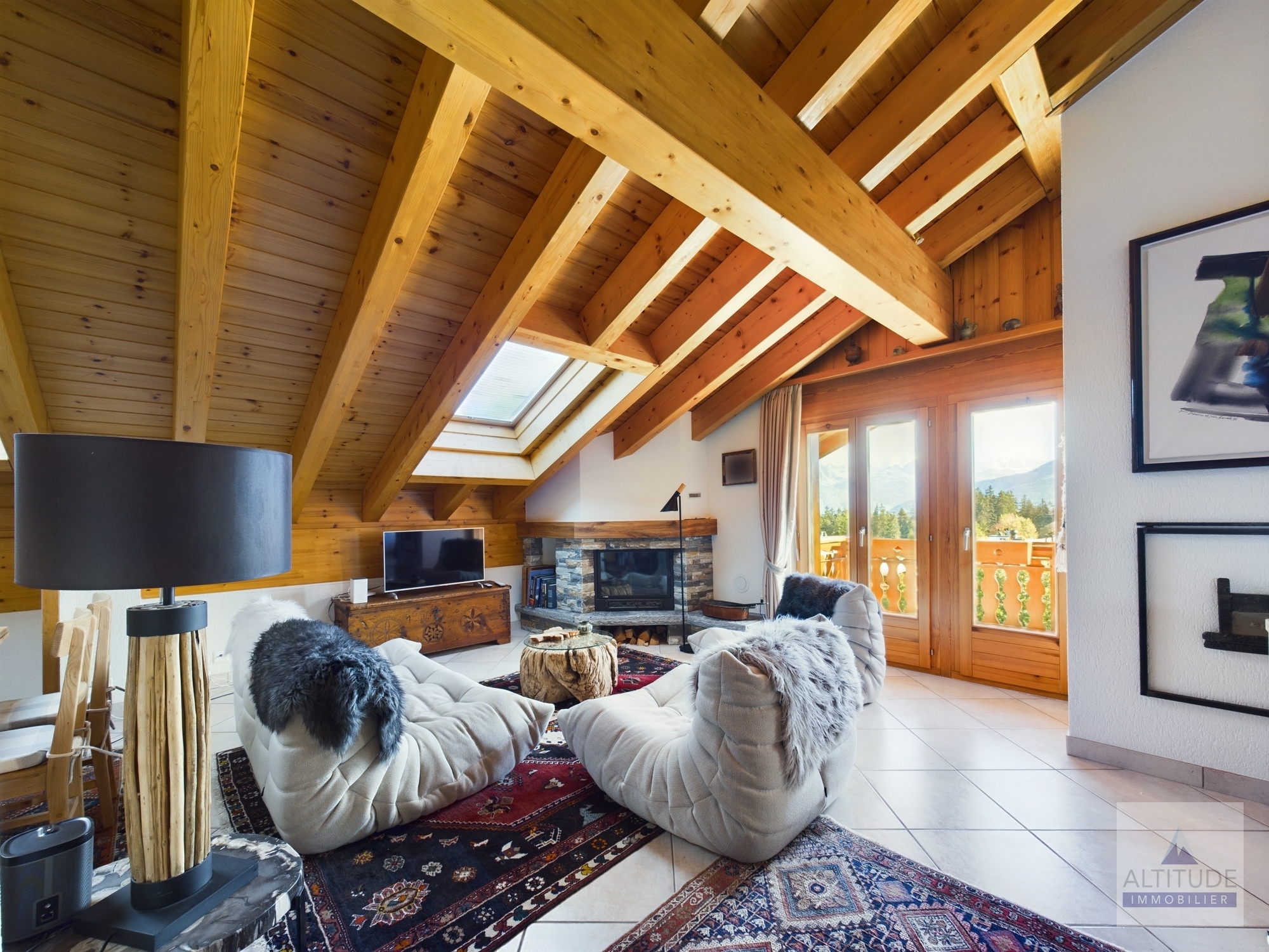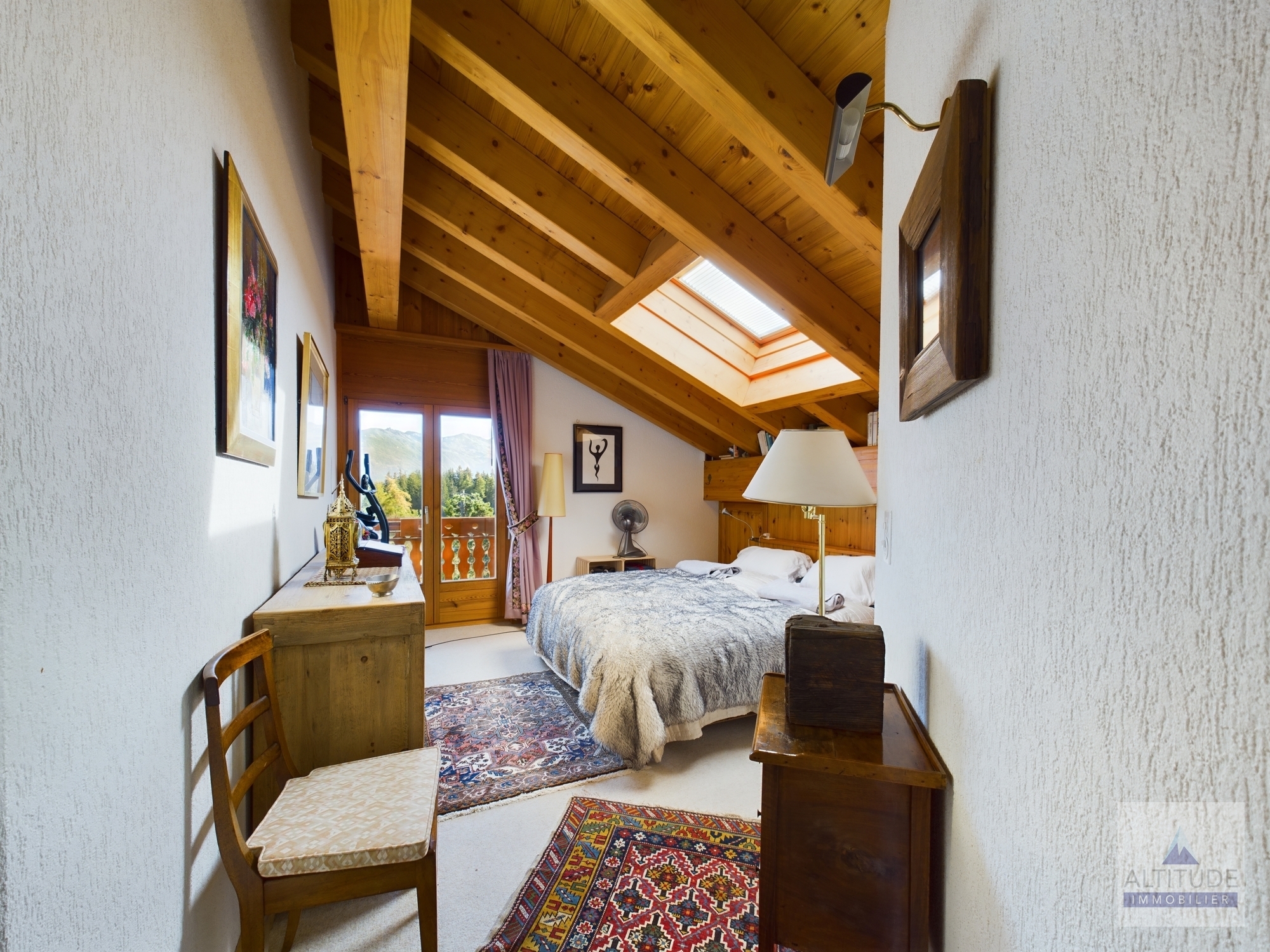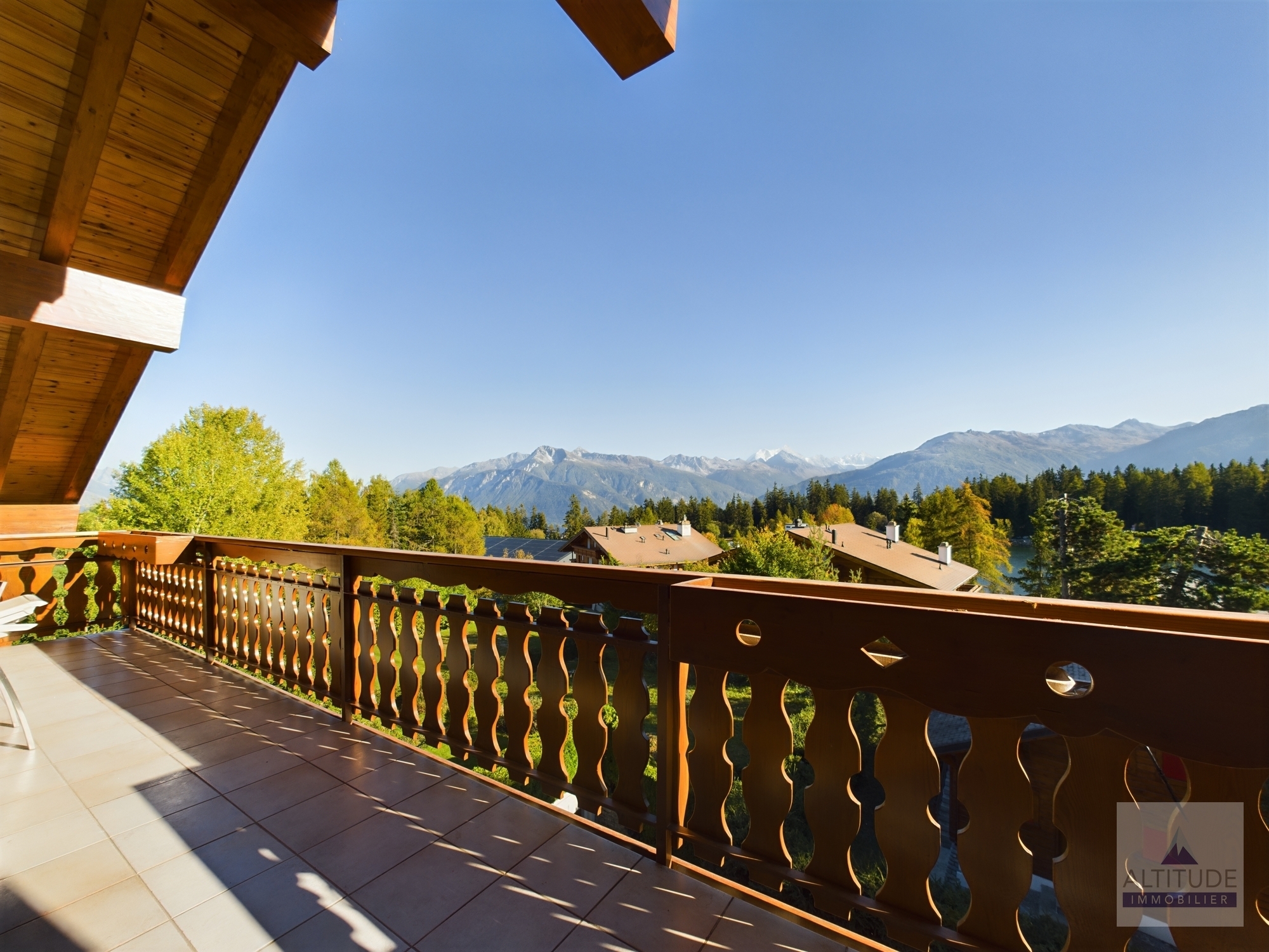Splendide appartement en attique de 110 m2 avec vue sur le Lac Moubra Chalet résidentiel, de catégorie 4 étoiles, situé proche du lac Moubra à 5 minutes à pied du centre de Crans et de Montana. Ce site offre une vue magnifique sur les Alpes, dans une nature calme et préservée. A quelques pas du parcours de Golf Jack Nicklaus et d'un parc aventure dans les arbres avec tyrolienne, diverses activités comme le nordic walking, randonnées à vélo, canyoning. En hiver, ski, randonnées en raquettes sur le golf. Cet appartement charmant et cosy est composé de :- Accès privatif avec ascenseur- Séjour lumineux et spacieux avec salle à manger, salon avec cheminée, télévision, accès au grand balcon plein sud,- Cuisine ouverte moderne complètement équipée- Chambre parentale avec lit double et salle de bain attenante avec bain, lavabo, WC - 1 chambre double avec accès au balcon nord et petite mezzanine- 1 chambre double avec accès au balcon nord- 1 salle de douche avec douche, lavabo et WCA partir de 1'221.- la première semaine A dispostion dans l'appartement : - Wi-Fi privatif- Cheminée- Télévision - Micro-ondes, four, set raclette, set fondue fromage,toaster.- Machine à café Nespresso, bouilloire .- Meubles de terrasse. A disposition dans l'immeuble : - Casiers à skis- Place de parc dans le garage souterrain- Place de parc visiteurs à l'extérieur- Sauna commun dans la résidence - Table de ping-pong commune au sous-sol