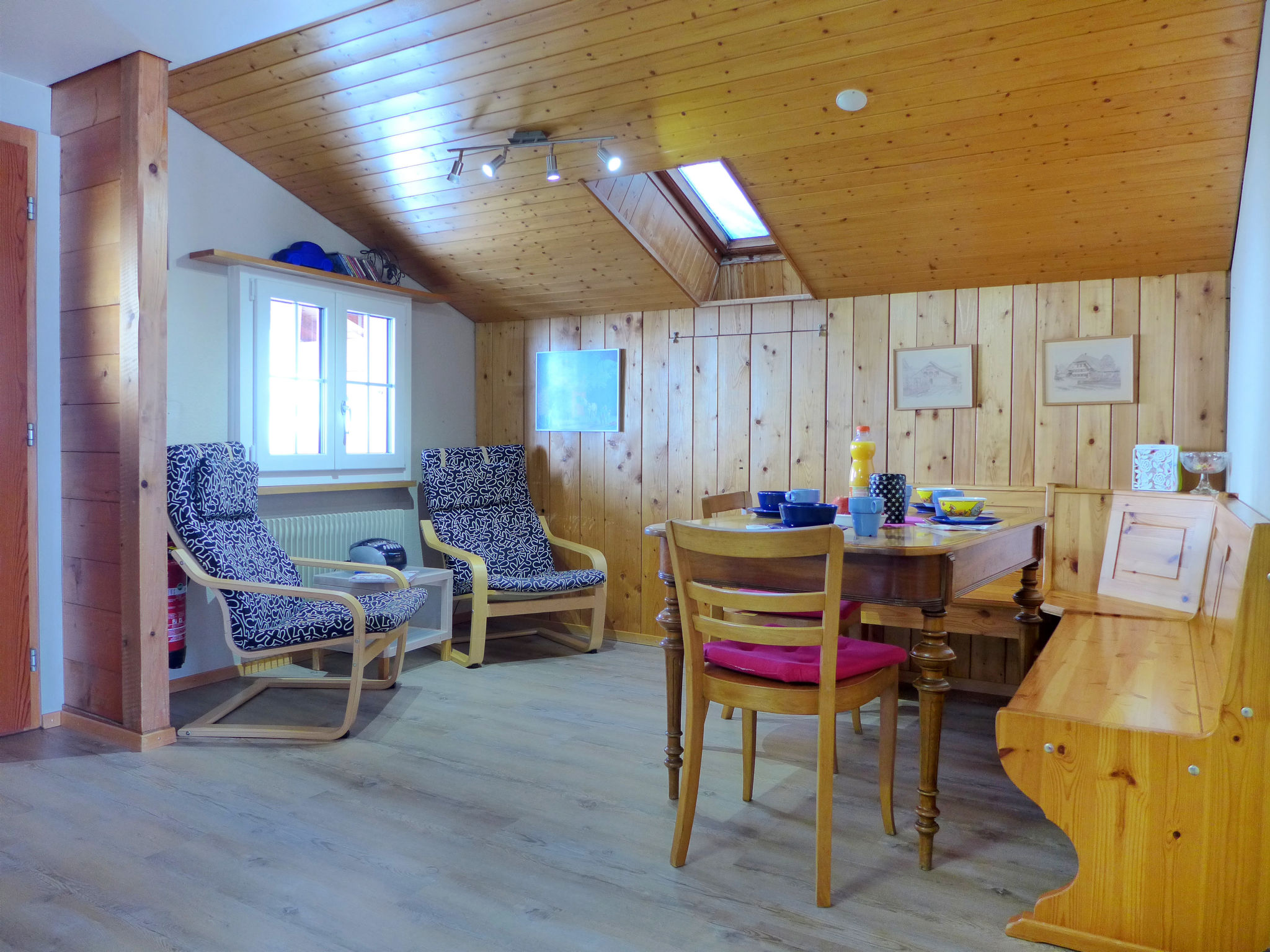 "Chalet Seeberg", 3-Zimmer-Wohnung 44 m2, im Dachgeschoss, Südostlage. Teilweise abgeschrägt, zweckmässig und gemütlich eingerichtet: offenes Wohn-/Esszimmer mit Dachfenster mit Essecke, Radio und CD. Ausgang zum Balkon. Wohn-/Schlafzimmer mit 2 Betten (90 cm, Länge 200 cm), Sat-TV (Flachbildschirm), DVD. 1 abgeschrägtes Zimmer mit 1 Doppelbett (2 x 90 cm, Länge 200 cm). Kleine Küche (3 Kochplatten, Backofen, elektrische Kaffeemaschine, Racletteofen, Fondue Set (Käse)). Dusche/WC. Kleiner Balkon 6 m2, Westlage. Schöne Sicht auf die Berge, die Landschaft und den Wald. Zur Verfügung: Bügeleisen, Kinderhochstuhl, Haartrockner. Internet (WLAN, gratis). Parkplatz (1 Auto). Bitte beachten: geeignet für Familien. Nichtraucher-Unterkunft. Maximal 2 Haustiere/Hunde erlaubt. Nur langsames Internet verfügbar.
