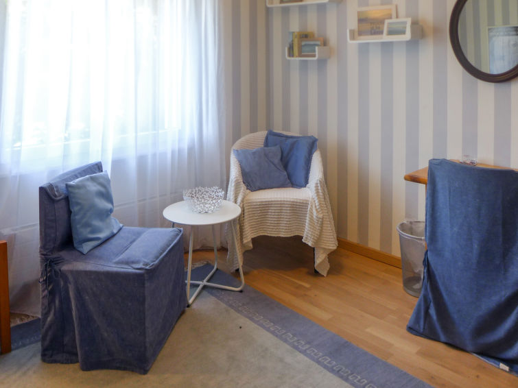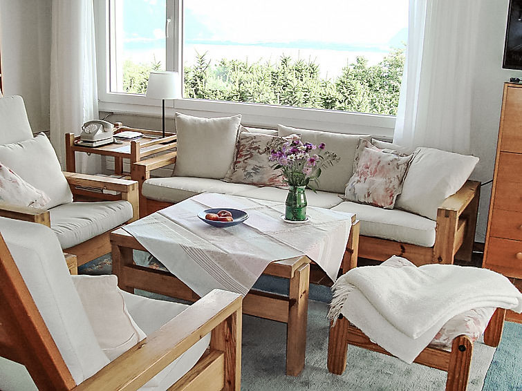 "Noisette", 4-Zimmer-Haus 100 m2 auf 2 Stockwerken, Südostlage. Objekt geeignet für 4 Erwachsene + 2 Kinder. Komfortabel und gemütlich eingerichtet: Wohn-/Esszimmer mit offenem Kamin, Essecke und Sat-TV (Flachbildschirm), Stereoanlage. Ausgang zur Terrasse, Richtung Westen. 1 Doppelzimmer mit 1 Doppelbett (160 cm, Länge 200 cm). 1 Kinderzimmer mit 1 Ausziehbett (2 Pers. 2 x 90 cm, Länge 190 cm). Kleine Küche (Backofen, Geschirrspüler, 4 Glaskeramikplatten, Toaster, Mikrowelle, elektrische Kaffeemaschine, Kapseln für die Kaffeemaschine (Nespresso)). Bad/WC. Unteres Geschoss: 1 Zimmer mit 2 Betten (90 cm, Länge 190 cm). Sep. WC. Terrasse 7 m2, Westlage, Gartensitzplatz. Terrassenmöbel. Herrliche Sicht auf den See und die Landschaft. Zur Verfügung: Waschmaschine, Kinderhochstuhl, Babybett (extra). Internet (Wireless LAN, gratis). Bitte beachten: Nichtraucher-Unterkunft. Nur für Urlaubsgäste. CH1801.11