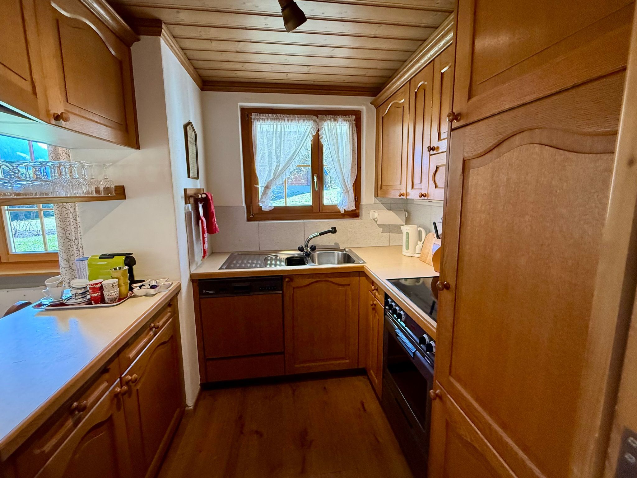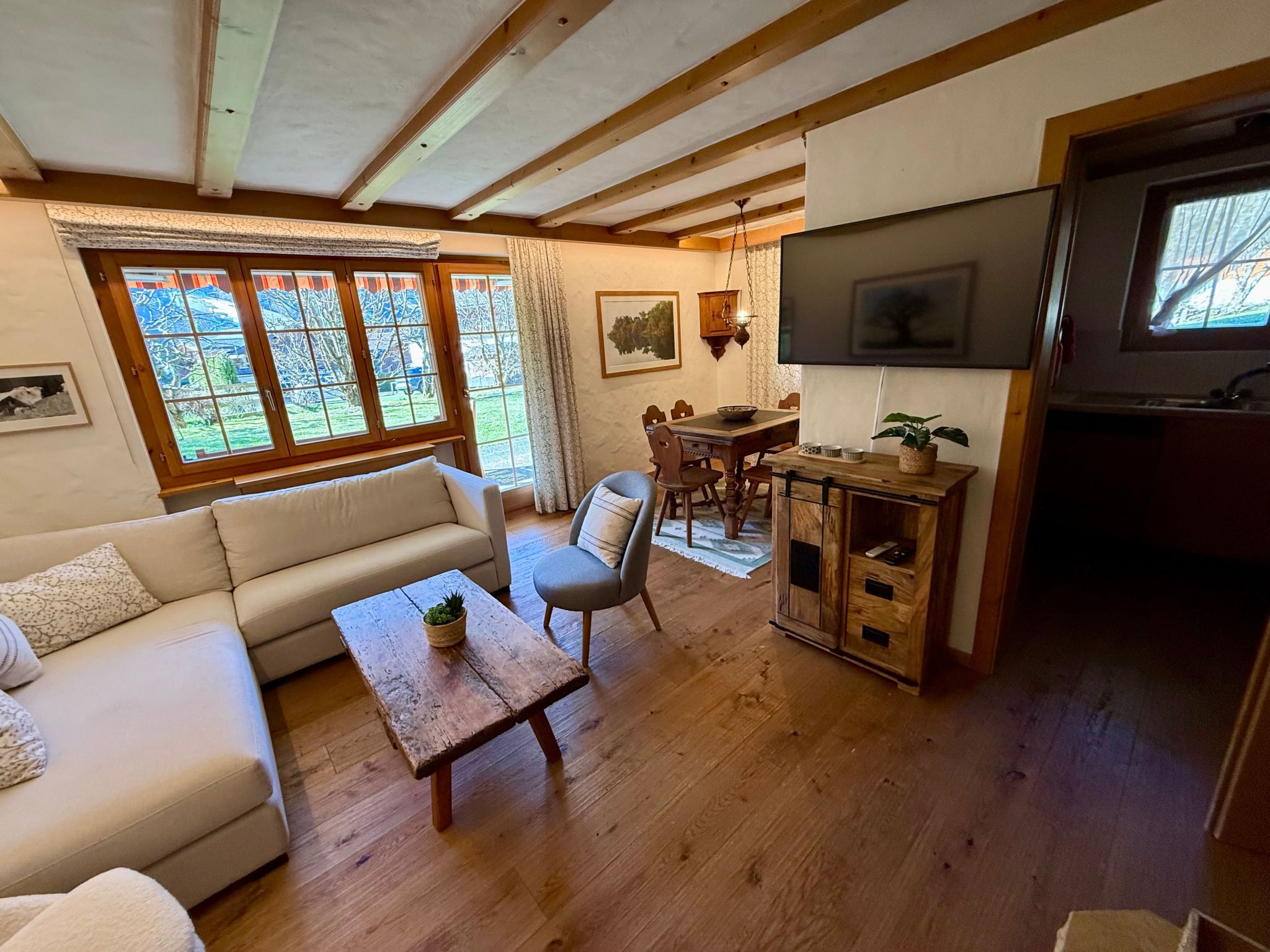Der Außenbereich der Wohnung ist ein echtes Highlight. Die Terrasse und der Garten in Südlage sind nicht nur gut besonnt, sondern bieten auch einen atemberaubenden Blick auf die Videmanette. Es ist der perfekte Ort, um bei einem Glas Wein zu entspannen oder ein Essen im Freien zu genießen, während Sie die malerische Landschaft auf sich wirken lassen.