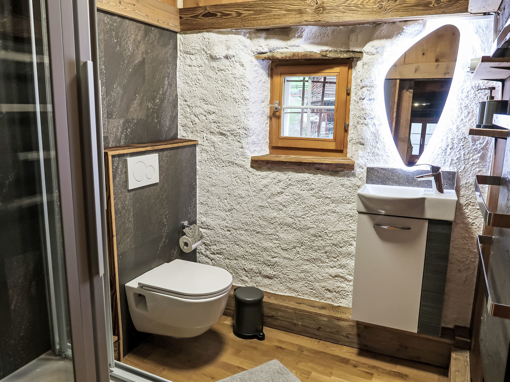 6-Zimmer-Wohnung 110 m2 auf 2 Stockwerken. Rustikal und gemütlich eingerichtet: Wohnzimmer, Deckenhöhe 160 - 190 cm, niedrige Türrahmen, Höhe 160 cm mit Kabel-TV (Flachbildschirm), E-Heizofen. Esszimmer mit Holzofen. Küche (Backofen, Geschirrspüler, 4 Induktionskochplatten, Mikrowelle, Tiefkühler). Dusche/WC. E-Heizung, Holzheizung, Boiler (150 Liter), Specksteinofen. Obergeschoss: (steile Treppe) 2 Doppelzimmer, Deckenhöhe 160 - 180 cm, niedrige Türrahmen, Höhe 160 cm. 1 Zimmer, Deckenhöhe 160 - 180 cm, niedrige Türrahmen, Höhe 160 cm mit 2 Betten. 1 Zimmer, Deckenhöhe 160 - 180 cm, niedrige Türrahmen, Höhe 160 cm mit 2 x 2 Etagenbetten. Dusche/WC. Terrasse 20 m2. Schöne Sicht auf die Berge, das Tal und die Landschaft. Zur Verfügung: Kinderhochstuhl, Babybett. Internet (Wireless LAN, gratis). Parkplatz beim Haus. Bitte beachten: geeignet für Familien. Nichtraucher-Unterkunft. Zugang zum Zimmer mit Etagenbetten durch Doppelzimmer.