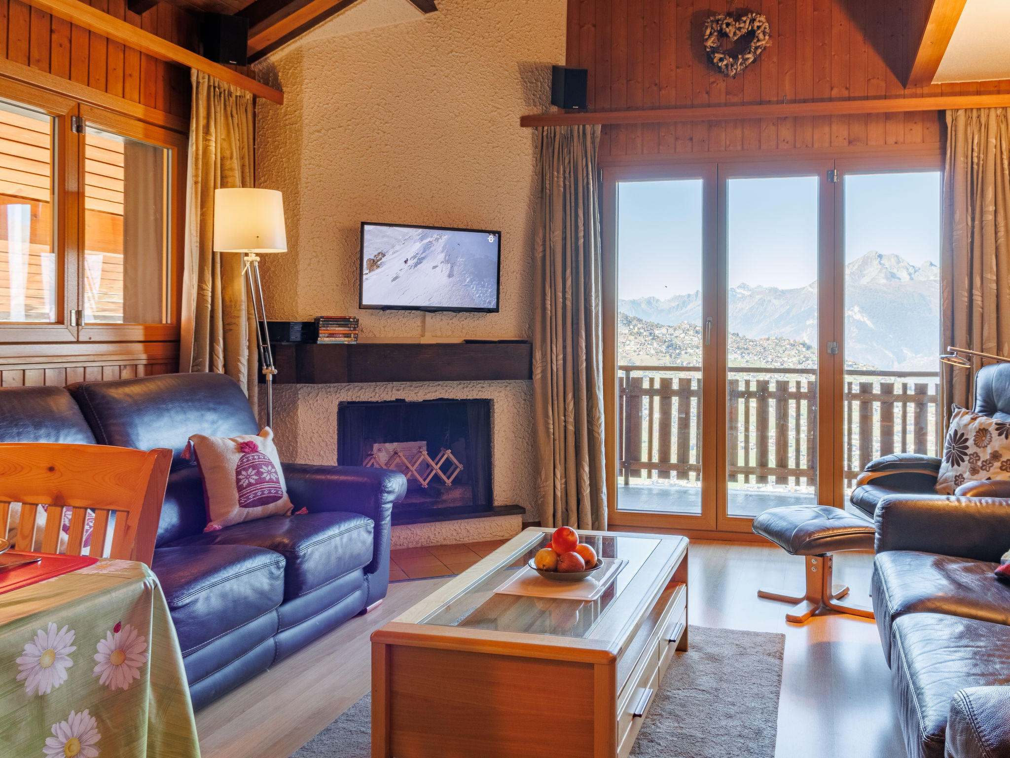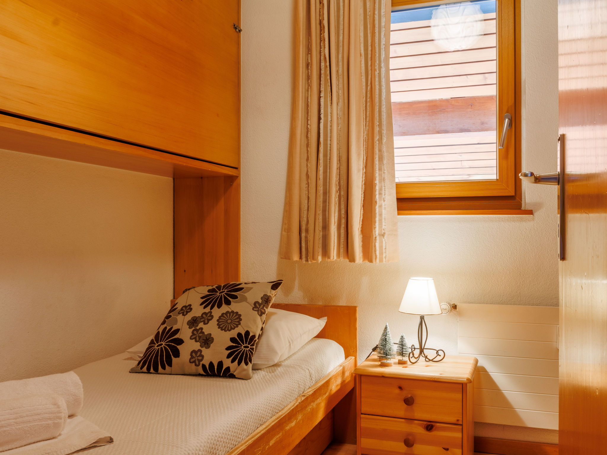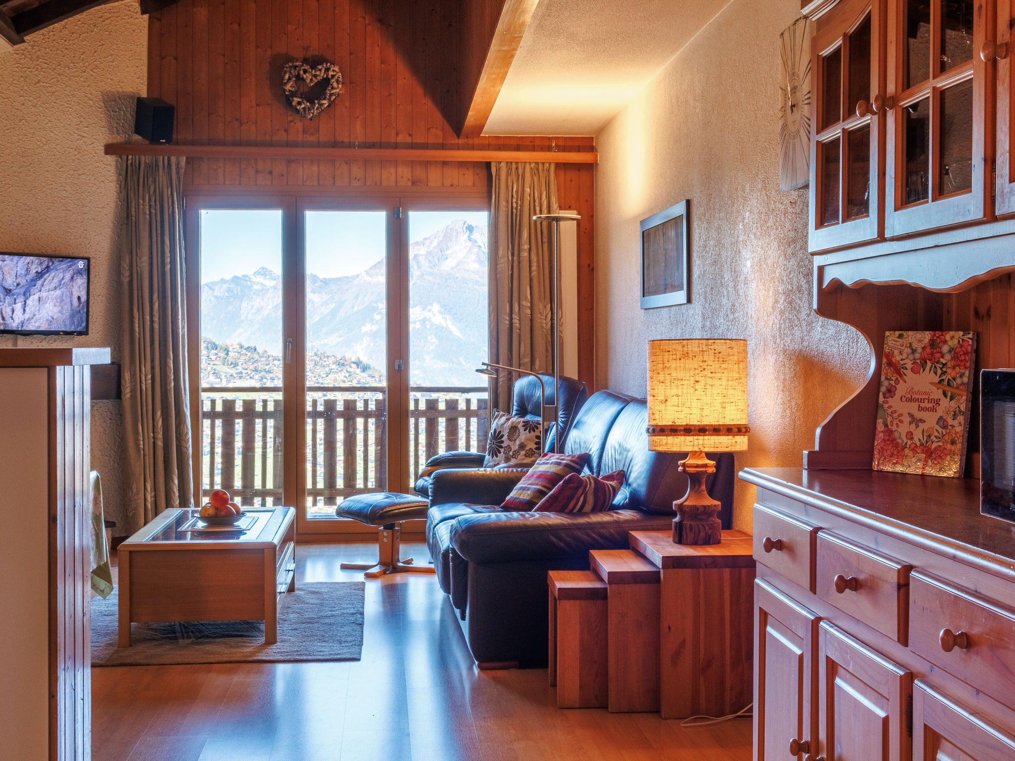 "Hortensia 33", 4-Zimmer-Attikawohnung 70 m2 im 3. Stock. Objekt geeignet für 4 Erwachsene + 2 Kinder. Teilweise renoviert, schön eingerichtet: Eingang. Wohn-/Esszimmer mit offenem Kamin (nur Deko), Kabel-TV und DVD. Ausgang zum Balkon, Richtung Westen und Richtung Osten. 1 Zimmer mit 2 Betten. Ausgang zum Balkon, Richtung Osten. 1 Zimmer mit 2 Betten. 1 Kinderzimmer mit 1 x 2 Etagenbetten. Offene Küche (Backofen, Geschirrspüler, 4 Induktionskochplatten, Toaster, Wasserkocher, Mikrowelle, elektrische Kaffeemaschine, Fondue Set (Käse)). Bad/WC, Dusche/WC. 2 Balkone. Balkonmöbel. Sehr schöne Sicht auf die Berge und das Tal. Zur Verfügung: Haartrockner. Internet (WLAN, gratis). Bitte beachten: Nichtraucher-Unterkunft, kein Parkplatz.