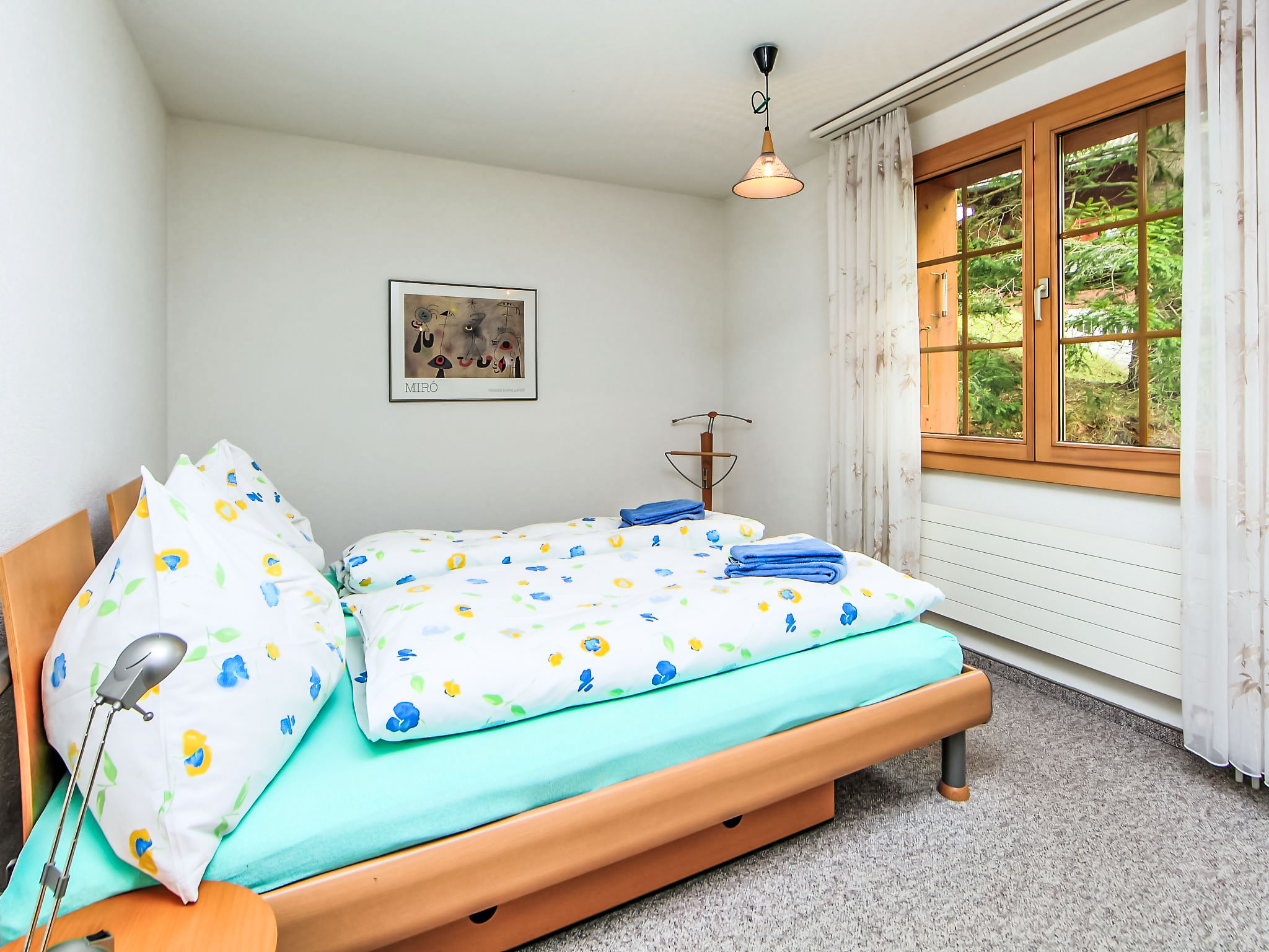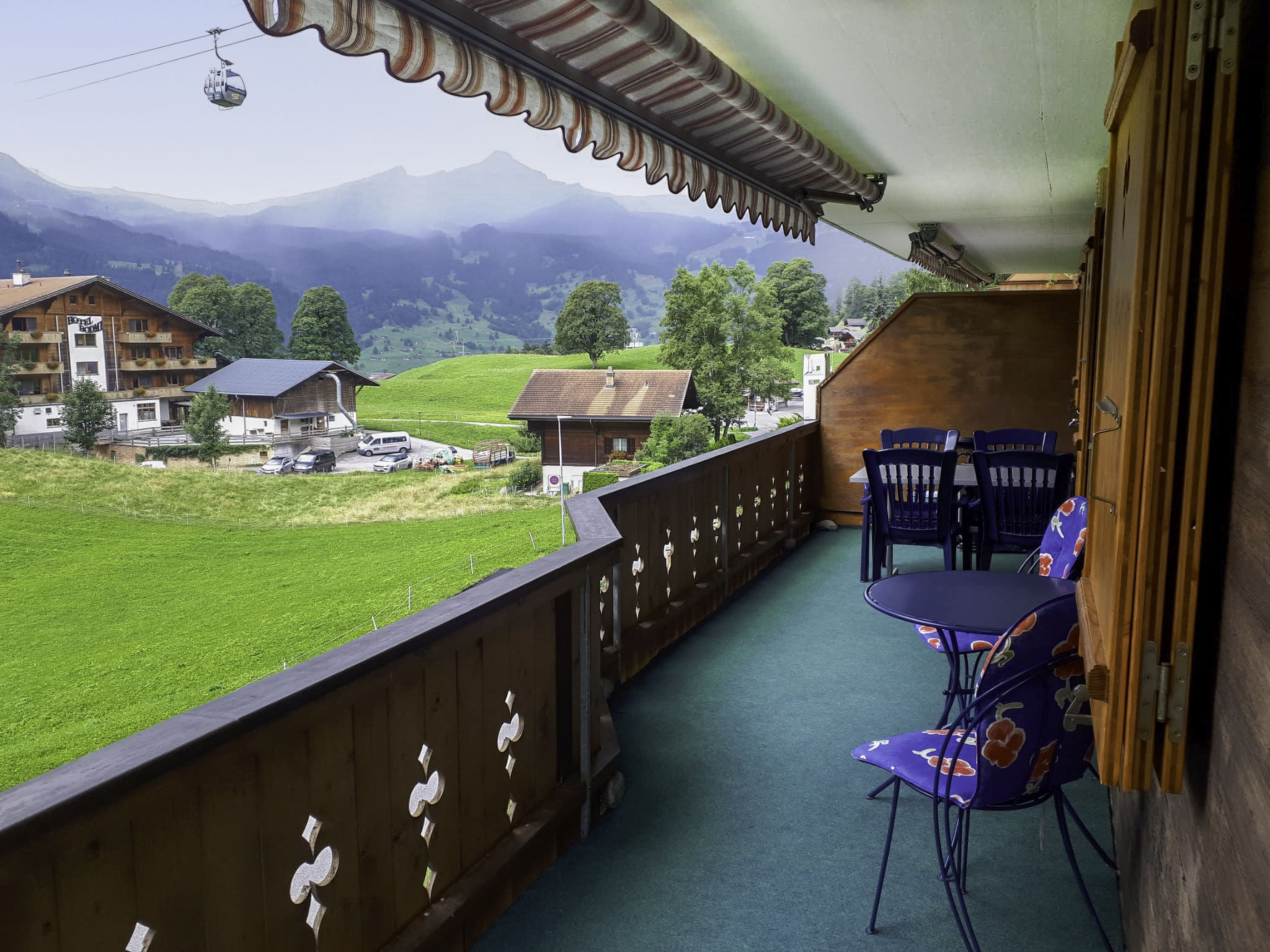 3-Zimmer-Wohnung 70 m2, Südlage. Schön und gemütlich eingerichtet: Wohn-/Esszimmer mit Schwedenofen und Kabel-TV (Flachbildschirm), Radio. Ausgang zum Balkon, Richtung Süden und Richtung Westen. 1 Zimmer mit 1 Bett (160 cm, Länge 200 cm). 1 Zimmer mit 1 x 2 Etagenbetten (90 cm, Länge 200 cm). Offene Küche (Backofen, Geschirrspüler, 4 Glaskeramikplatten, Toaster, Wasserkocher, elektrische Kaffeemaschine, Fondue Set (Käse)). Bad/WC. Balkon 20 m2, Südlage und Westlage. Balkonmöbel. Herrliche Sicht auf die Berge und Eigernordwand. Zur Verfügung: Holz (extra). Internet (Wireless LAN, gratis). Garage Nr. 21, Höhe 200 cm. Bitte beachten: Nichtraucher-Unterkunft. Feuerlöscher.