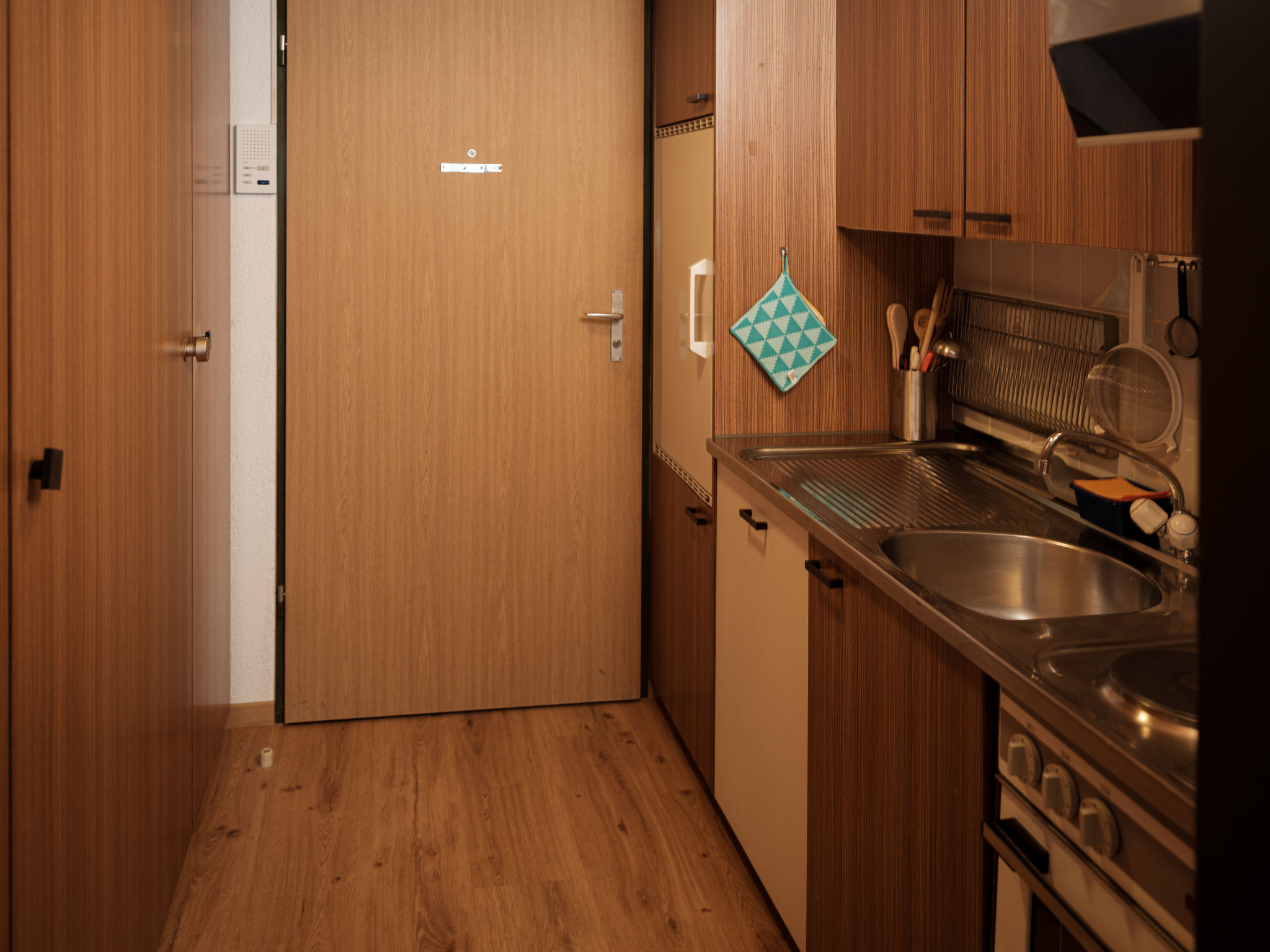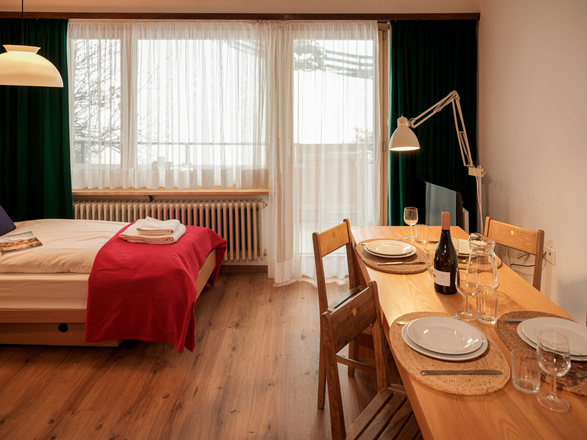 "Silence", 1-Zimmer-Wohnung 40 m2, im Erdgeschoss. Geräumig, einfach und komfortabel eingerichtet: Wohn-/Schlafzimmer mit 2 Betten (90 cm, Länge 190 cm), TV. Ausgang zum Balkon. Küche (3 Kochplatten, Backofen, Geschirrspüler, Toaster, Wasserkocher, Tiefkühler, elektrische Kaffeemaschine). Bad/WC. Balkon. Sehr schöne Sicht auf das Matterhorn. Zur Verfügung: Internet (Wireless LAN, gratis). Bitte beachten: Nichtraucher-Unterkunft.