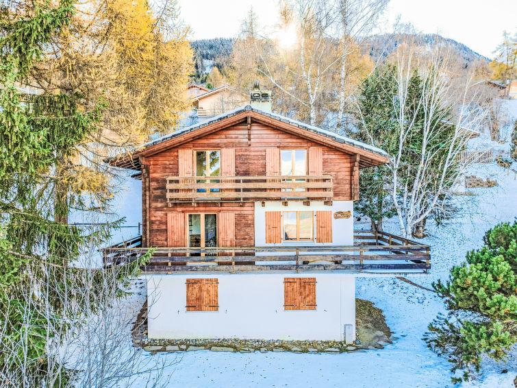 "Les Etoiles", 5-Zimmer-Chalet 170 m2 auf 3 Stockwerken. Wohn-/Esszimmer mit offenem Kamin und Kabel-TV. Ausgang zur Terrasse. Offene Küche (Backofen, Geschirrspüler, 4 Induktionskochplatten, Toaster, Wasserkocher, Mikrowelle, elektrische Kaffeemaschine, Kapseln für die Kaffeemaschine (NESPRESSO) extra, Racletteofen, Fondue Set (Käse)). Sep. WC. Heizung. Unteres Geschoss: Dusche/WC. Obergeschoss: 1 abgeschrägtes kleines Zimmer mit 2 Betten (90 cm, Länge 200 cm), Waschbecken. 1 abgeschrägtes kleines Zimmer mit 2 Betten (90 cm, Länge 200 cm), Waschbecken. 2 Zimmer, jedes Zimmer mit 1 Doppelbett (2 x 90 cm, Länge 200 cm). Ausgang zum Balkon, Richtung Norden. Bad, Dusche/WC. Balkon, Nordlage, Terrasse, Westlage. Gartengrill, Abstellkammer. Sicht auf das Tal. Zur Verfügung: Waschmaschine, Kinderhochstuhl, Babybett. Internet (WLAN, gratis). Parkplatz Nr. 9 Prachalier (überdacht) in 500 m, Höhe 210 cm, Breite 220 cm. Bitte beachten: Nichtraucher-Unterkunft. Maximal 1 Haustier/Hund erlaubt.