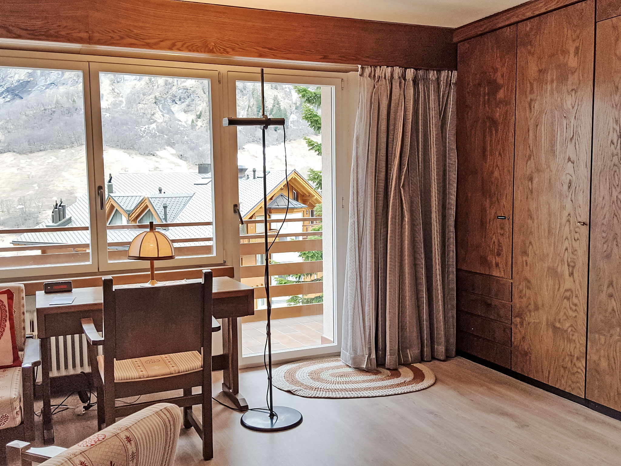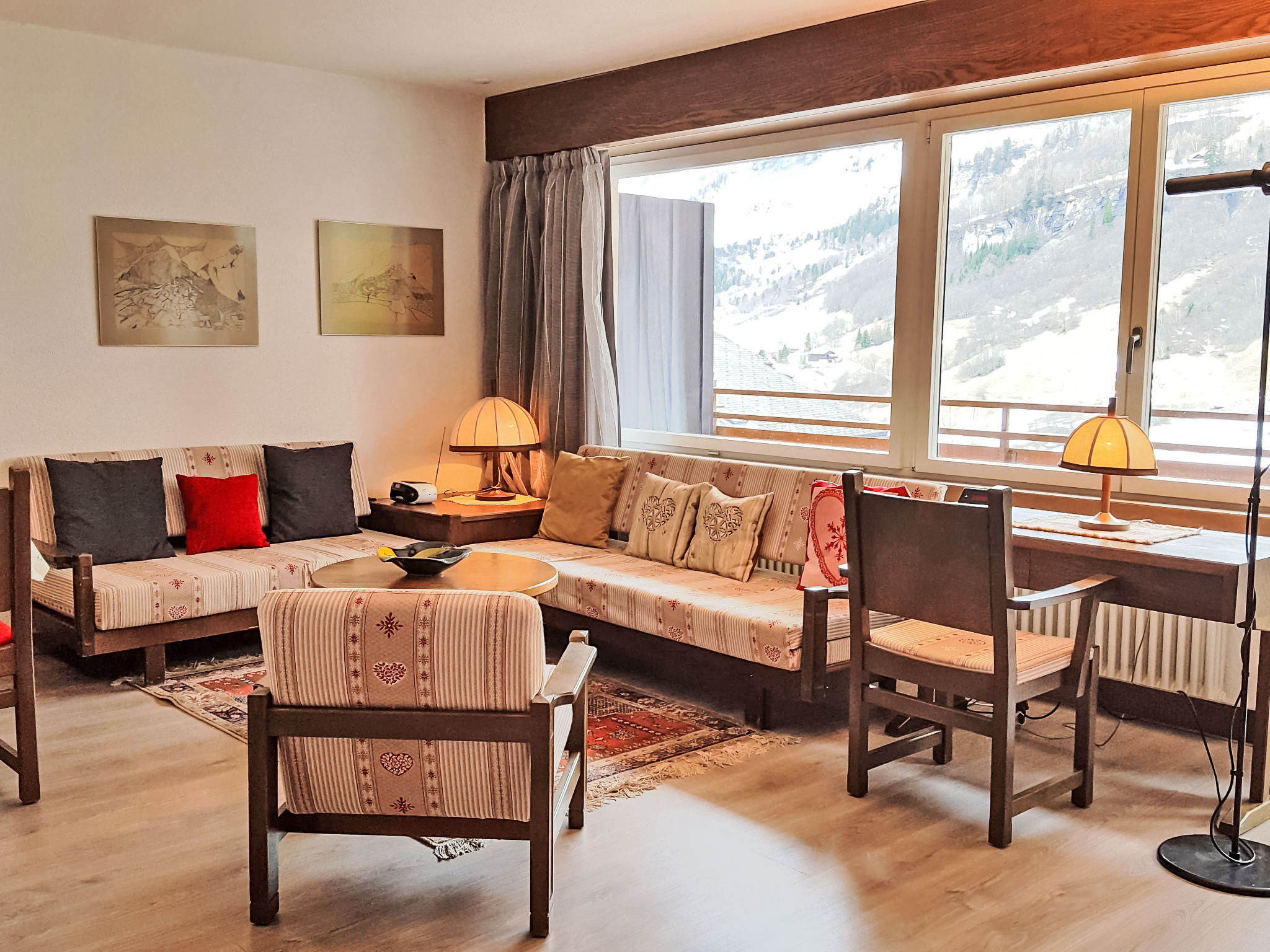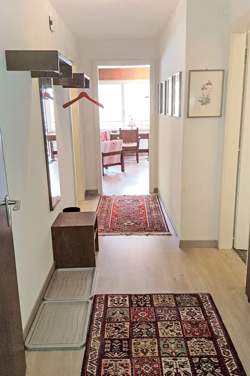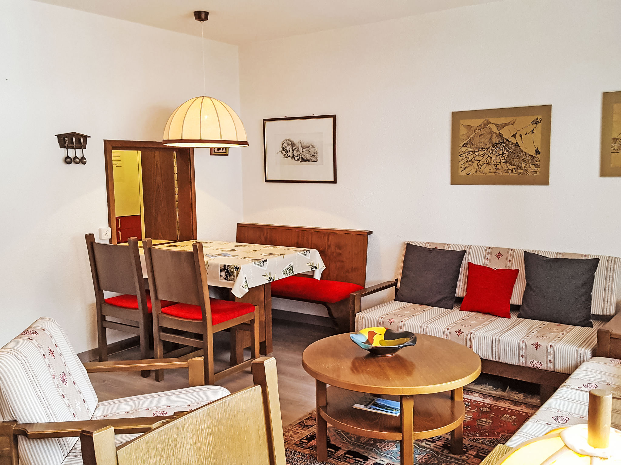 "Ringstrasse Apt 122", 1-Zimmer-Wohnung 54 m2 im 1. Stock. Zweckmässig eingerichtet: Wohn-/Esszimmer mit 2 Wandschrankbetten und Kabel-TV (Flachbildschirm). Ausgang zum Balkon. Schlafnische mit Vorhang mit 2 Betten. Küche (4 Glaskeramikplatten, Mikrowelle, elektrische Kaffeemaschine, Kapseln für die Kaffeemaschine (Nespresso) extra). Bad/WC. Balkon. Terrassenmöbel. Sicht auf die Berge, das Tal und die Landschaft. Zur Verfügung: Internet (WLAN, gratis). Bitte beachten: Nichtraucher-Unterkunft. Anstelle eines abgeschlossenen Schlafzimmers befinden sich manche Schlafplätze in einem offenen Bereich (Galerie, Nische etc.).