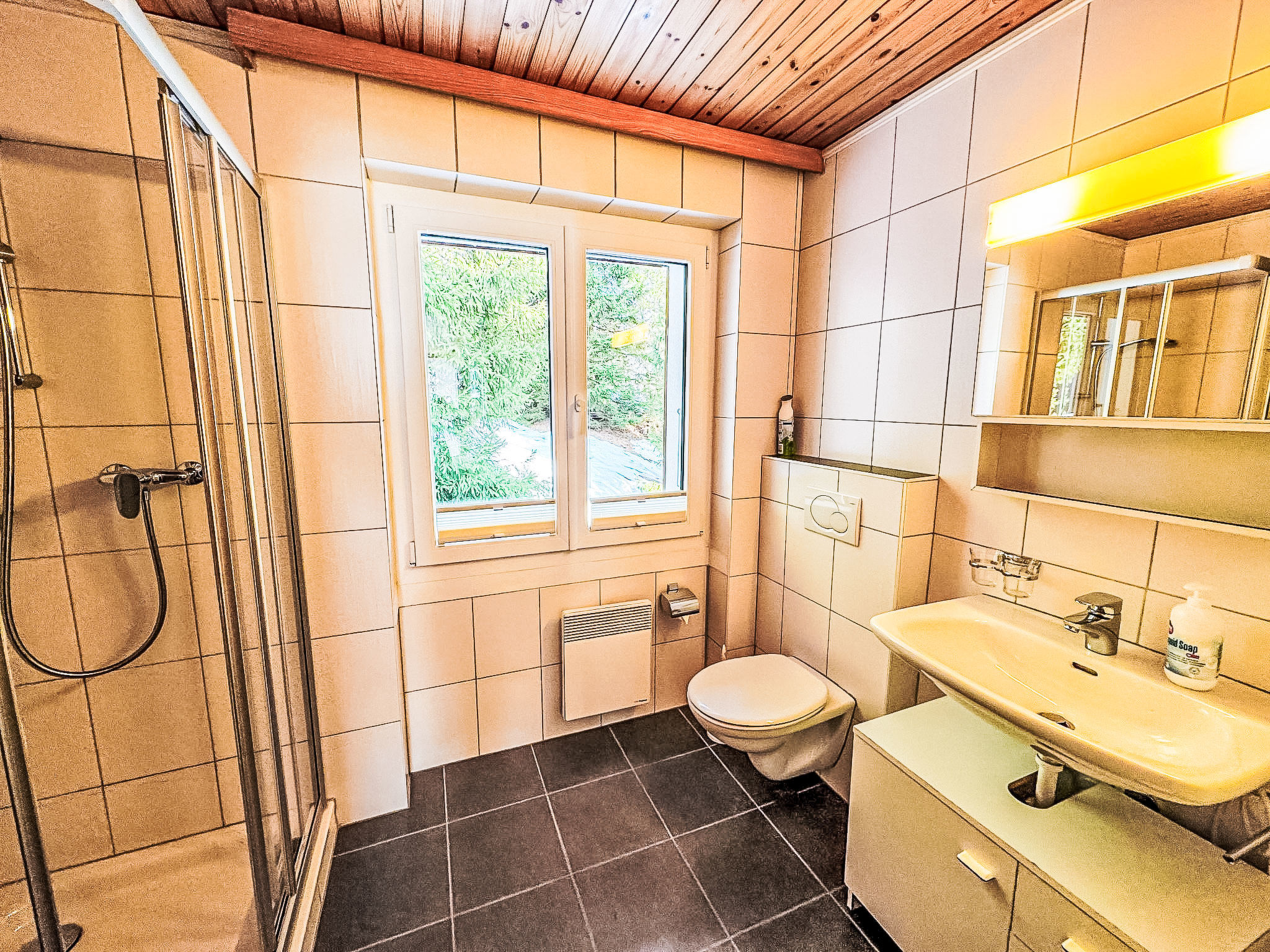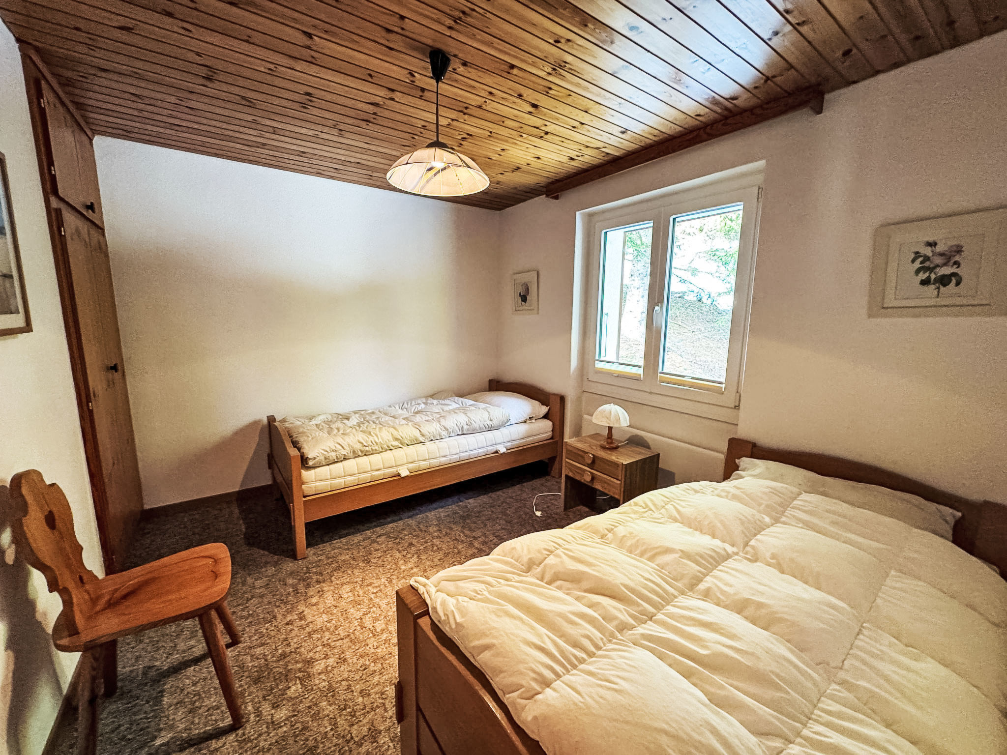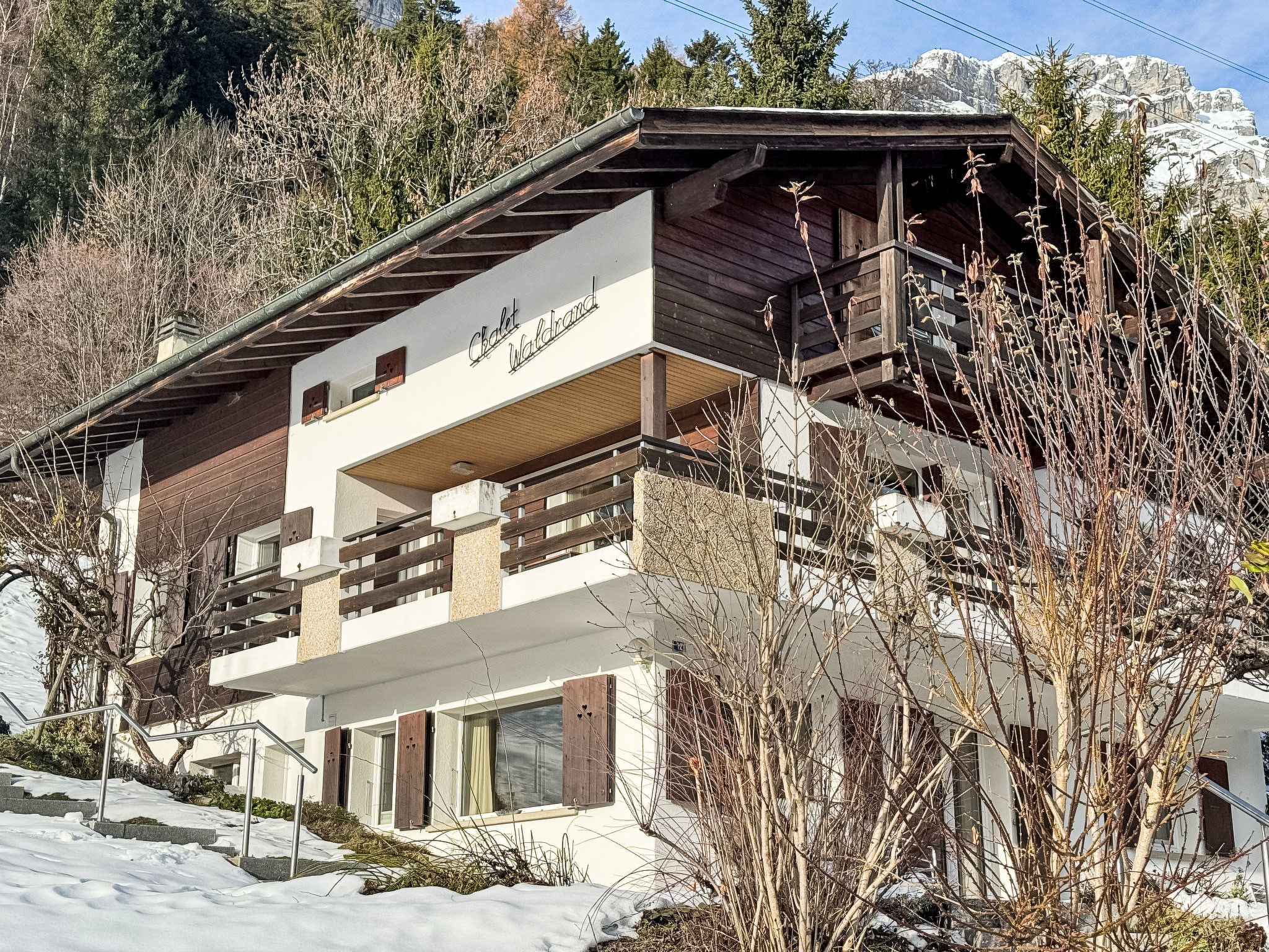 "Waldrand", 3-Zimmer-Wohnung 85 m2 im 1. Stock. Geräumig und hell, geschmackvoll und gemütlich eingerichtet: grosses Wohn-/Schlafzimmer mit Digital-TV und E-Heizung. Ausgang zum Balkon. 1 Doppelzimmer mit 2 Betten (90 cm, Länge 200 cm). 1 Zimmer mit 2 Betten (90 cm, Länge 200 cm). Küche (3 Kochplatten, Backofen, Toaster, Wasserkocher, elektrische Kaffeemaschine, Racletteofen, Fondue Set (Käse)). Dusche/WC. E-Heizung. Grosser Balkon. Balkonmöbel. Sehr schöne Sicht auf die Berge und die Ortschaft. Zur Verfügung: Haartrockner. Internet (WLAN, gratis). Bitte beachten: Nichtraucher-Unterkunft.