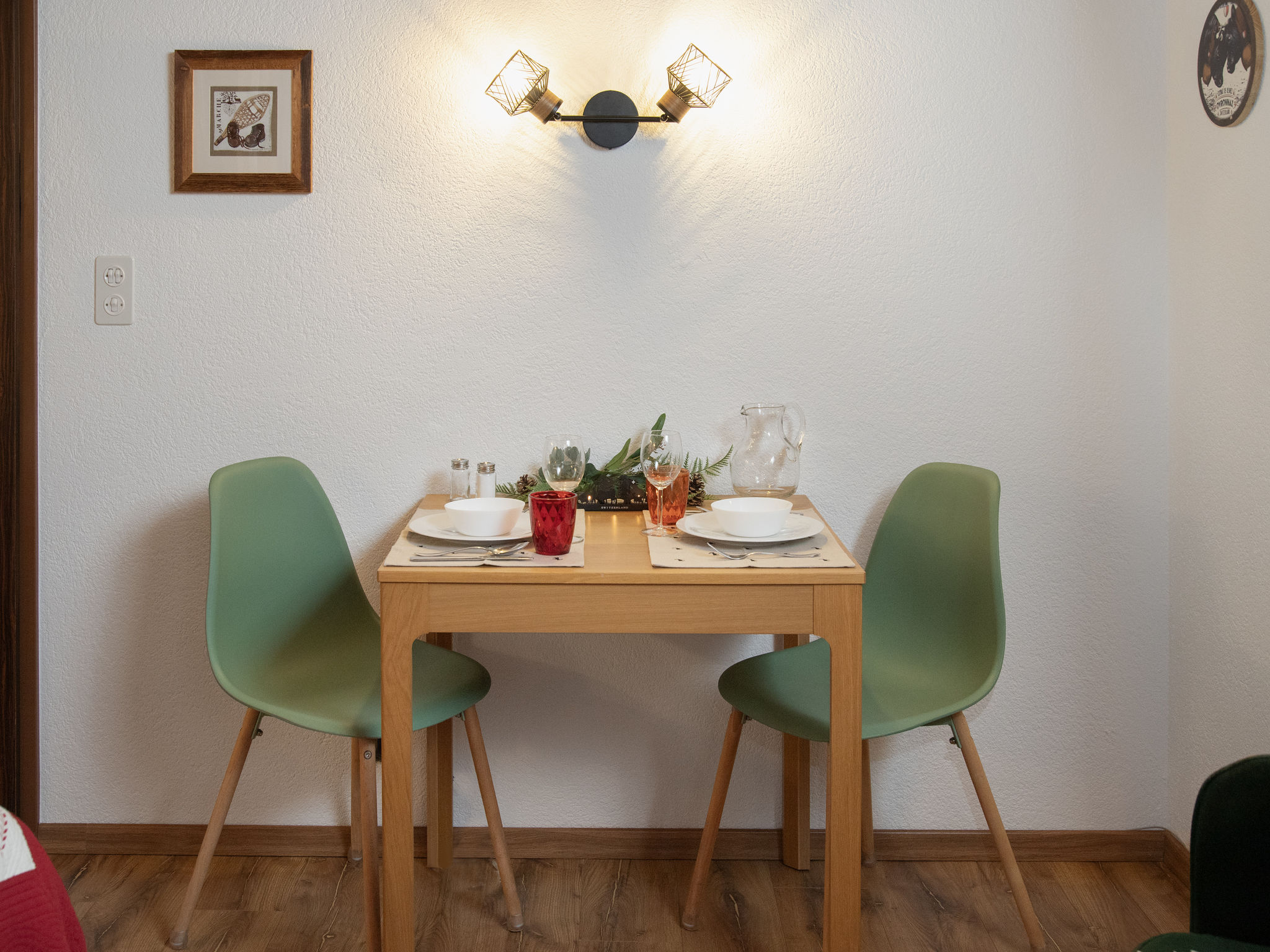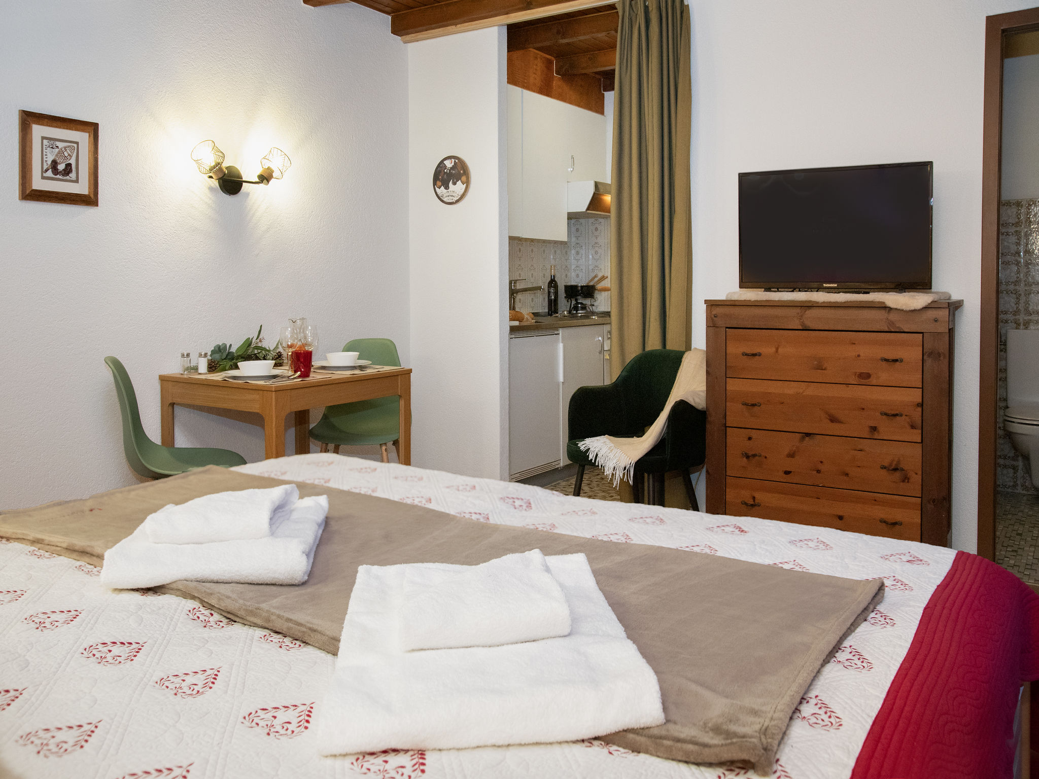 "L'Eden 10", 1-Zimmer-Studio 21 m2 im 3. Stock, Südwestlage. Zweckmässig und komfortabel eingerichtet: Wohn-/Schlafzimmer mit 2 Betten (90 cm, Länge 200 cm), Essecke, Kabel-TV und Internationale TV-Sender. Ausgang zum Balkon, Richtung Südwesten. Kleine, offene Küche (3 Kochplatten, Backofen, Toaster, Wasserkocher, elektrische Kaffeemaschine, Kapseln für die Kaffeemaschine (Tassimo), Racletteofen, Fondue Set (Käse)). Dusche/WC. Kleiner Balkon, Südwestlage. Balkonmöbel. Sicht auf die Berge. Zur Verfügung: Internet (WLAN, gratis). Parkplatz (1 Auto). Bitte beachten: Nichtraucher-Unterkunft.