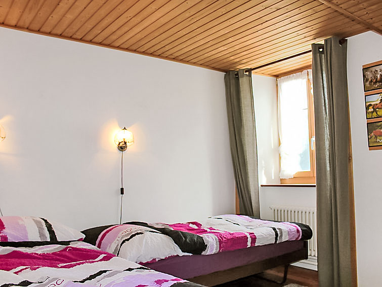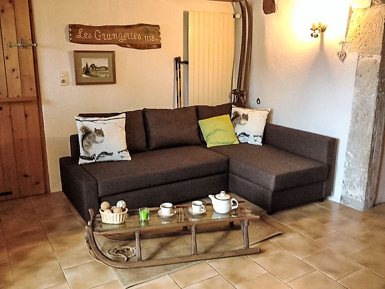 "Les Grangettes", 3-Zimmer-Wohnung 68 m2, im Erdgeschoss. Zweckmässig und schön eingerichtet: Wohnzimmer mit 1 Diwanbett (120 cm, Länge 190 cm), TV, Flachbildschirm und DVD. 1 Zimmer mit 1 franz. Bett (1 x 160 cm, Länge 190 cm). 1 Zimmer mit 2 Betten (90 cm, Länge 190 cm). Wohnküche (4 Kochplatten, Backofen, Toaster, Wasserkocher, elektrische Kaffeemaschine, Kapseln für die Kaffeemaschine (Nespresso et Filtre), Racletteofen, Fondue Set (Käse)) mit Esstisch, offenem Kamin, Esstisch und Radio. Dusche/WC. Grosser Garten. Terrassenmöbel, Abstellkammer. Sehr schöne Sicht auf die Berge und die Landschaft. Zur Verfügung: Waschmaschine, Kinderhochstuhl, Babybett bis 2 Jahre, Haartrockner, Holz (gratis). Internet (Wireless LAN, gratis). Parkplatz (eingezäunt) beim Haus. Bitte beachten: Maximal 1 Haustier/Hund erlaubt. Eigener Eingang.