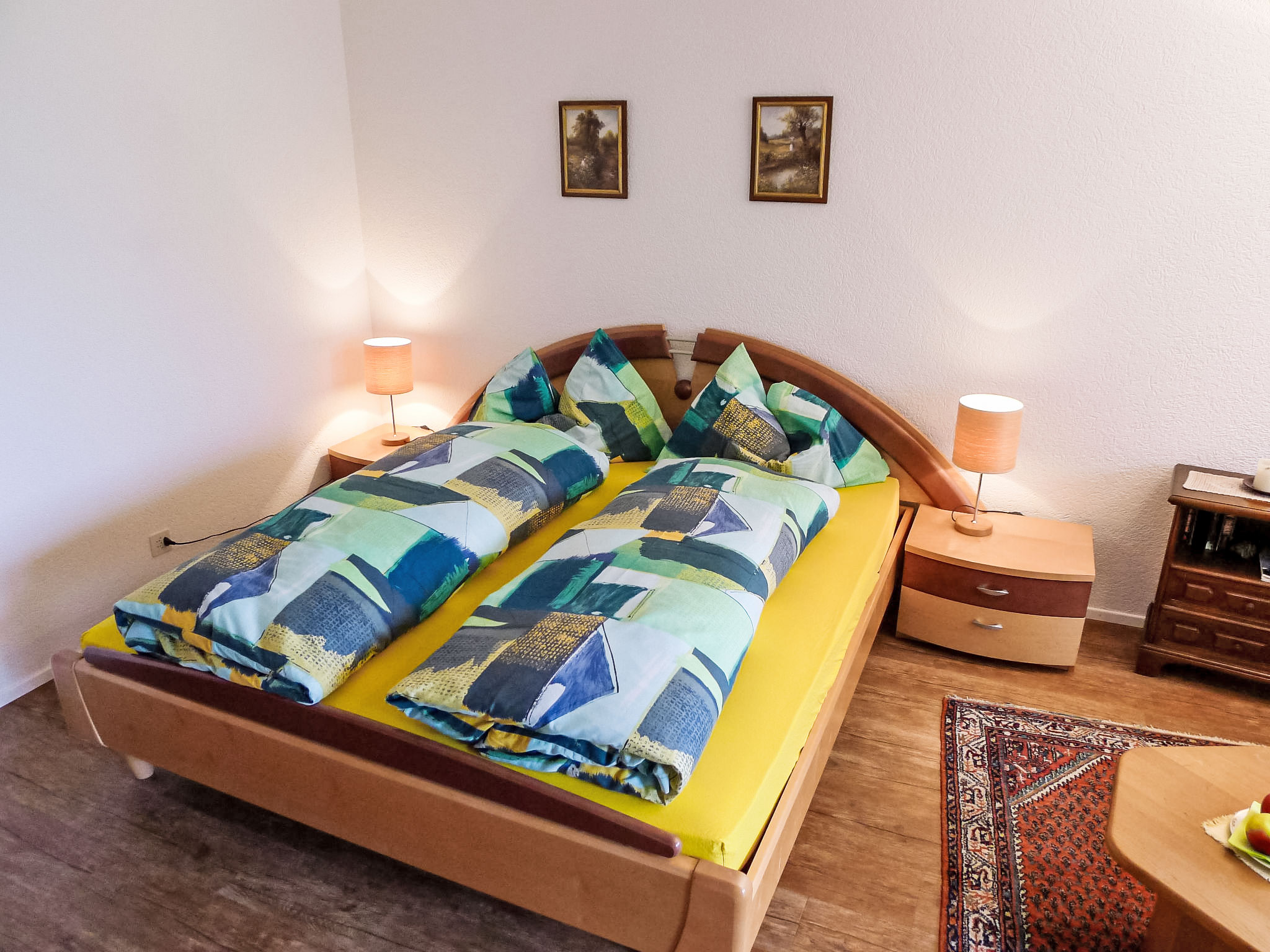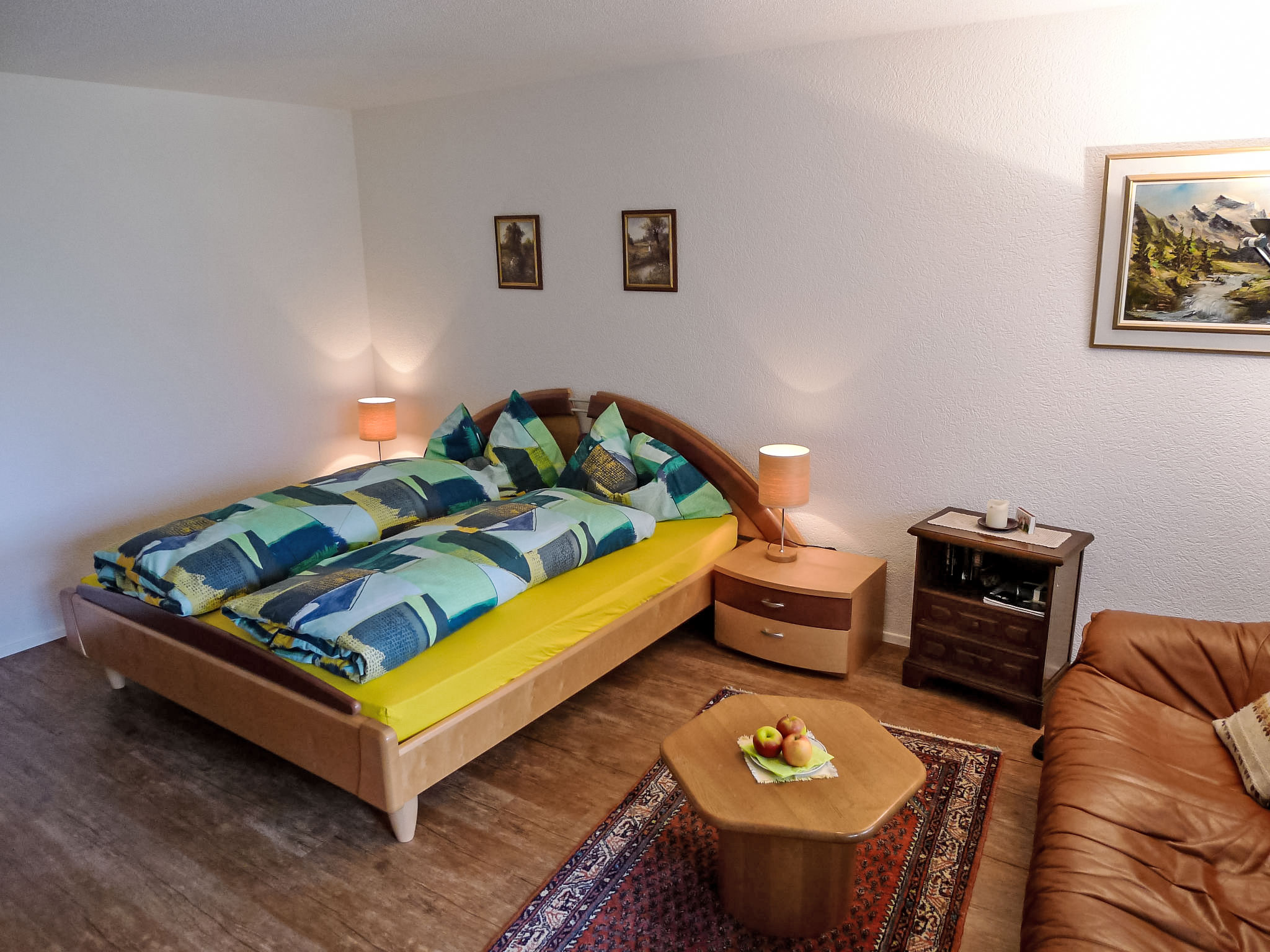 1-Zimmer-Studio 40 m2, im Erdgeschoss. Gemütlich eingerichtet: Wohn-/Schlafzimmer mit 1 franz. Bett (180 cm, Länge 200 cm), Kabel-TV (Flachbildschirm). Ausgang zum Garten, zum Gartensitzplatz, Richtung Süden. Offene Küche (3 Kochplatten, Backofen, elektrische Kaffeemaschine, Kapseln für die Kaffeemaschine (Delizio) extra). Dusche/WC. Gartensitzplatz. Terrassenmöbel, Liegestühle. Sehr schöne Sicht auf die Berge und die Ortschaft. Zur Verfügung: Haartrockner. Internet (WLAN, gratis). Bitte beachten: Nichtraucher-Unterkunft. Maximal 2 Haustiere/Hunde erlaubt. Zugang in diese Parterre Wohnung per Treppe, 2 Stöcke. Für gehbehinderte Menschen nicht geeignet.