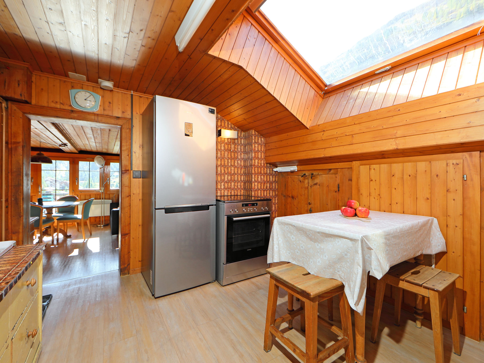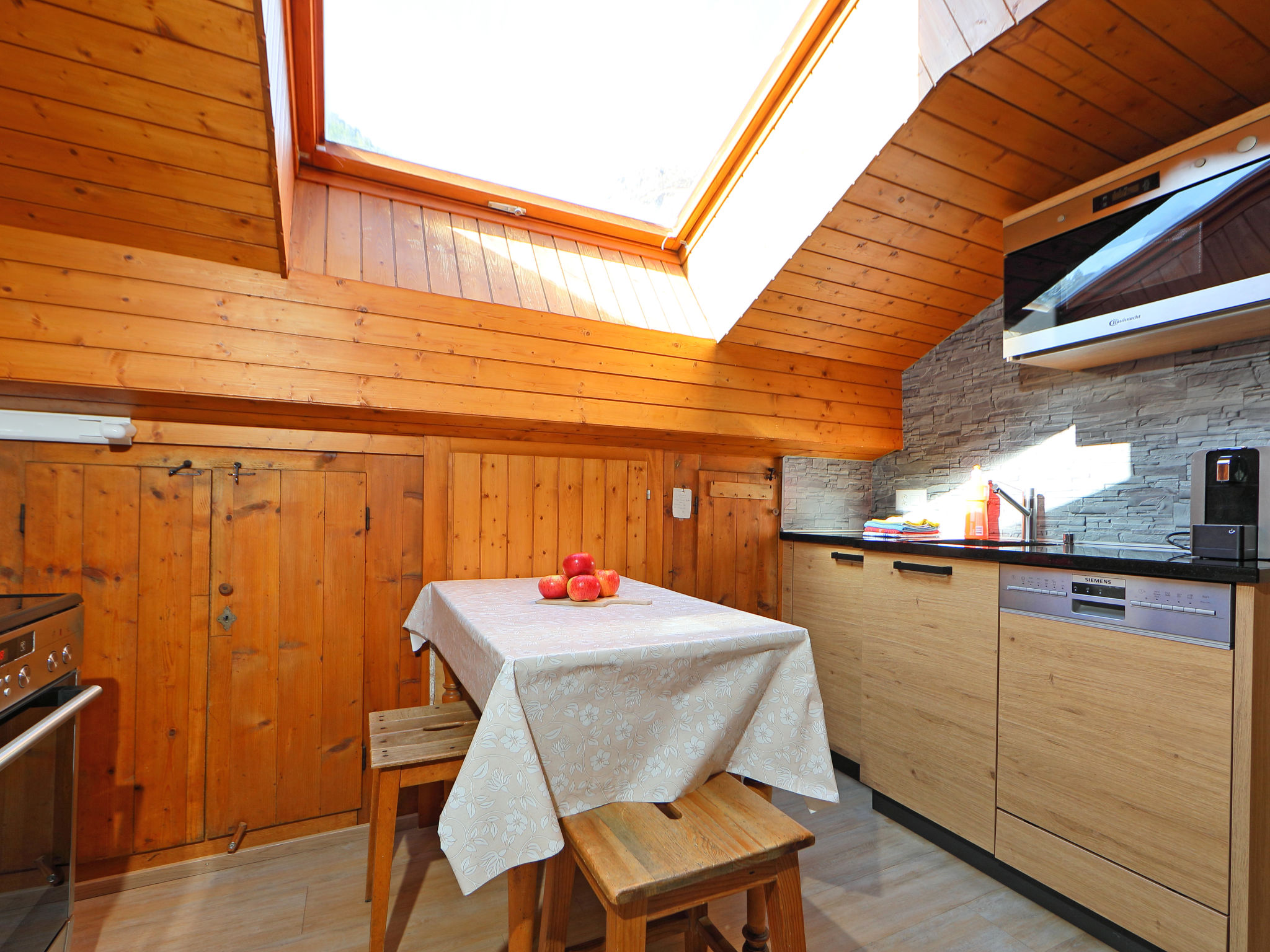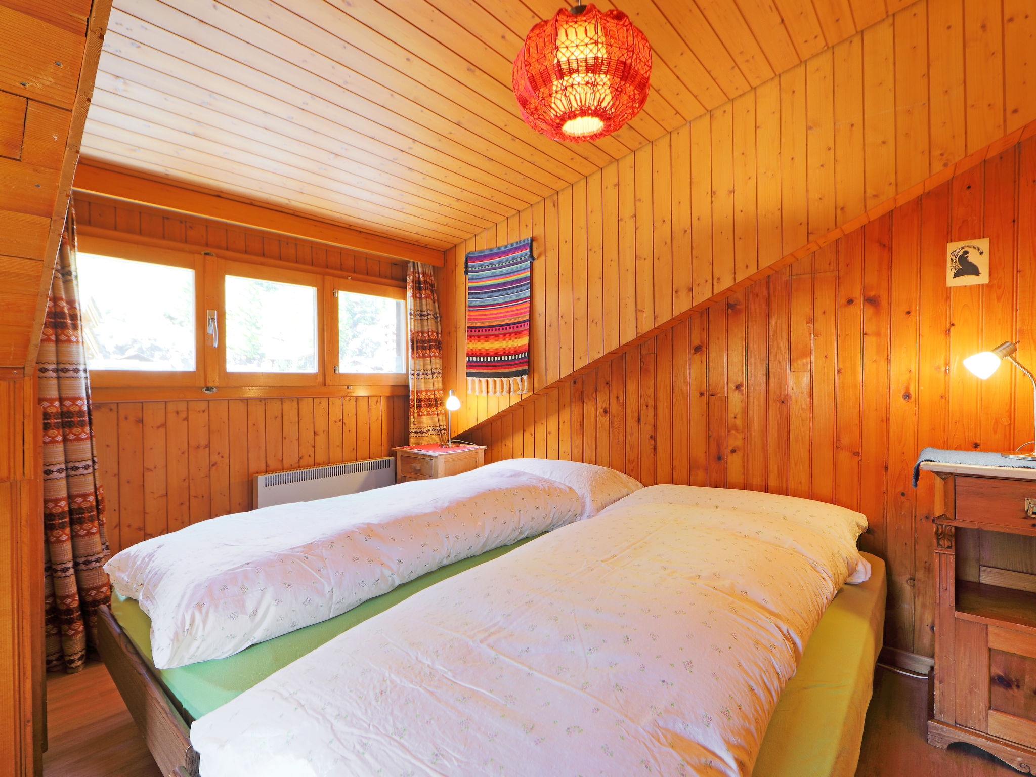3-Zimmer-Wohnung 65 m2, im Dachgeschoss. Teilweise abgeschrägt, sehr einfach eingerichtet: Wohn-/Esszimmer, Deckenhöhe 150 - 180 cm mit Esstisch, TV, Stereoanlage und DVD. Ausgang zum Balkon, Richtung Süden. 2 abgeschrägte kleine Doppelzimmer, jedes Zimmer mit 2 Betten (90 cm, Länge 200 cm). Küche (3 Kochplatten, Backofen, Toaster, Wasserkocher, Tiefkühler, elektrische Kaffeemaschine, Racletteofen, Fondue Set (Käse)) mit Esstisch. Dusche/WC. Balkon, Südlage. Balkonmöbel. Schöne Sicht auf Matterhorn. Zur Verfügung: Haartrockner. Internet (Wireless LAN, gratis). Bitte beachten: Nichtraucher-Unterkunft. WC ist neben der Wohnungstür auf dem privaten Stock (nicht in der Wohnung).