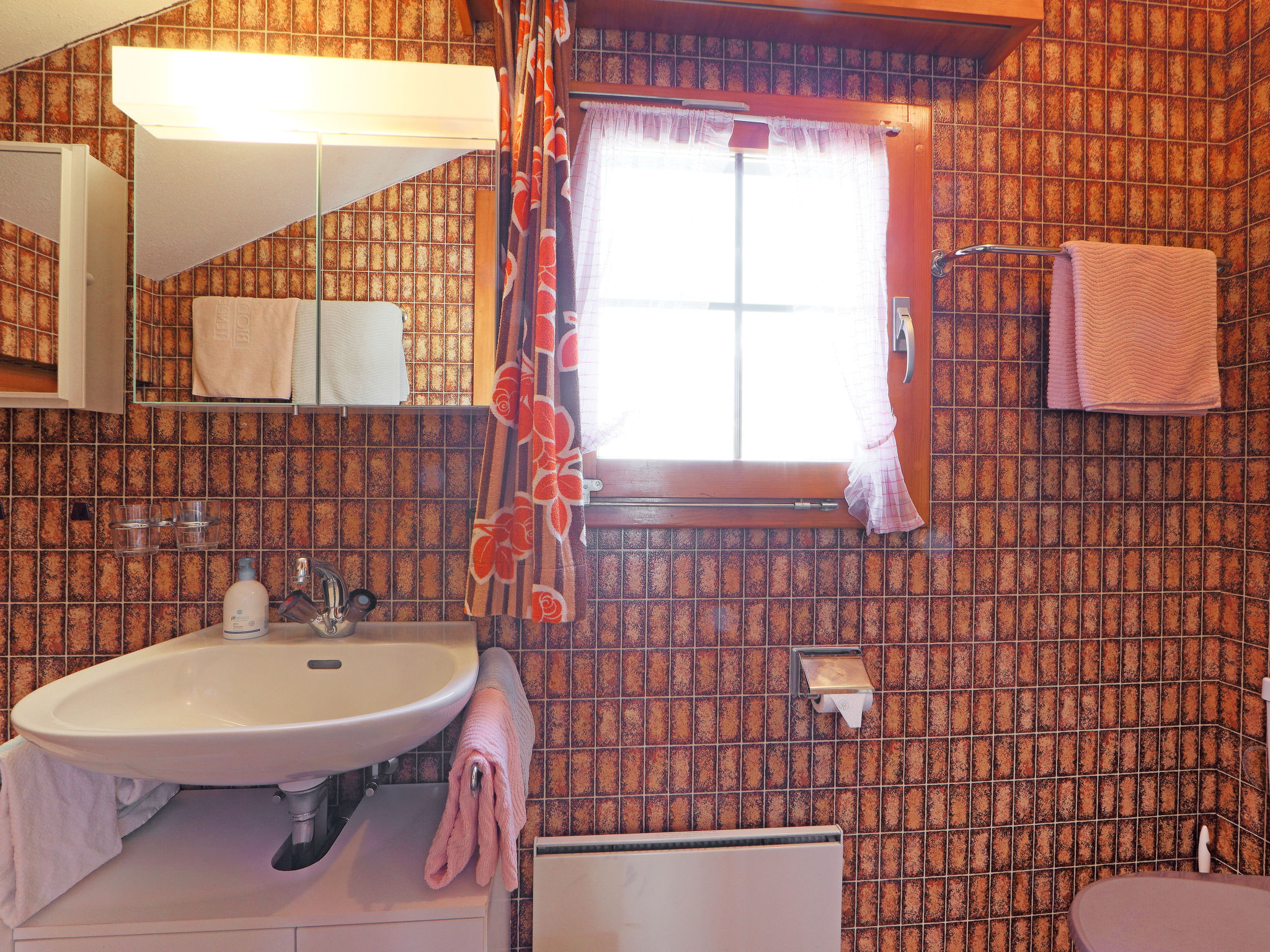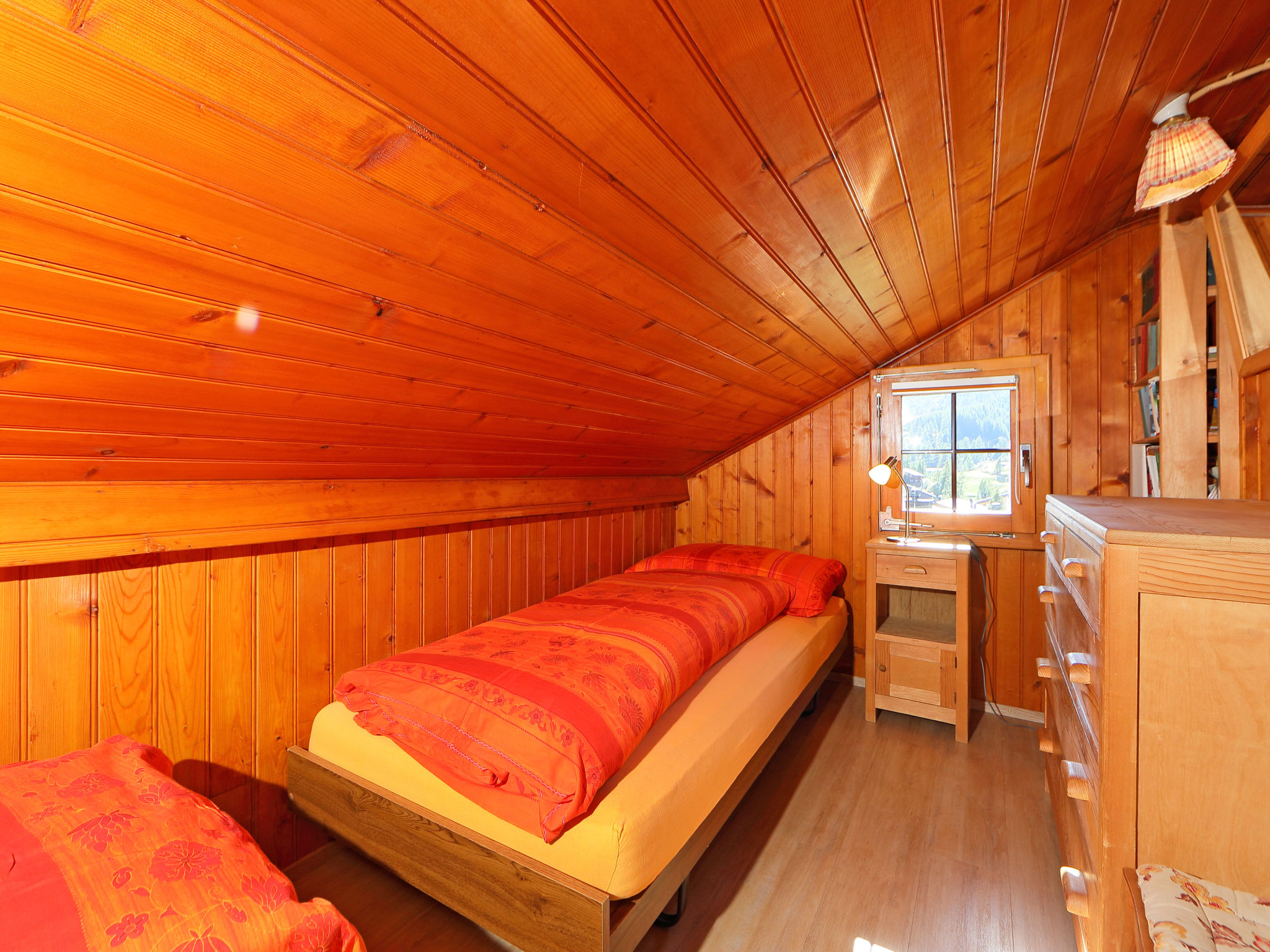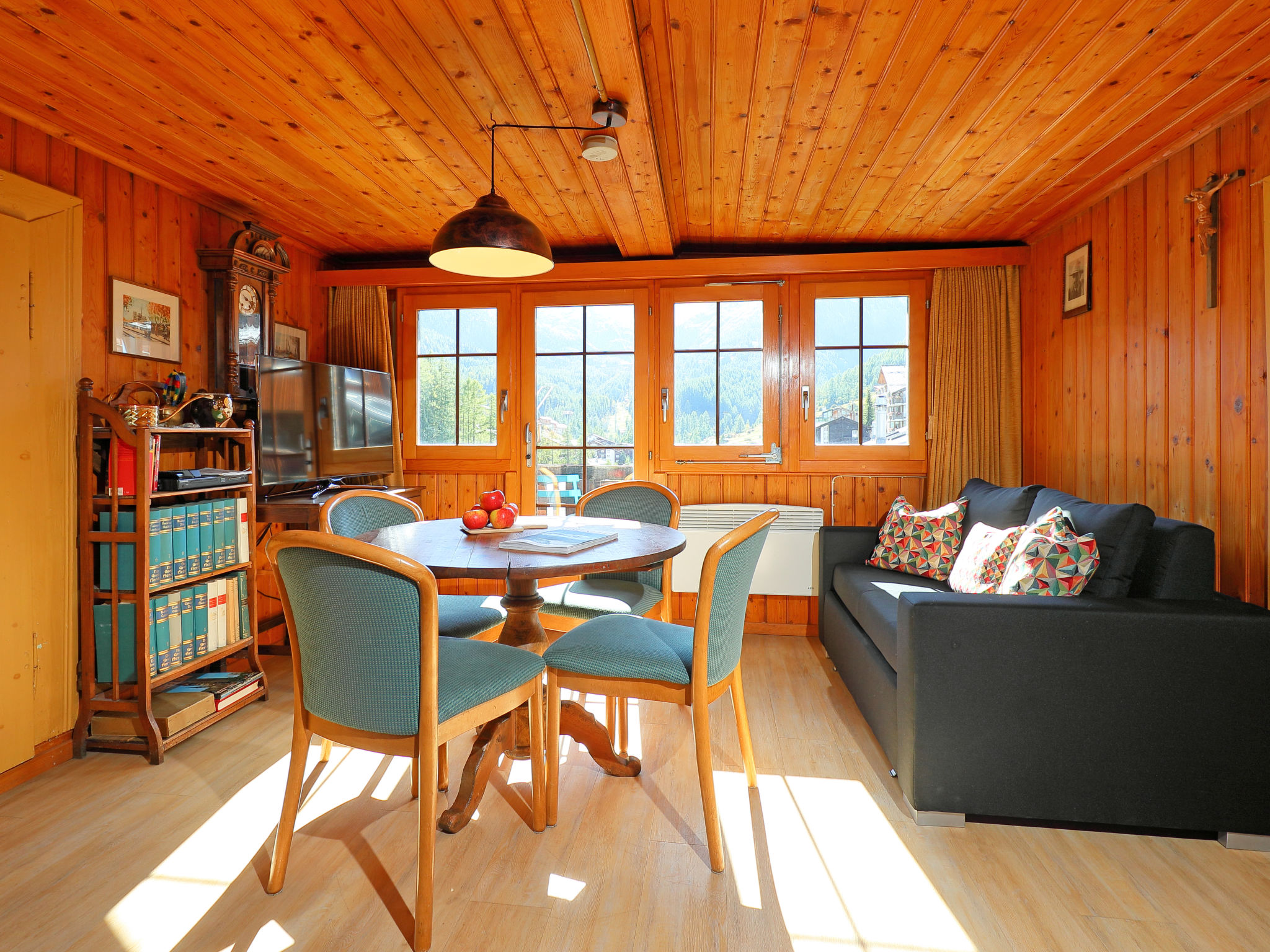 3-Zimmer-Wohnung 65 m2, im Dachgeschoss. Teilweise abgeschrägt, sehr einfach eingerichtet: Wohn-/Esszimmer, Deckenhöhe 150 - 180 cm mit Esstisch, TV, Stereoanlage und DVD. Ausgang zum Balkon, Richtung Süden. 2 abgeschrägte kleine Doppelzimmer, jedes Zimmer mit 2 Betten (90 cm, Länge 200 cm). Küche (3 Kochplatten, Backofen, Toaster, Wasserkocher, Tiefkühler, elektrische Kaffeemaschine, Racletteofen, Fondue Set (Käse)) mit Esstisch. Dusche/WC. Balkon, Südlage. Balkonmöbel. Schöne Sicht auf Matterhorn. Zur Verfügung: Haartrockner. Internet (Wireless LAN, gratis). Bitte beachten: Nichtraucher-Unterkunft. WC ist neben der Wohnungstür auf dem privaten Stock (nicht in der Wohnung).