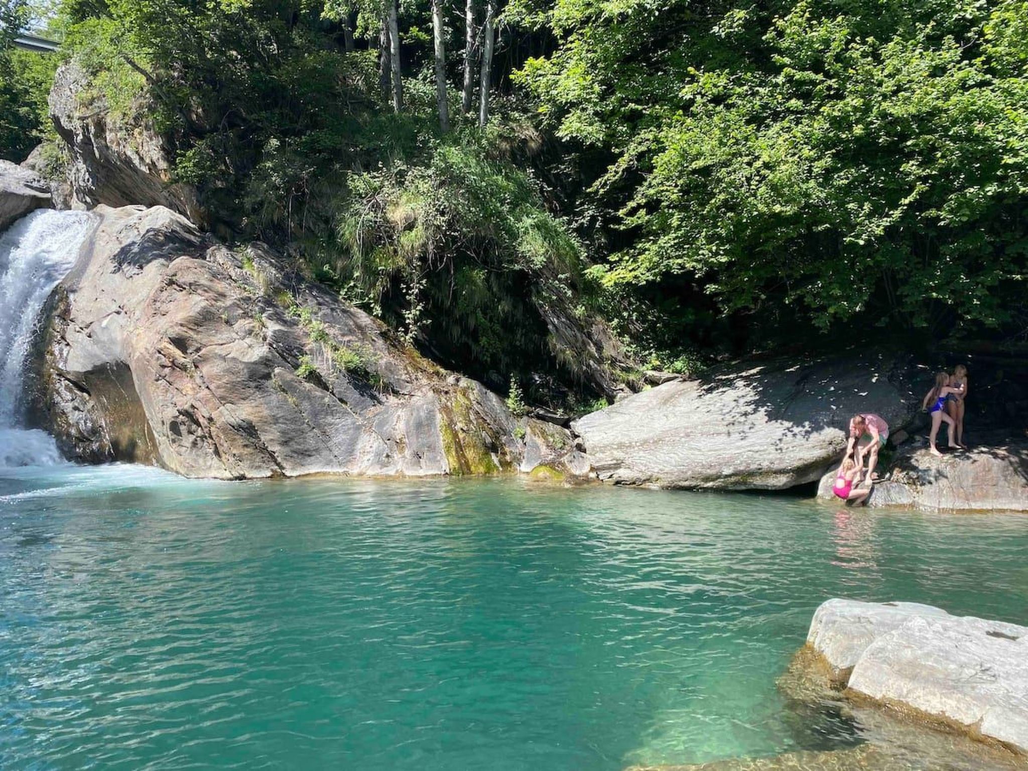 Direkt hinter dem Haus, nur fünf Gehminuten entfernt, befindet sich ein Wasserfall mit einem großen Naturbecken. Hier kann man schwimmen und springen, das Wasser ist kalt, aber an heissen Sommertagen genau die richtige Erfrischung. Oft badet man noch bis in den Oktober hinein.