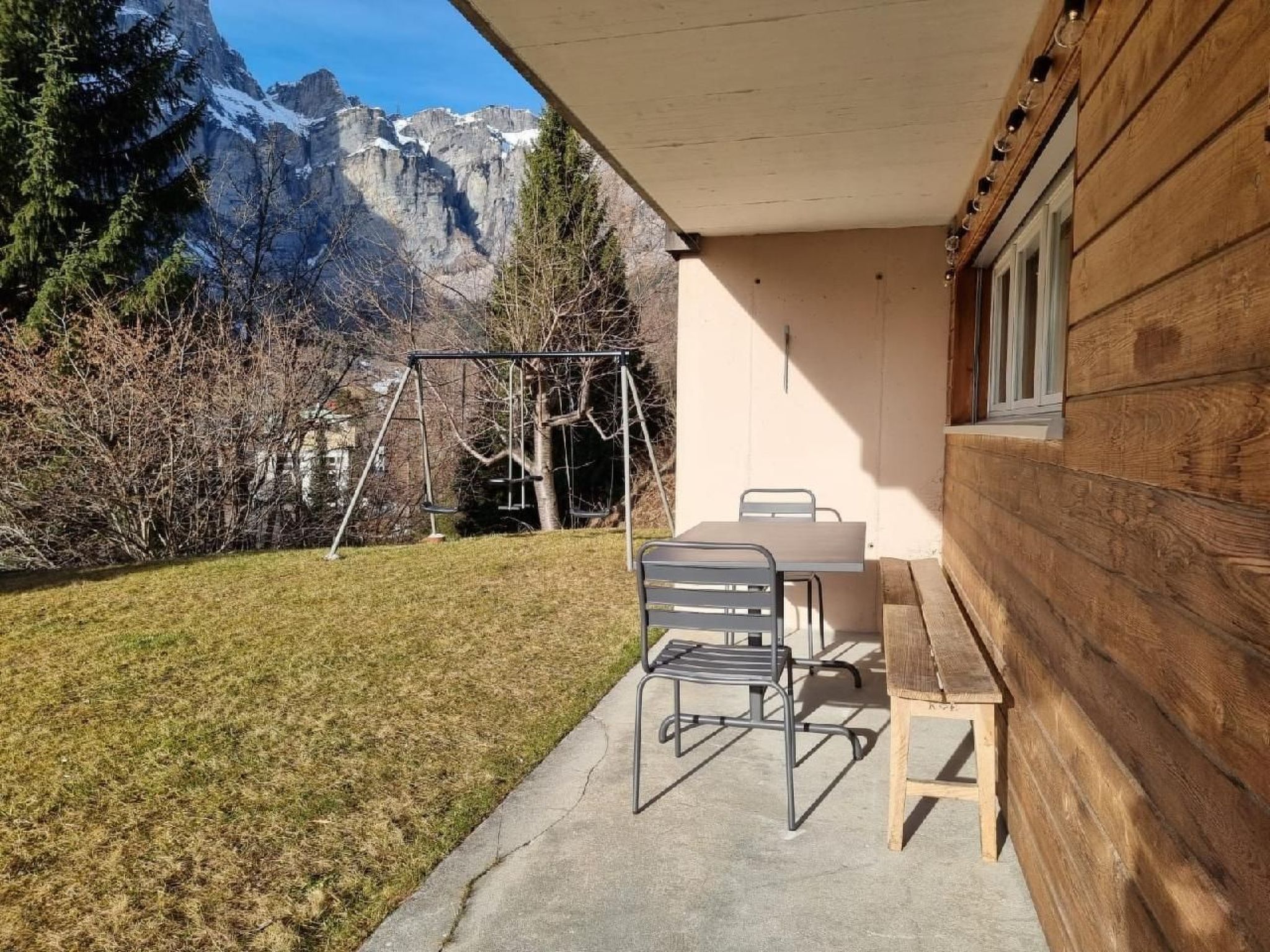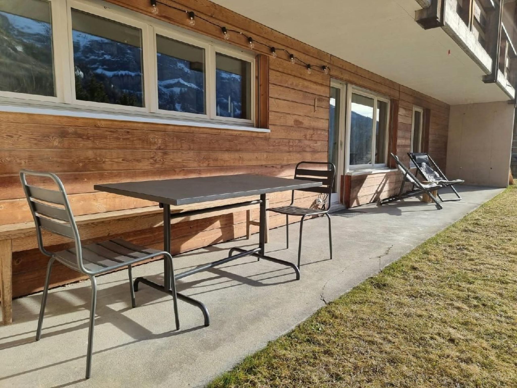 Der Außenbereich der Ferienwohnung ist ein wahres Highlight. Die großzügige Terrasse verspricht nicht nur Erholung und die Möglichkeit, Mahlzeiten im Freien zu genießen, sondern dient im Sommer auch als privater Spielplatz für Kinder. Somit bietet sich ausreichend Raum für Erholung und Familienzeit unter der Sonne von Leukerbad.