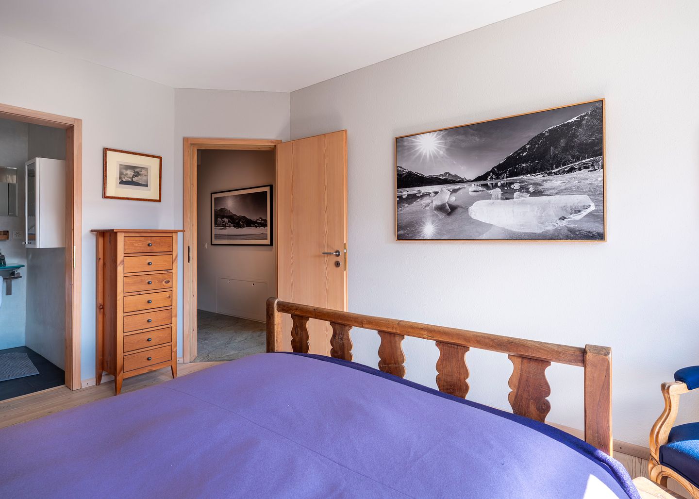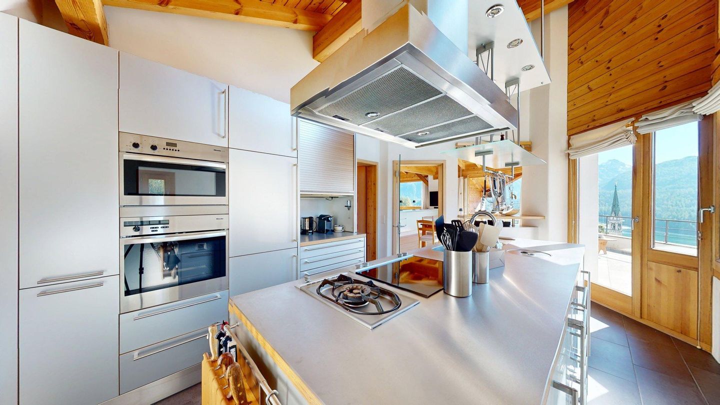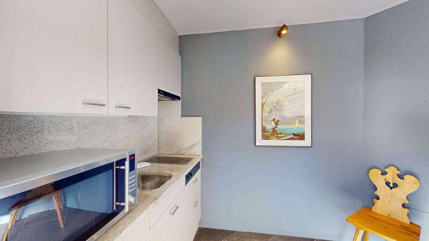Das grosszügige, lichtdurchflutete Wohn- und Esszimmer bietet einen atemberaubenden Ausblick auf die Engadiner Bergwelt und öffnet sich zu einem sonnigen Balkon – der perfekte Ort, um entspannte Stunden zu geniessen. Die geschlossene, modern ausgestattete Küche lädt zu kulinarischen Momenten ein und ist bestens ausgestattet.