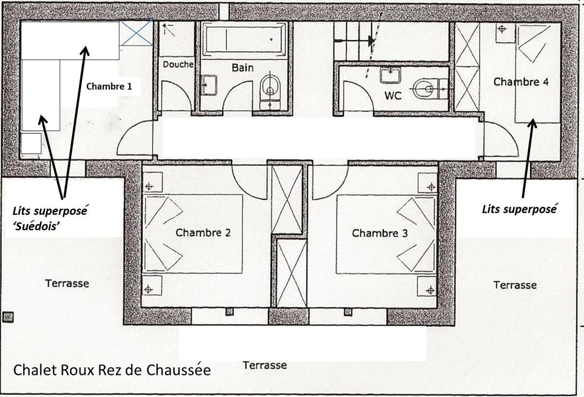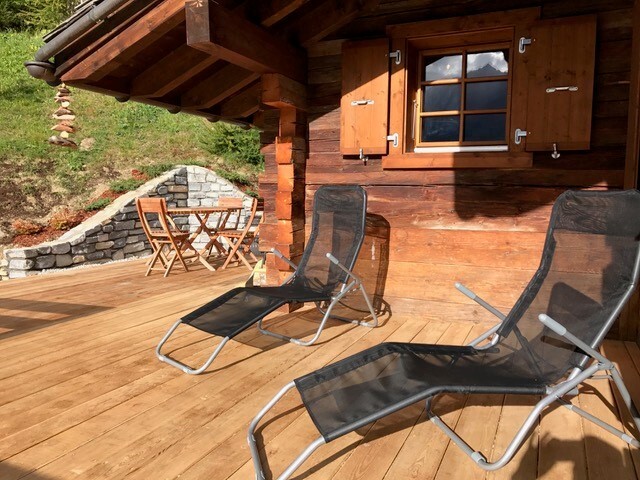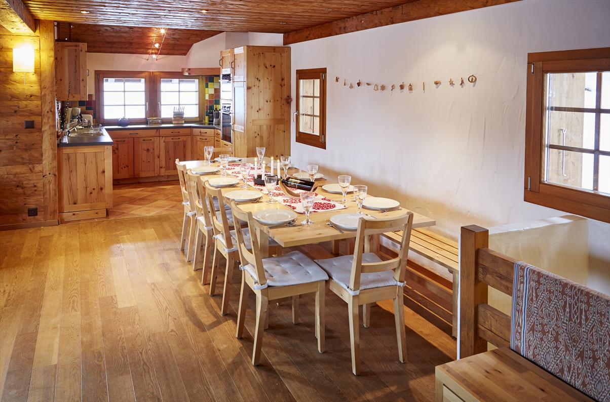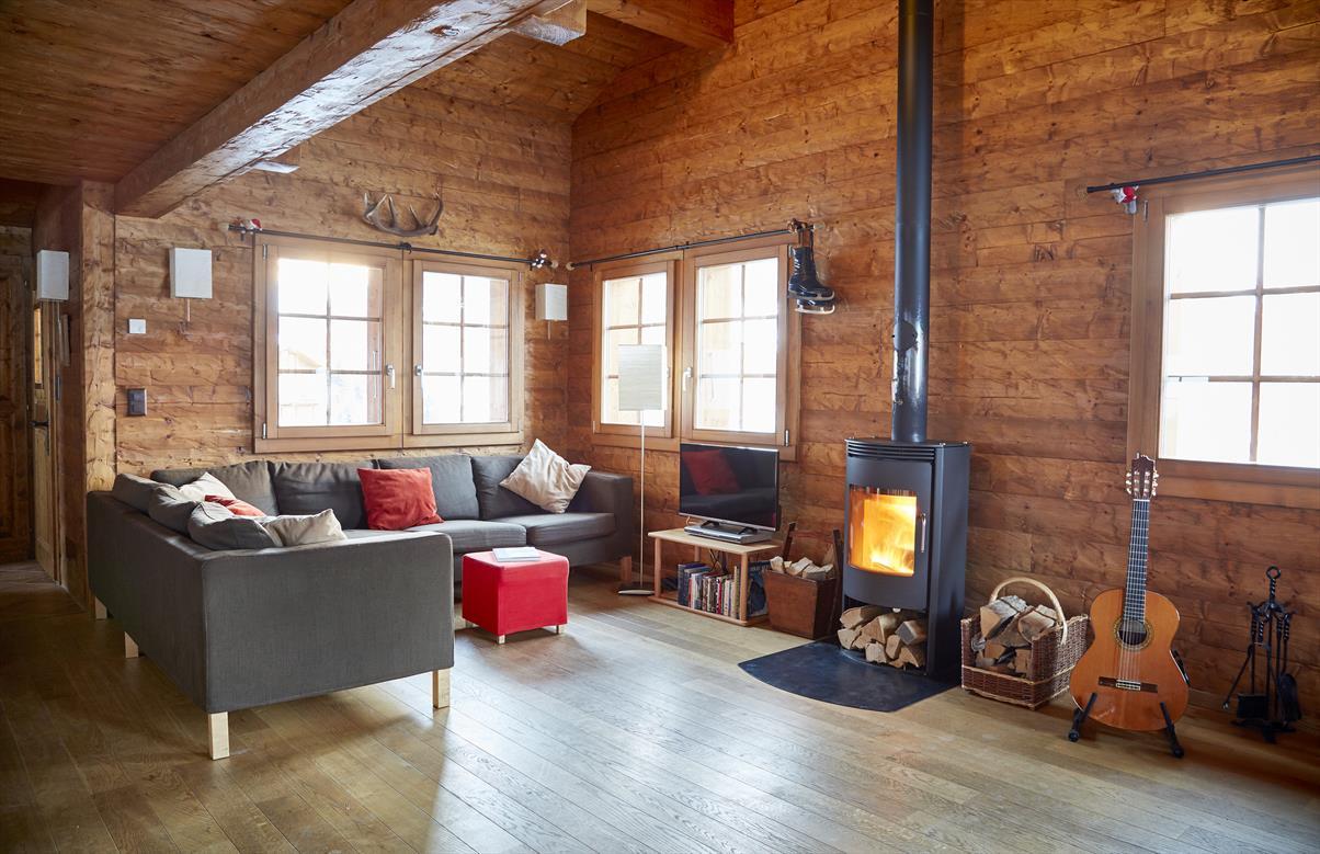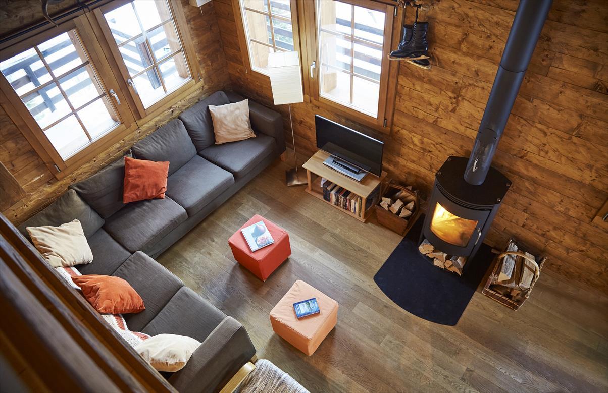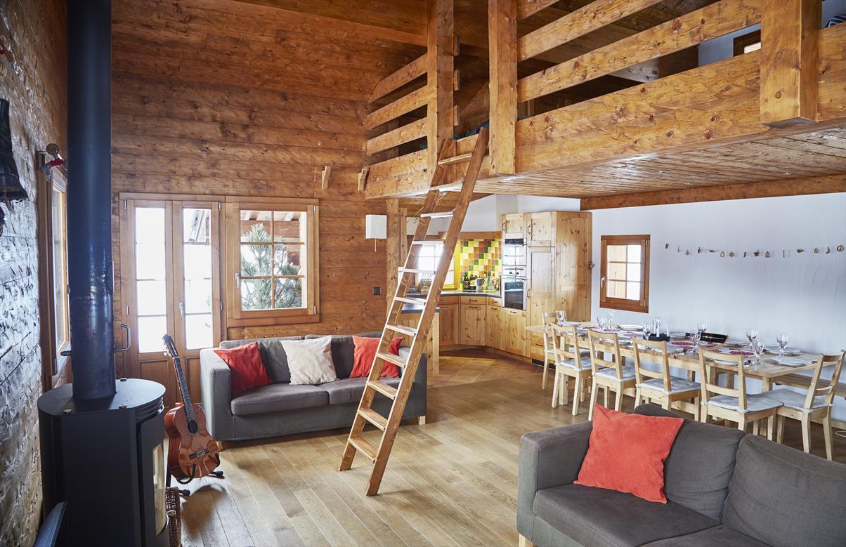 Chalet für 8 - 10 Personen : Wohnzimmer mit Schwedenofen - Küche mit Geschirrspüler und 2 Backofen (1 x Heissluft - 1 x klassisch) - Mezzanine über dem Wohnraum mit 2 Matratzen - 2 Zimmer mit je 1 Doppelbett (1.40 x 2.00) - 1 Zimer mit 2 Halb-Etagenbetten - 1 Zimmer mit 2 Etagenbetten - Dusche - Bad / WC - WC - Waschmaschine- Balkon und Terrasse Süd-West - 2 Aussenparkplätze - TV / DVD - kostenloser Internetzugang WIFI - Zugang über Weg - Tiere nicht erlaubt - Nichtraucher