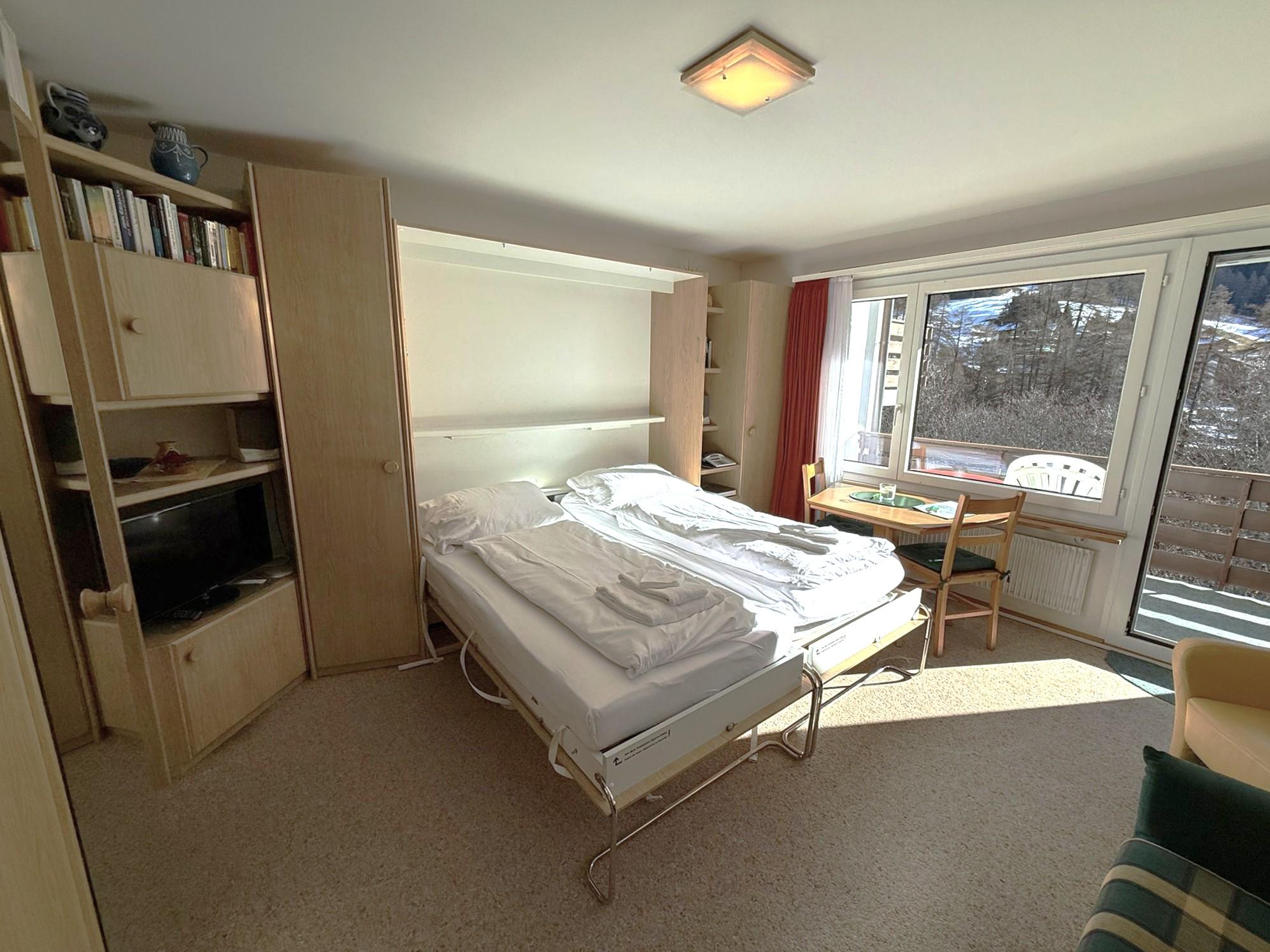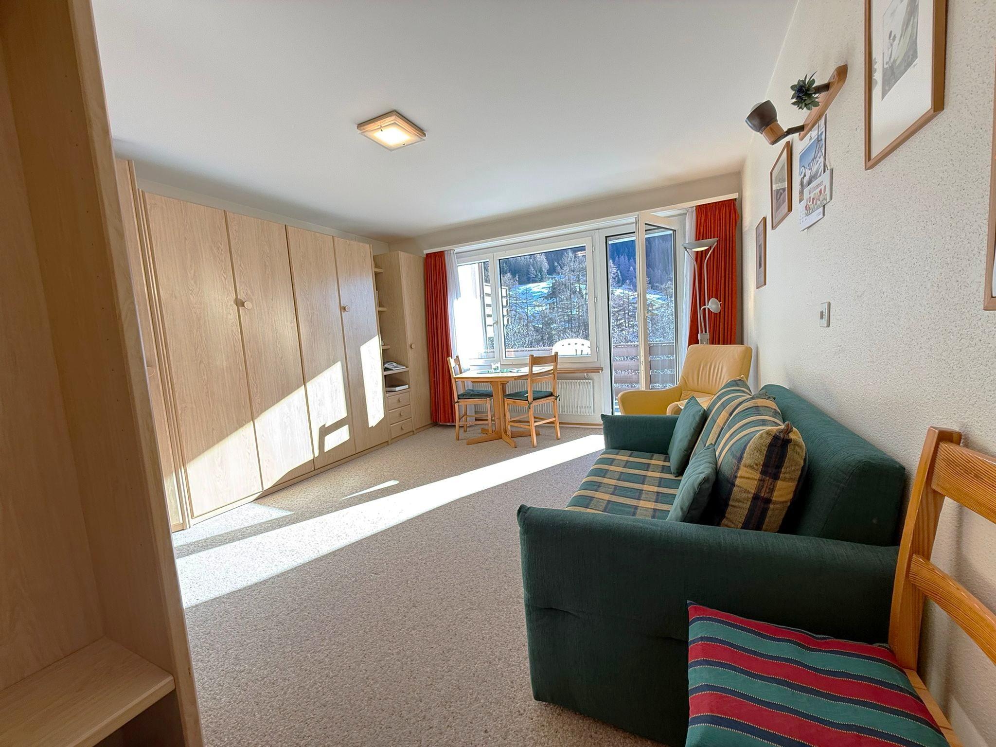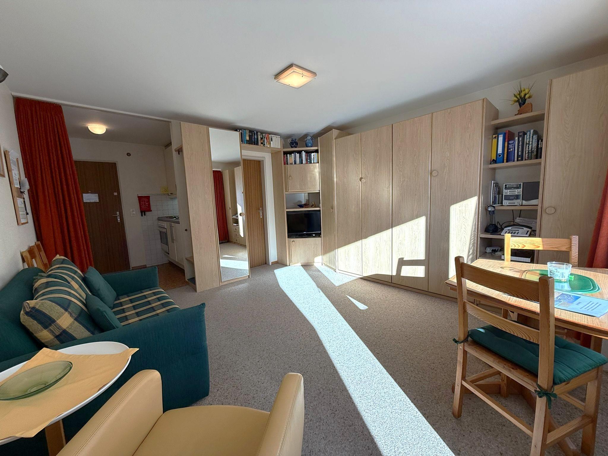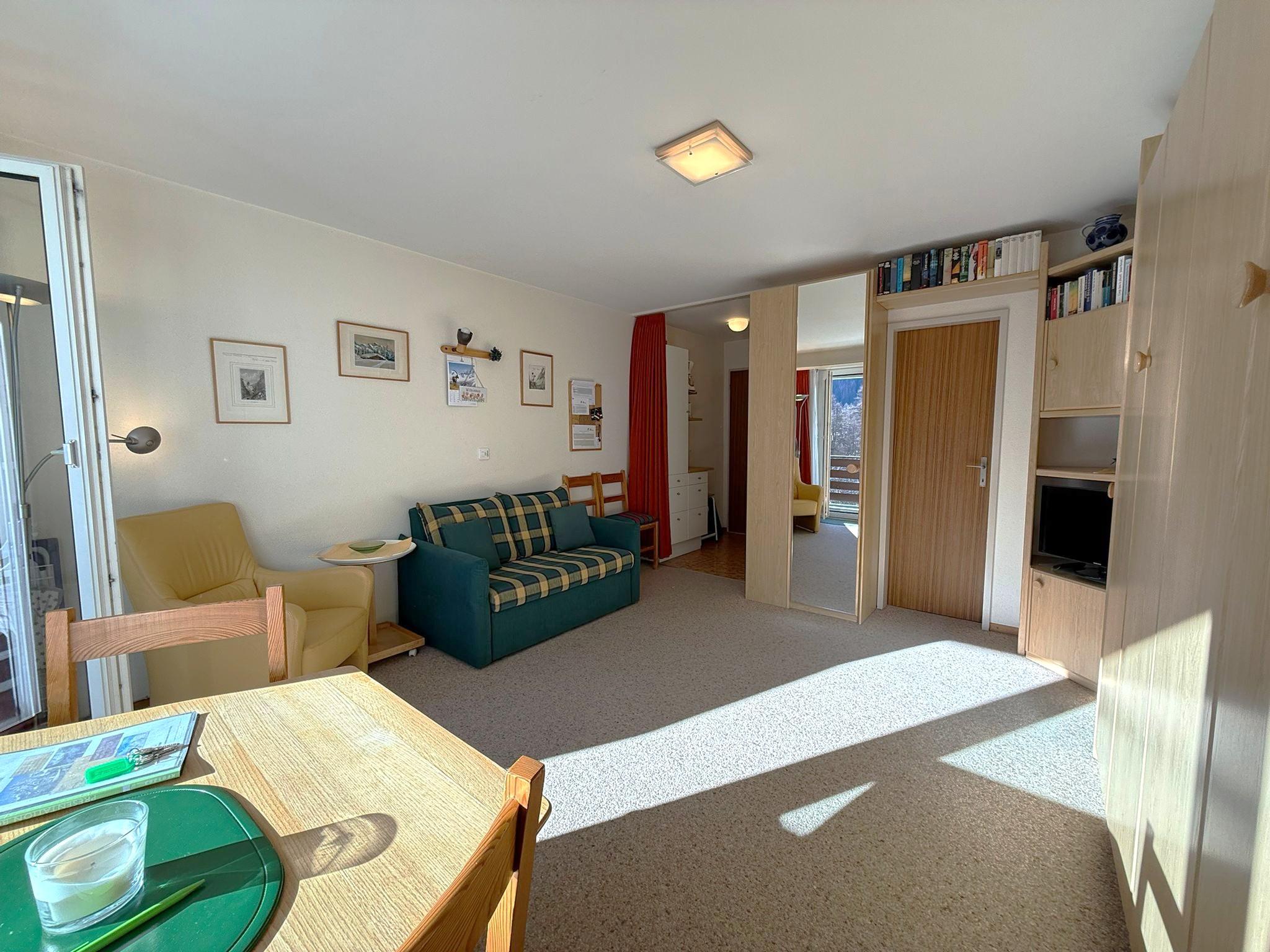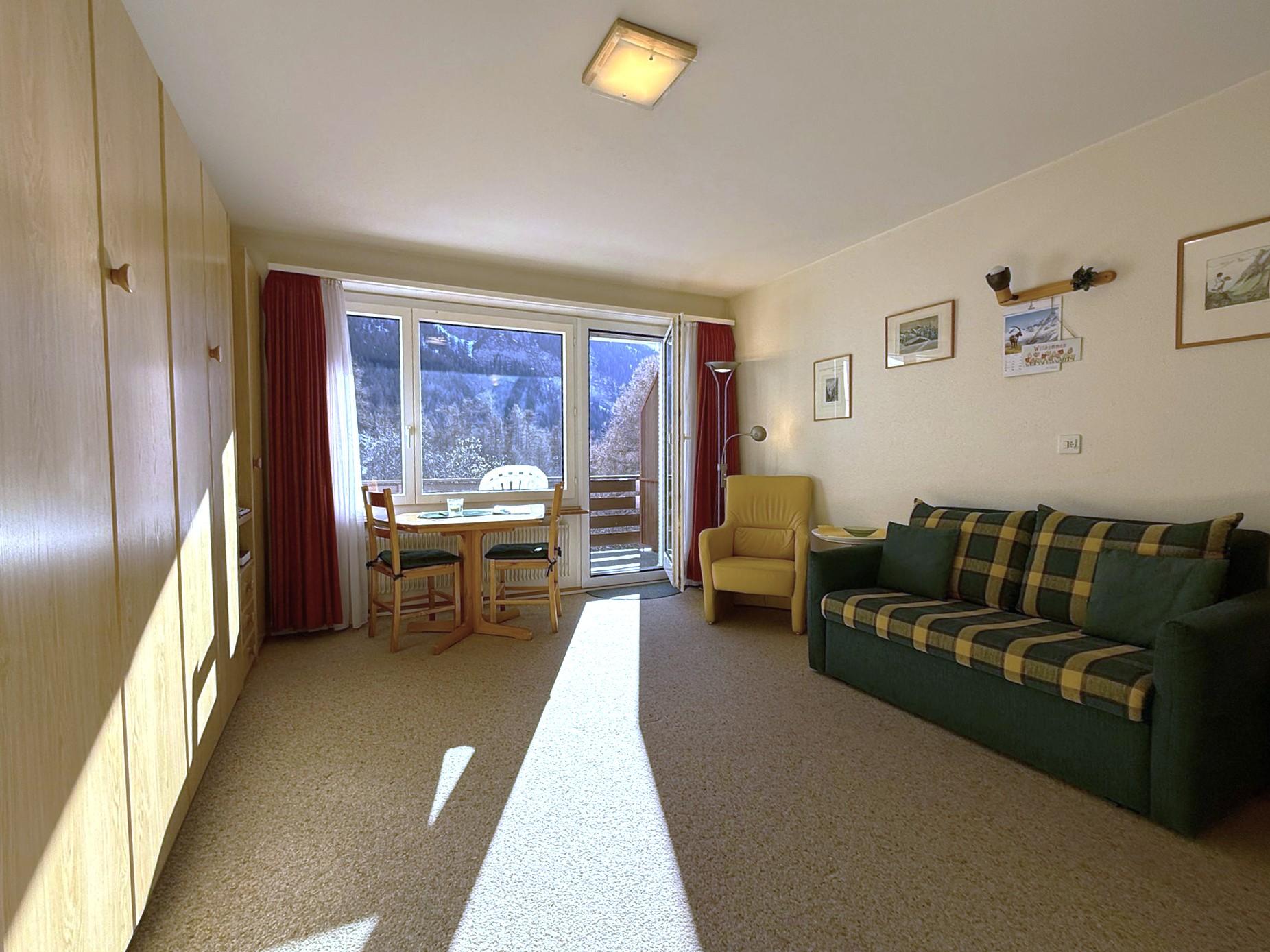 1-Zimmerwohnung: Wohn-/Esszimmer mit 2 Betten, Kochnische, Dusche/WC, Südbalkon mit schöner Aussicht, gratis W-Lan, Radio, TV, Telefon, Lift. Parkplatz inklusive.