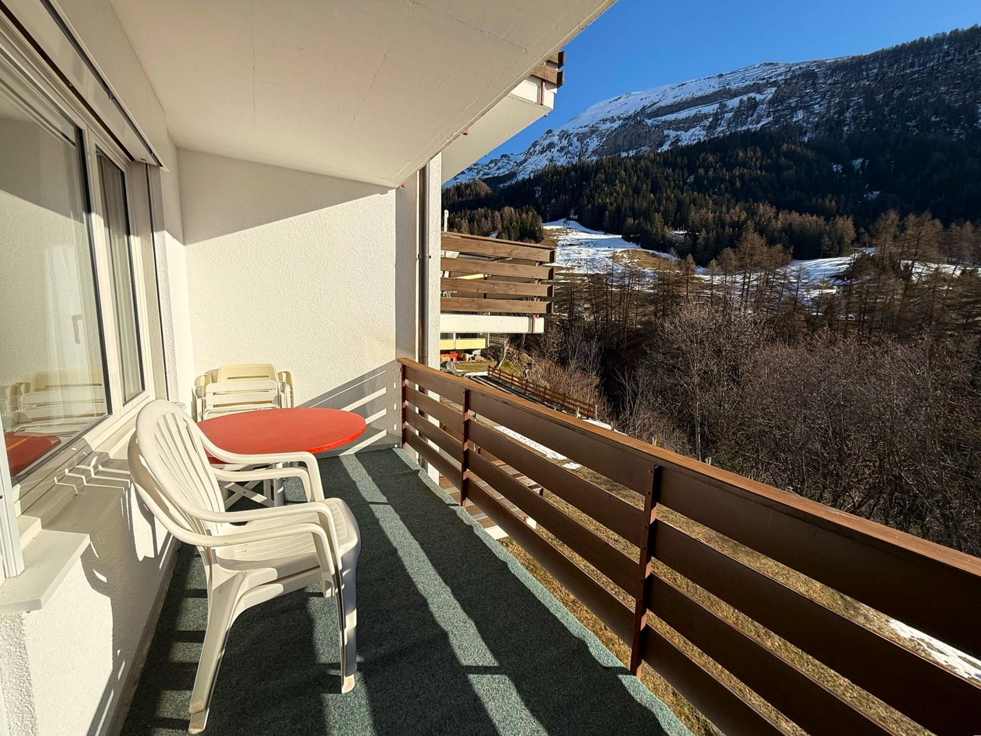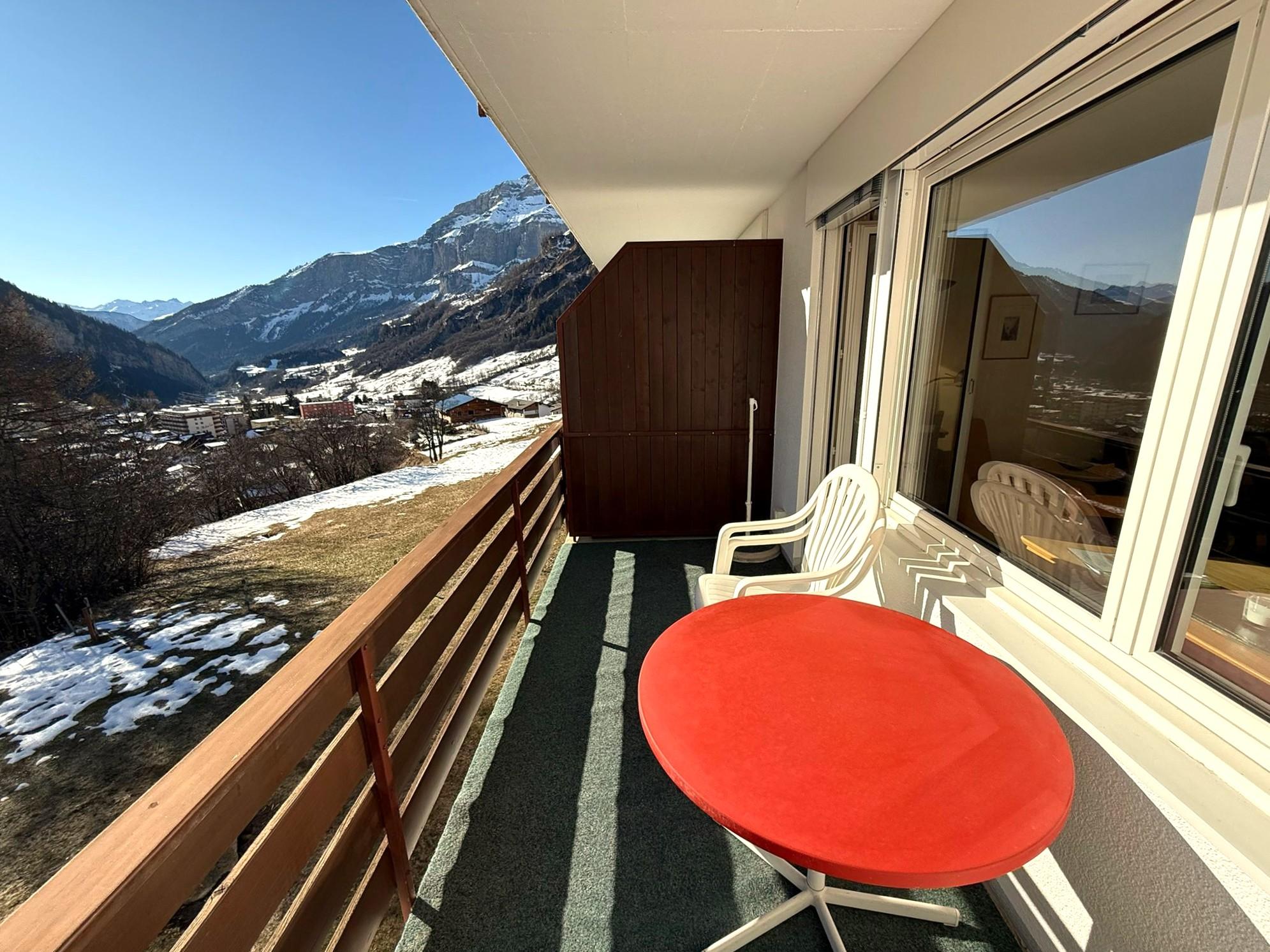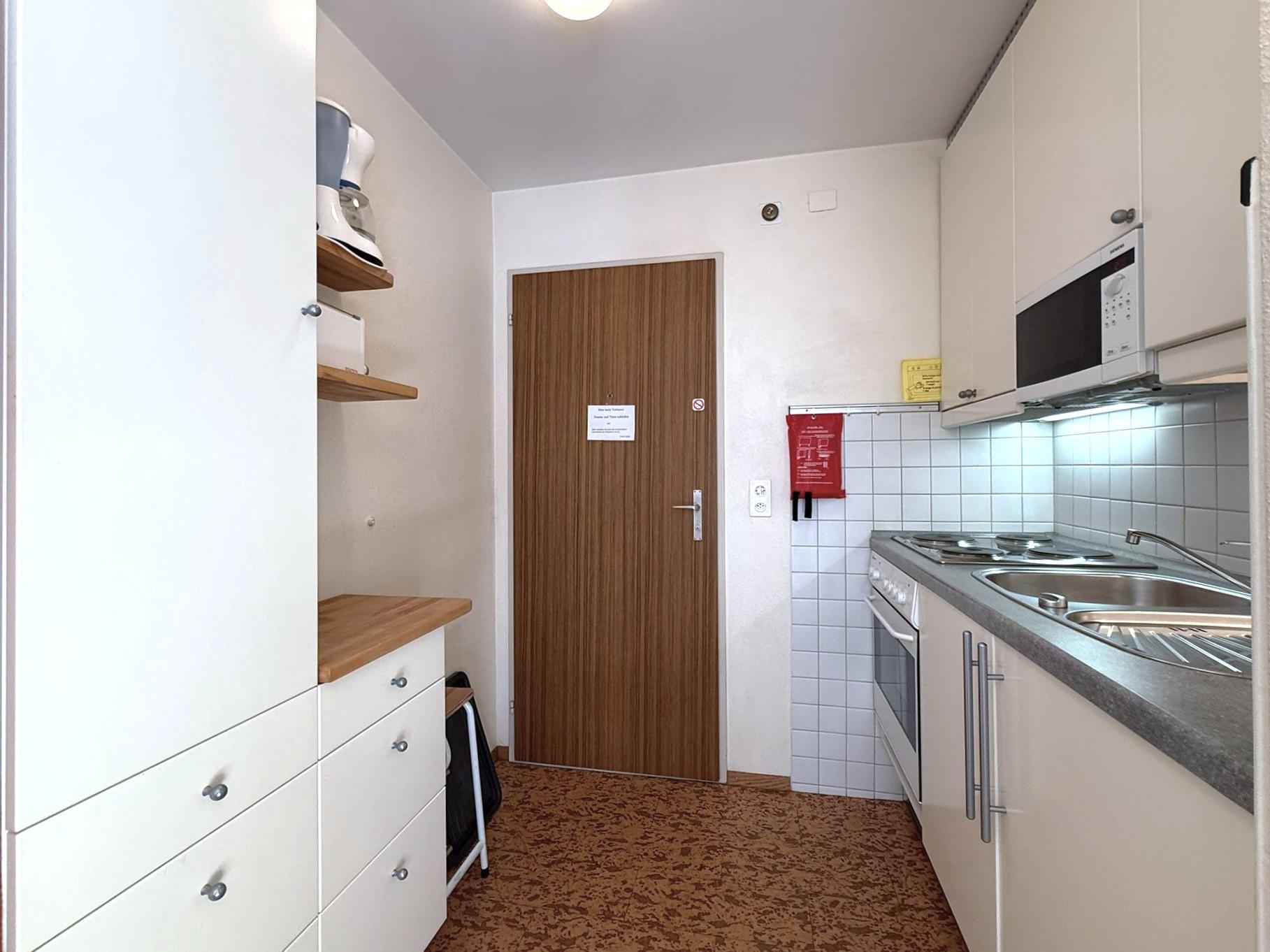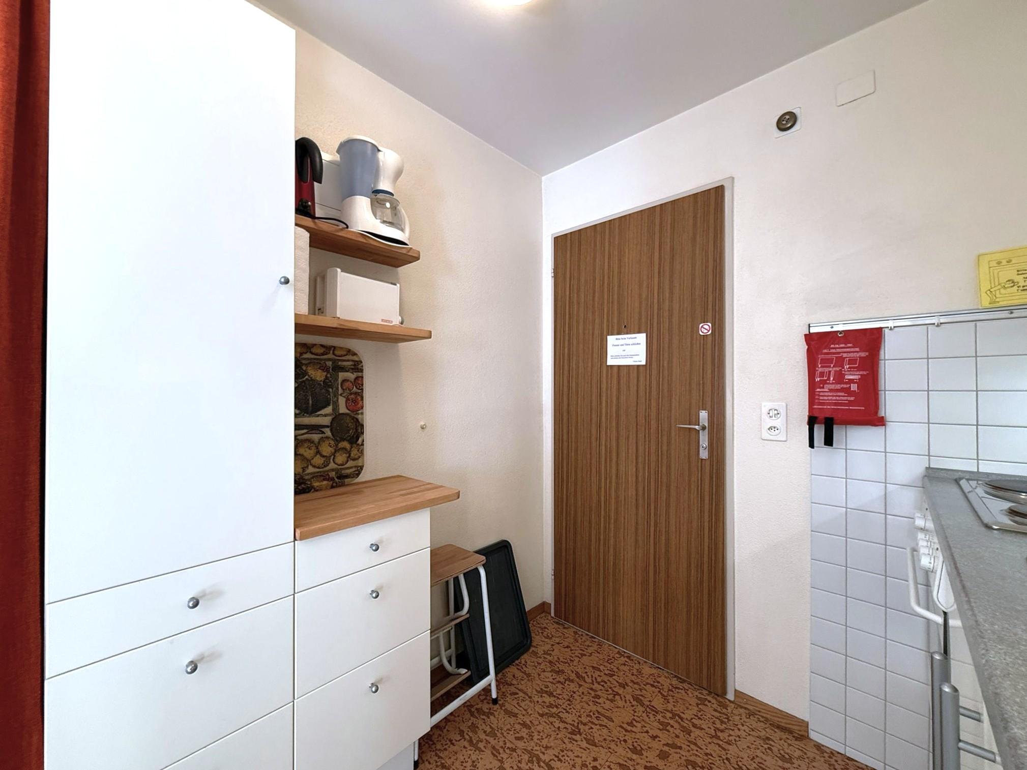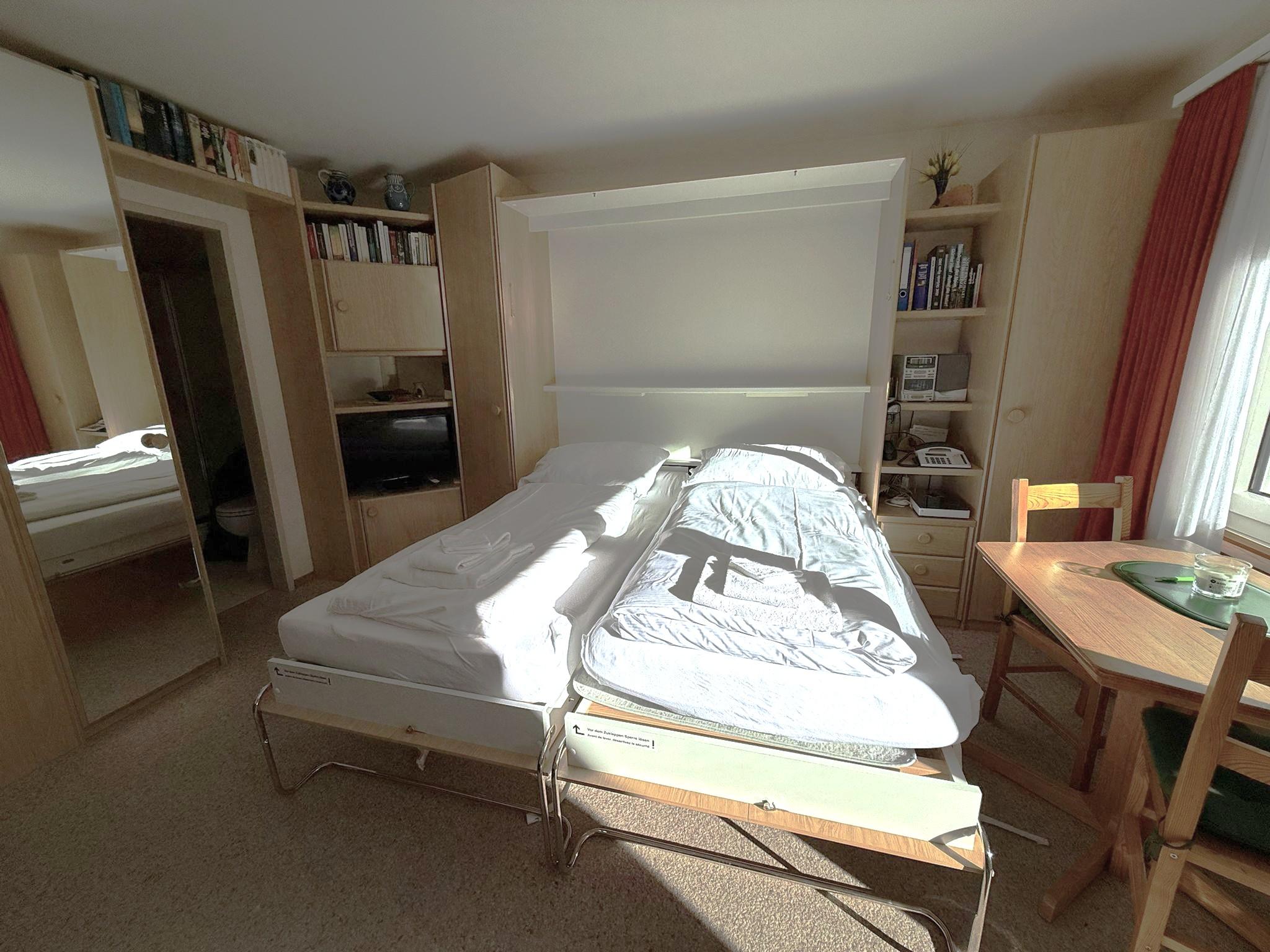 1-Zimmerwohnung: Wohn-/Esszimmer mit 2 Betten, Kochnische, Dusche/WC, Südbalkon mit schöner Aussicht, gratis W-Lan, Radio, TV, Telefon, Lift. Parkplatz inklusive.