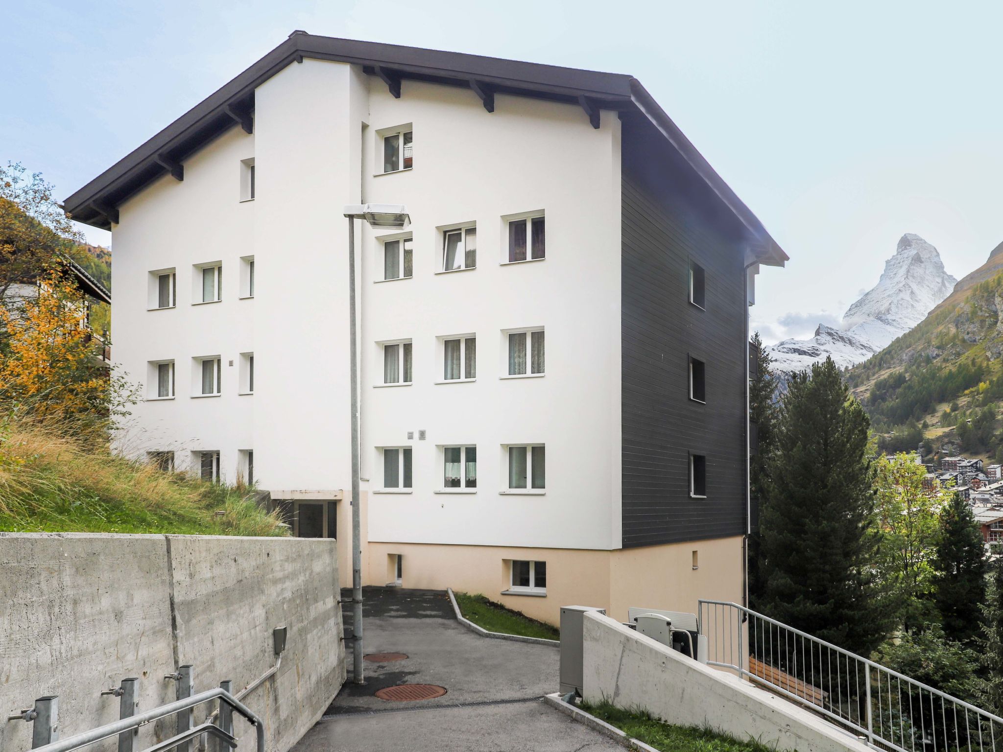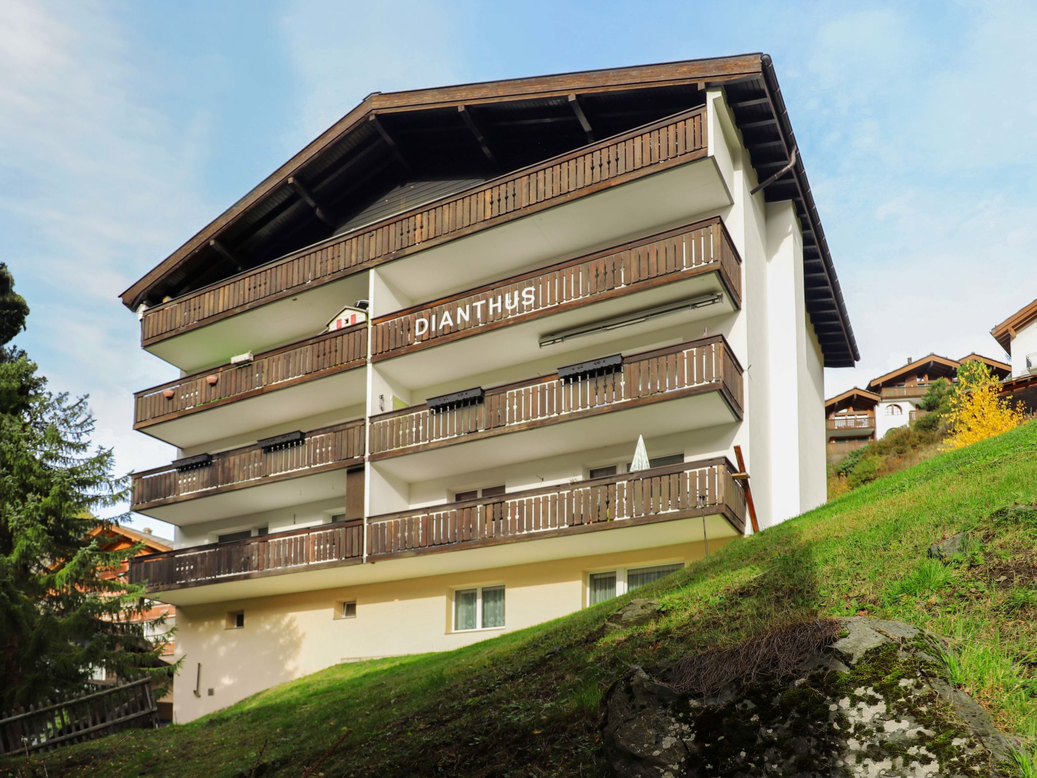 Grosses Mehrfamilienhaus "Dianthus", auf 5 Stockwerken. Im Ortsteil Wiesti, 650 m vom Zentrum von Zermatt, ruhige, sonnige, erhöhte Lage am Hang. Im Hause: Skiraum, Zentralheizung. Zufahrt bis 150 m zum Haus. 100 m Treppenweg (52 Stufen) bis zum Haus. Supermarkt 450 m, Restaurant 550 m, Bäckerei 650 m, Zentrum zu Fuss in 20 Minuten erreichbar, Bushaltestelle "Spiss" 150 m, Bahnstation "Bahnhof Zermatt" 650 m. Bergeisenbahn 650 m, Skiverleih 650 m, Skibushaltestelle 150 m, Skischule 1 km, Kinderskischule 1 km. Bitte beachten: kein Fahrstuhl vorhanden. Taxi kann nicht bis zum Haus fahren. Die Schlüsselübergabe findet bei der Agentur Interhome in Zermatt statt.