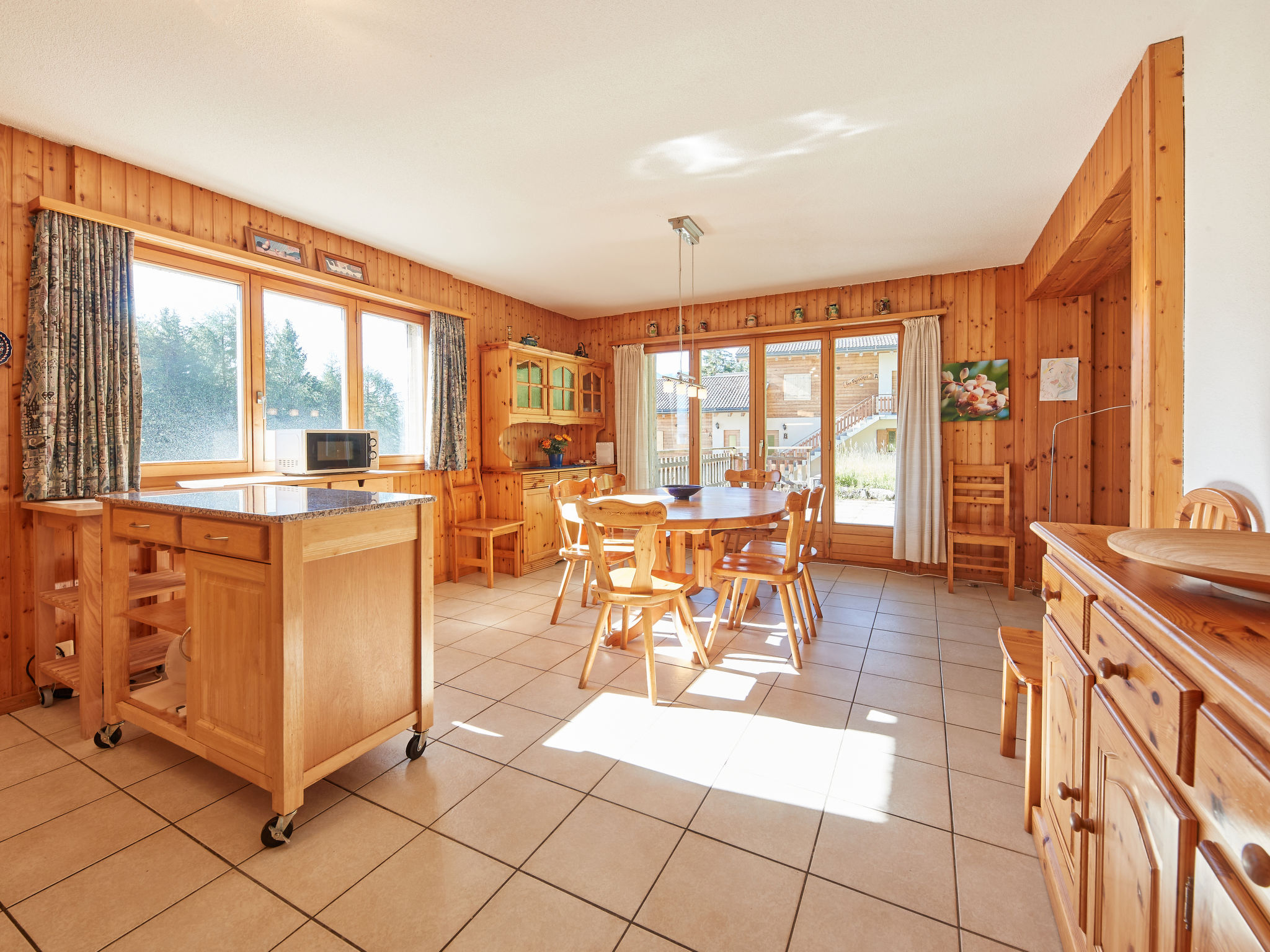 "Grand Vue", 5-Zimmer-Wohnung 105 m2, im Erdgeschoss. Wohn-/Esszimmer mit TV. Ausgang zur Terrasse, Richtung Süden. 1 Zimmer mit 1 Doppelbett (140 cm, Länge 190 cm). 1 Zimmer mit 1 x 2 Etagenbetten (90 cm, Länge 190 cm). 1 Zimmer mit 1 Doppelbett (160 cm, Länge 190 cm) mit 2 x 2 Etagenbetten (90 cm, Länge 200 cm). Offene Küche (4 Kochplatten, Backofen, Geschirrspüler, Toaster, Wasserkocher, Mikrowelle, elektrische Kaffeemaschine, Kapseln für die Kaffeemaschine (Nespresso), Racletteofen, Fondue Set (Chinoise, Käse)). 2 Duschen/WC. Balkon, Ostlage, Terrasse, Südlage. Terrassenmöbel, Balkonmöbel. Zur Verfügung: Internet (WLAN, gratis). Garage. Bitte beachten: Nichtraucher-Unterkunft.
